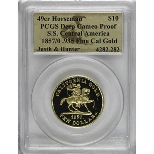 <B>Baldwin & Co. $10 'Restrike' Deep Cameo Proof PCGS.</B></I> Exemplary contrast and seamless mirrored fields confirm the quality of this interesting relic medal. Struck in 2002 from a Justh & Hunter ingot retrieved from the 1857 <I>S.S. Central America</B></I> shipwreck. Since no coin designs are known for assayers Justh & Hunter, the famous 1850 Baldwin & Co. Vaquero motifs were used instead.<BR><BR><b>Shipping:</b> Coins & Currency (<a target="_blank" href="http://www.heritageauctions.com/common/shipping.php">view shipping information</a>)