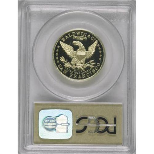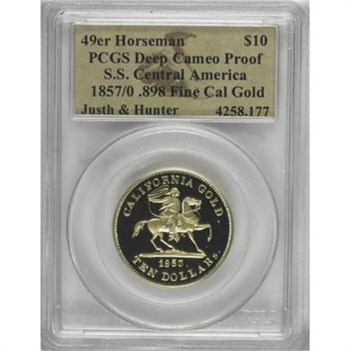 <B>Baldwin & Co. $10 'Restrike' Deep Cameo Proof PCGS.</B></I> Serial #177. The famous 1850 Baldwin 'Horseman' Territorial ten dollar issue serves as the design inspiration for this 2002 restrike. An immaculate example with unimprovable cameo contrast. Dated 1857/O on the obverse, and 2002 on the reverse. The source bullion came from a Justh & Hunter ingot recovered from the S.S. Central America shipwreck. Counterstamped JUSTH & HUNTER/4258 on the reverse. The certificate of authenticity and presentation box of issue are included with the lot.<BR><BR><b>Shipping:</b> Coins & Currency (<a target="_blank" href="http://www.heritageauctions.com/common/shipping.php">view shipping information</a>)