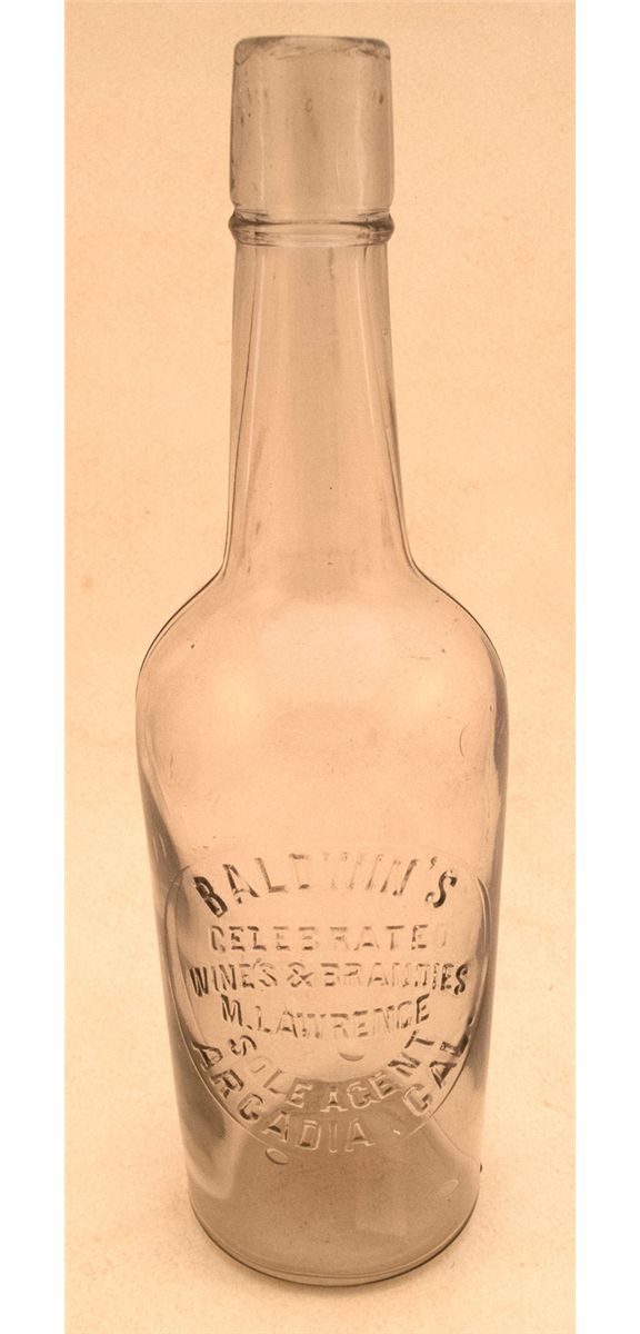 Fabulous Southern California bottle. Baldwin is none other than Lucky Baldwin. Fred's great grandfather worked for the Southern Pacific Railroad and purchased property from Lucky Baldwin once - after he got Lucky good and drunk! BALDWIN'S / CELEBRATED / WINES & BRANDIES / LAWRENCE & COMSTOCK / SOLE AGENTS / ARCADIA, CAL. 11", clear, cylinder fifth, 1895-1903.