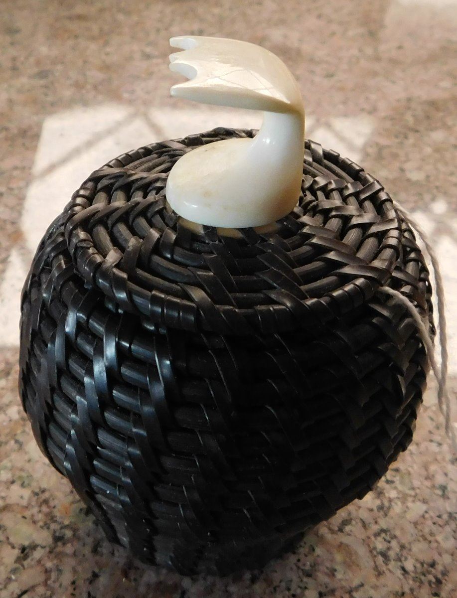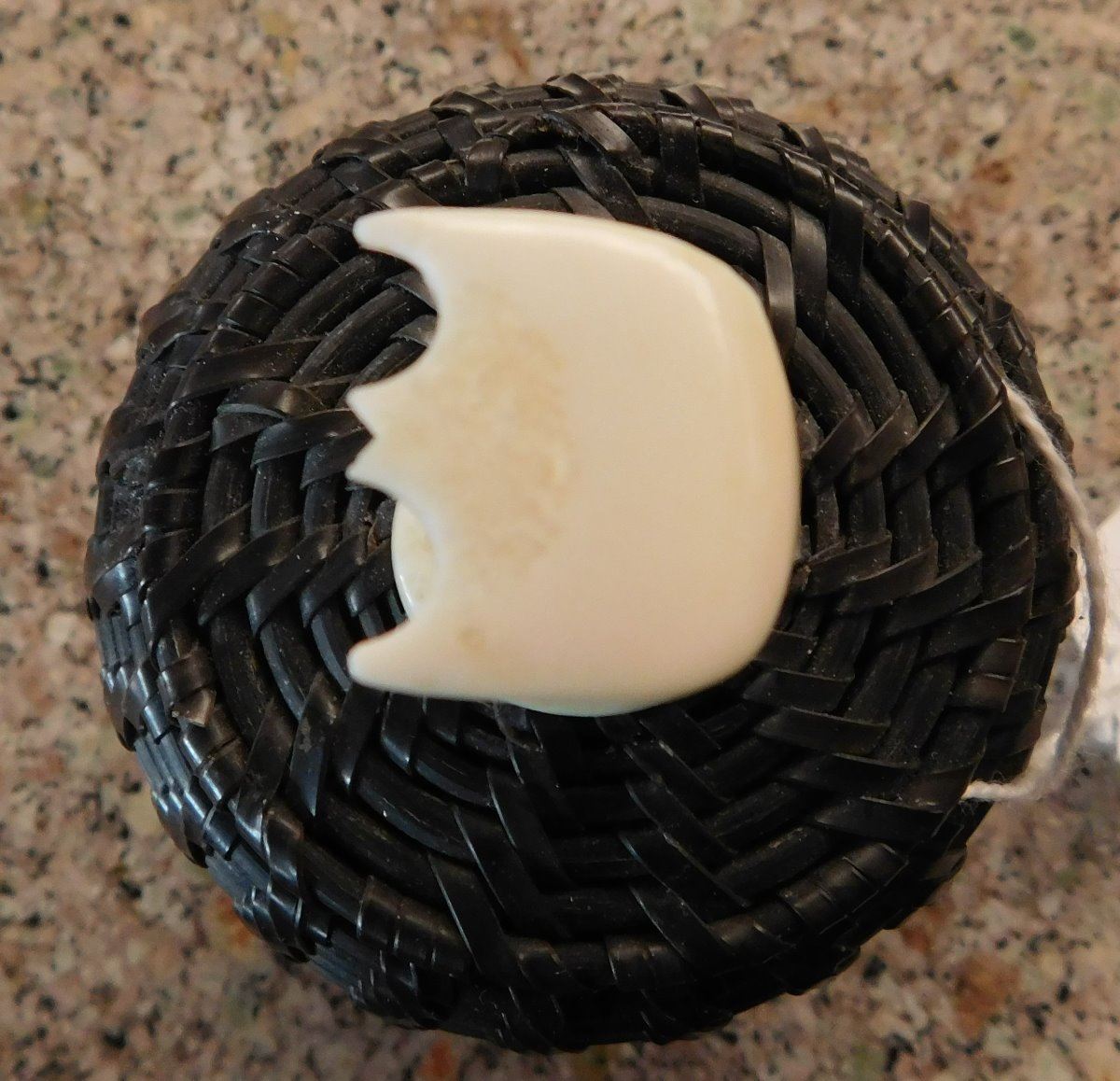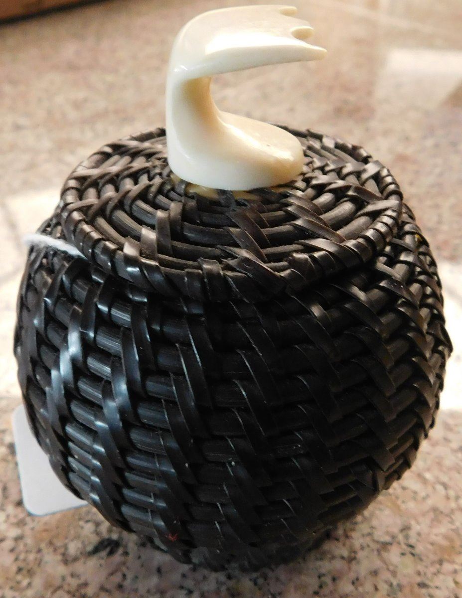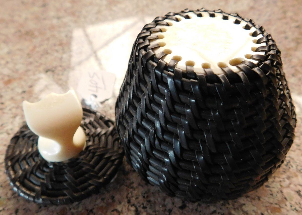 Baleen Eskimo Basket, circa 1960s. Made of baleen, the item measures 2.5" x 2.5" x 3.25". Eskimo, Alaska. Condition: Very good, see images. Shipping: $18.50 w/insurance and signature.