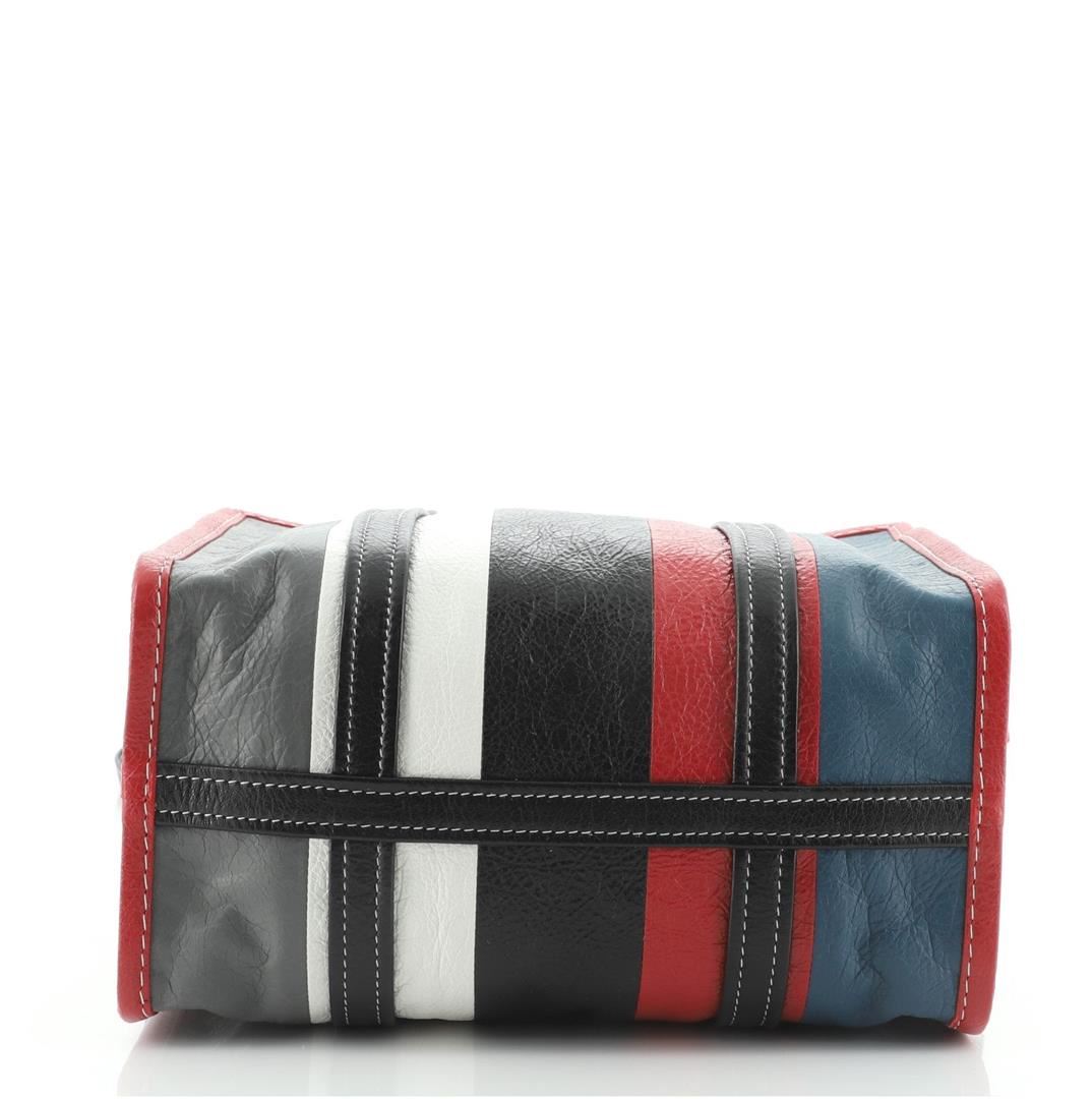 One Balenciaga Bazar Convertible Tote Striped Leather Small Blue, Multicolor, Red, White. Item is sold AS-IS. All available information is listed in the description and shown in the photo. Balenciaga Bazar Convertible Tote Striped Leather Small White, Yellow Condition Details: Minor wear in interior, scratches on hardware. Height 11", Width 11.5", Depth 6", Strap Drop 18