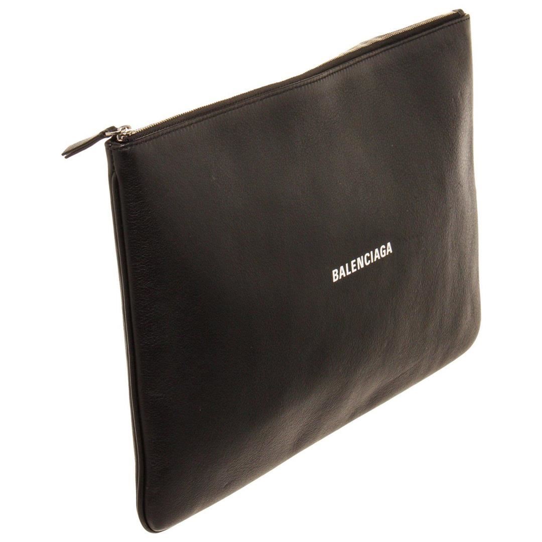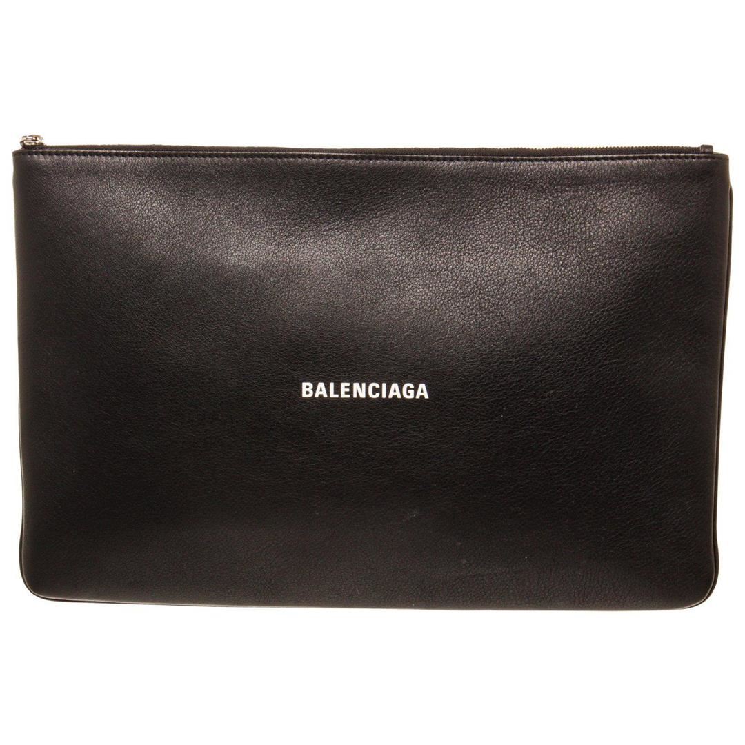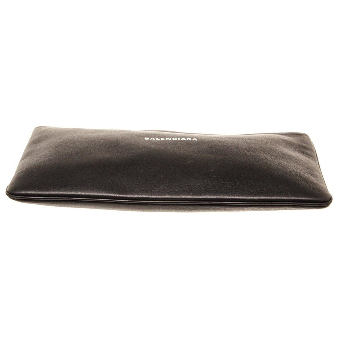 Balenciaga Black Leather Everyday Long Pouch with leather, silver-tone hardware, black leather trim, logo accent at front, black canvas lining, single slit pocket at interior wall and zip closure at top.