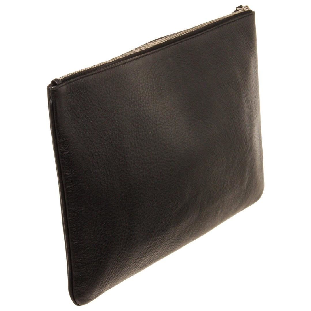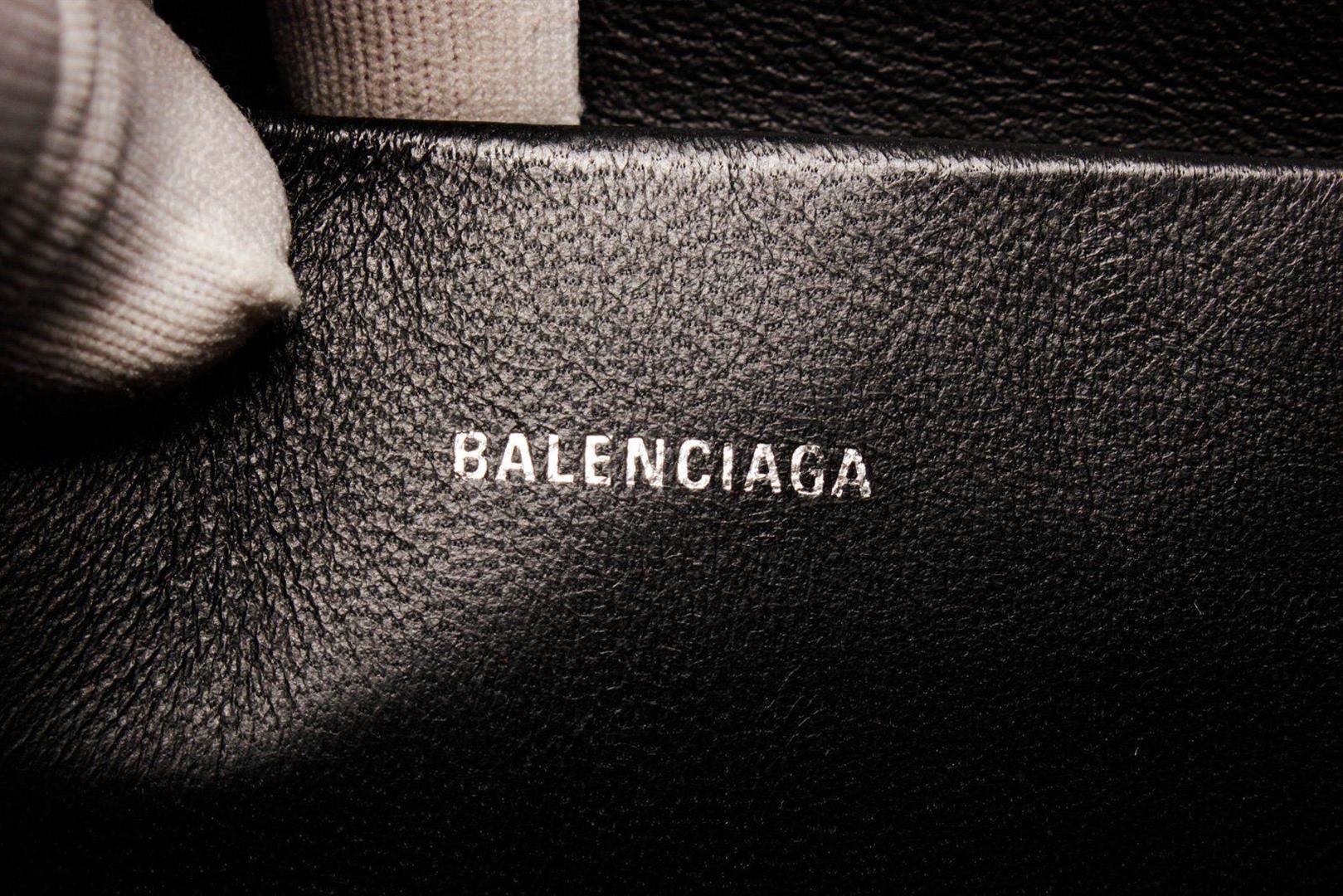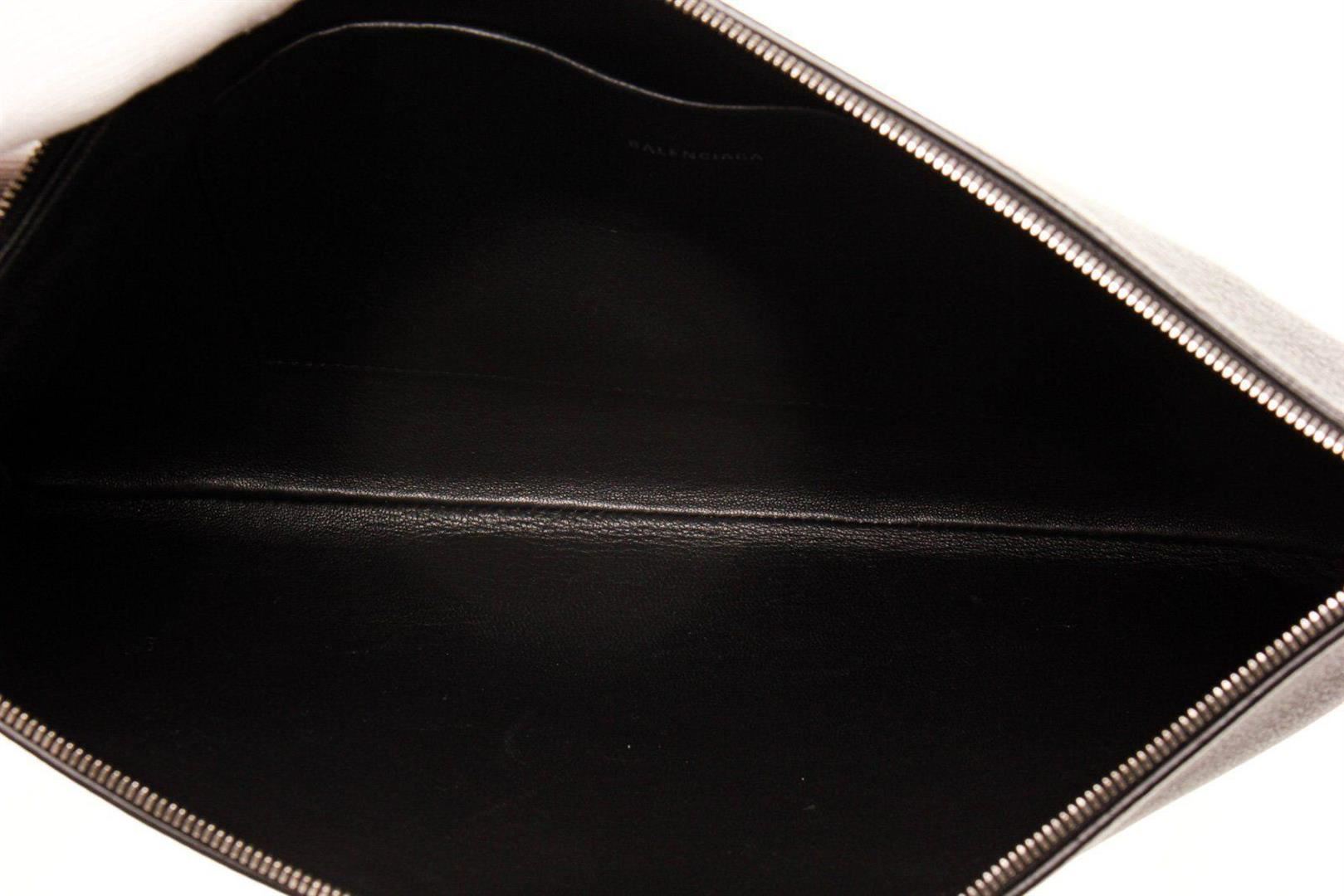 Balenciaga Black Leather Everyday Long Pouch with leather, silver-tone hardware, black leather trim, logo accent at front, black canvas lining, single slit pocket at interior wall and zip closure at top.
