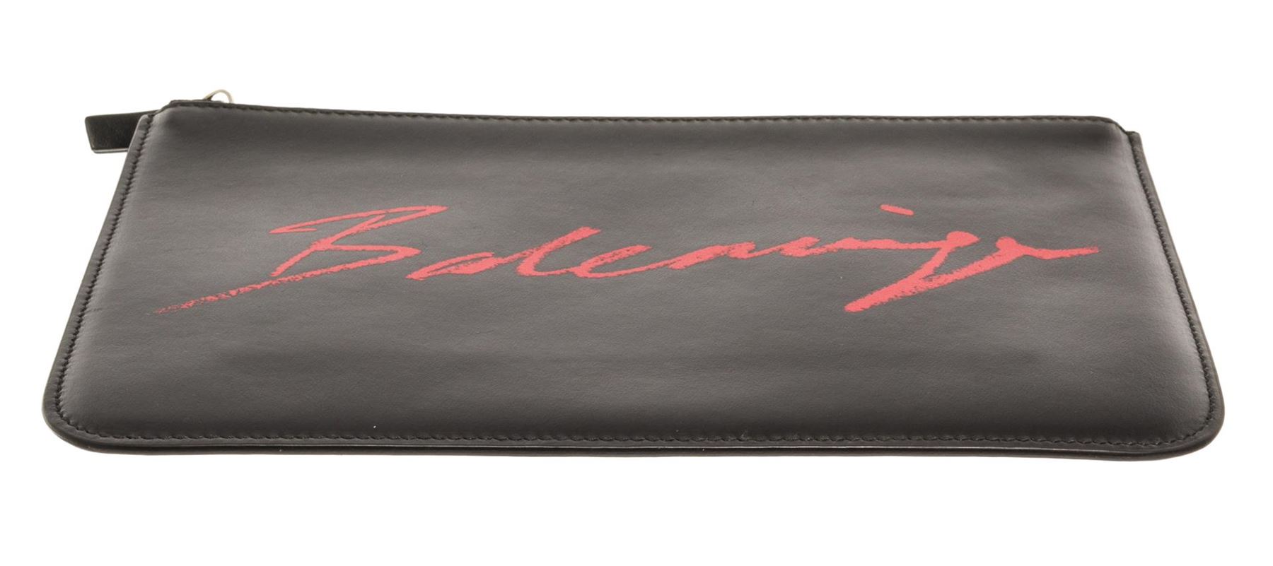 One Balenciaga Black Leather Everyday Script Logo Medium Pouch. Item is sold AS-IS. All available information is listed in the description and shown in the photo. Balenciaga Black Leather Everyday Script Logo Medium Pouch with silver-tone hardware, black leather lining, a leather slip pocket, and zip closure at the top. .