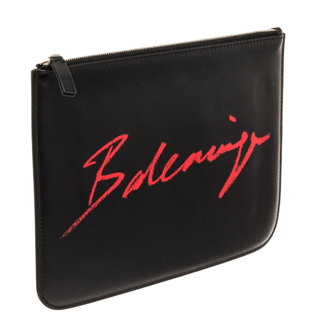One Balenciaga Black Leather Everyday Script Logo Medium Pouch. Item is sold AS-IS. All available information is listed in the description and shown in the photo. Balenciaga Black Leather Everyday Script Logo Medium Pouch with silver-tone hardware, black leather lining, a leather slip pocket, and zip closure at the top. .