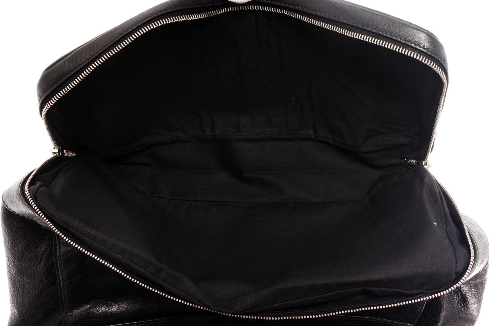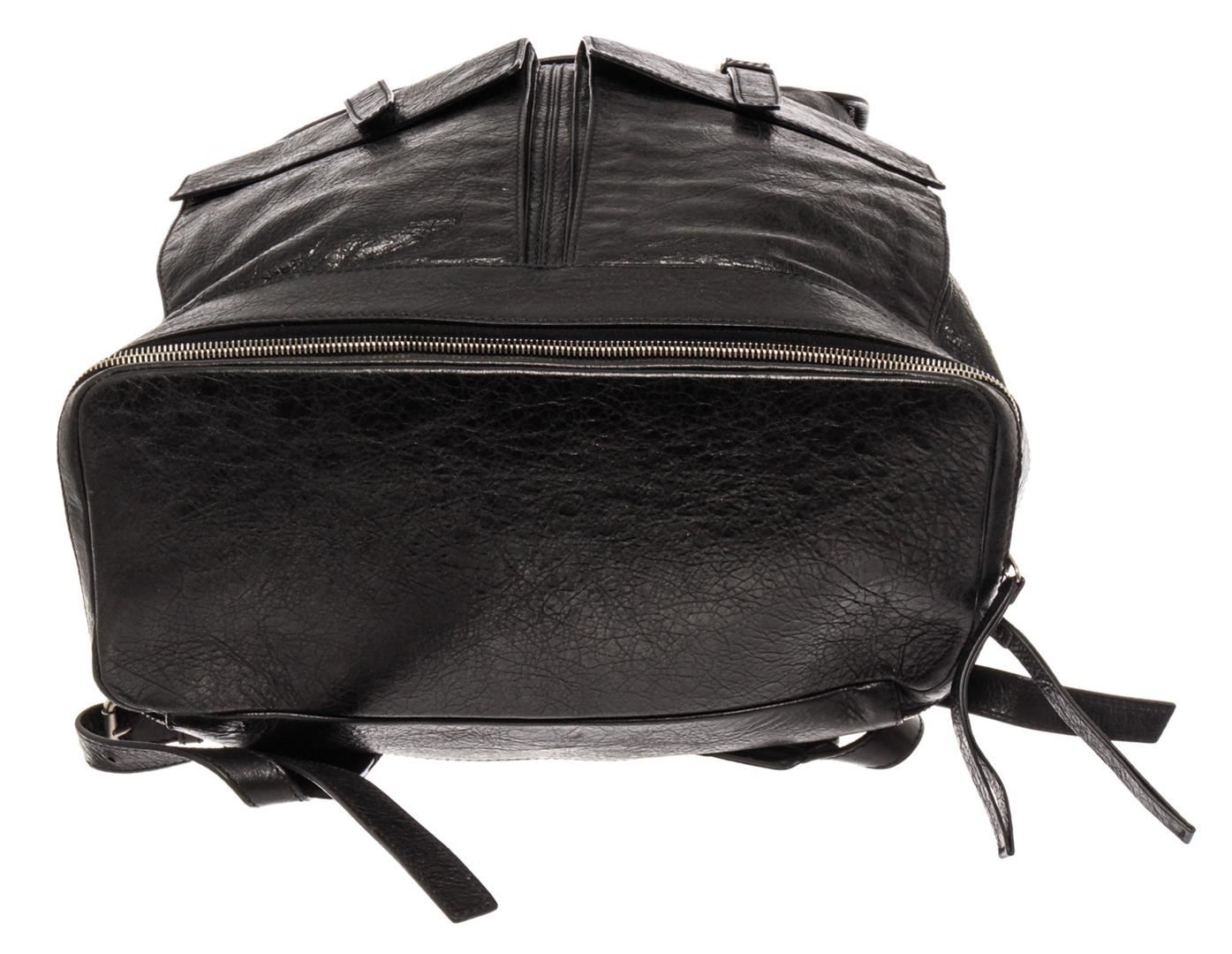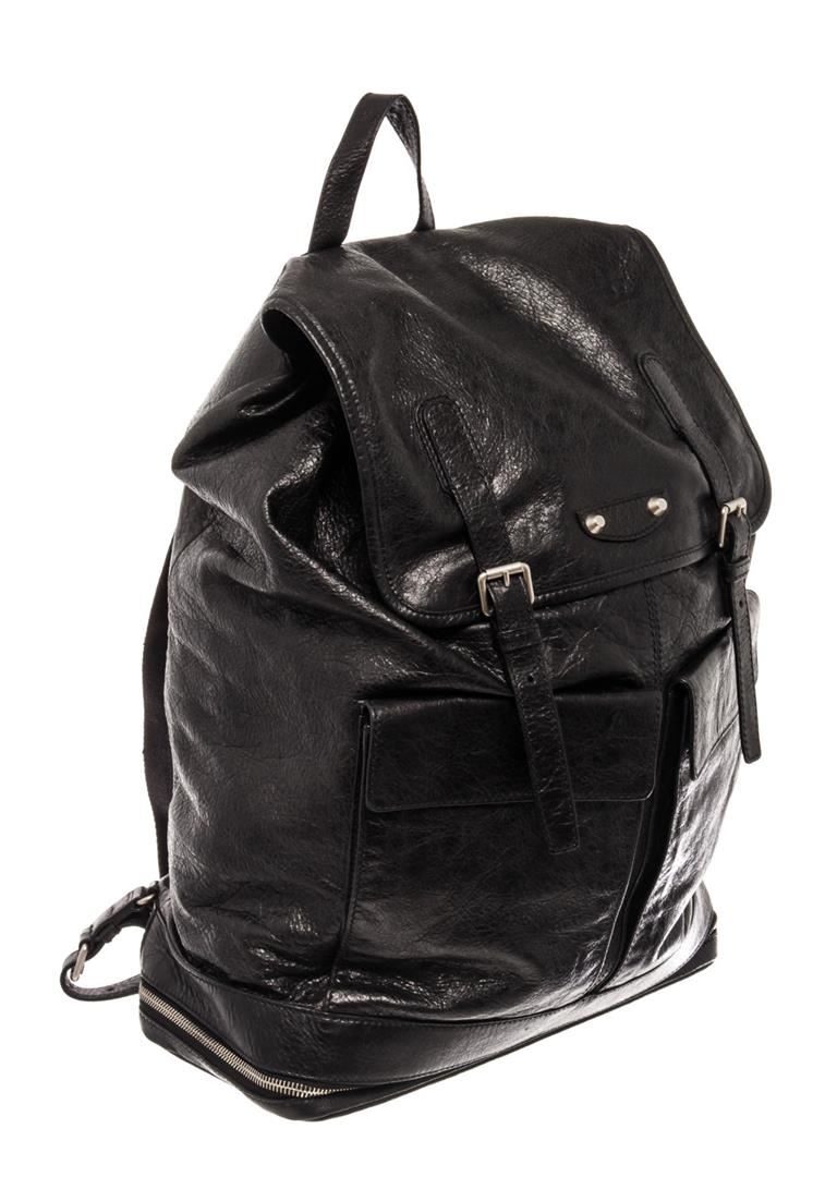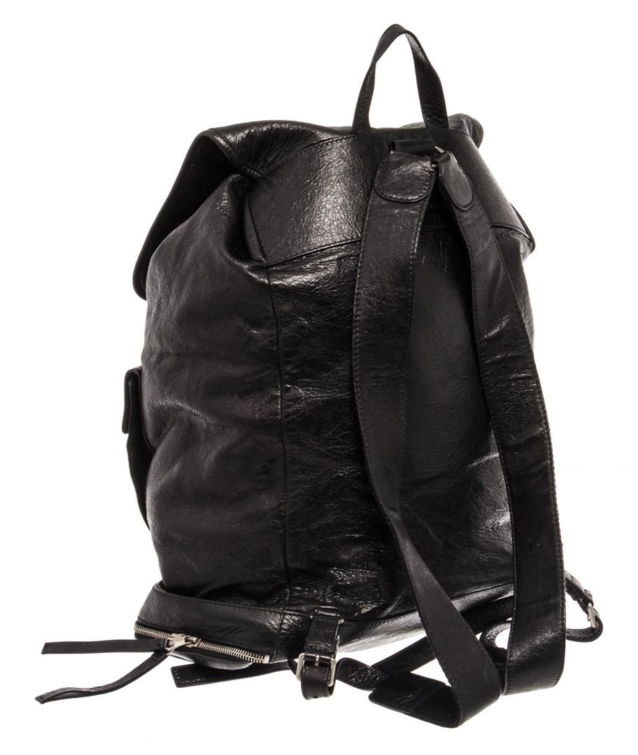Men's distressed black leather Balenciaga Expandable Traveller backpack with silver-tone hardware, dual pockets at front featuring flap closures, black canvas interior lining featuring single zip pocket at interior walls, tonal stitching throughout, drawstring and snap closures at front. Handle Drop 3", Height 19", Width 13", Depth 6", Strap Drop 13-15"