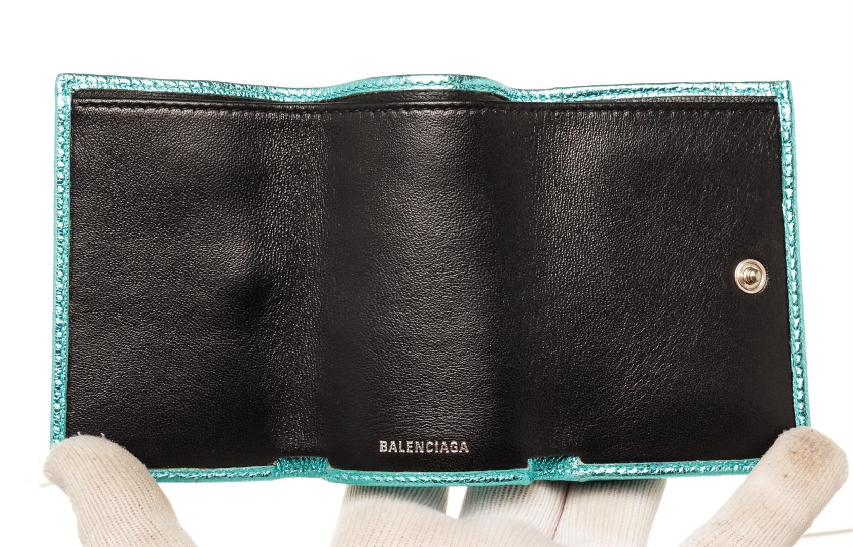 One Balenciaga Blue Leather Logo Trifold Wallet. Item is sold AS-IS. All available information is listed in the description and shown in the photo. Balenciaga Blue Leather Logo Trifold Wallet with leather, gold-tone hardware, interior card holder pocket and snap closure.
