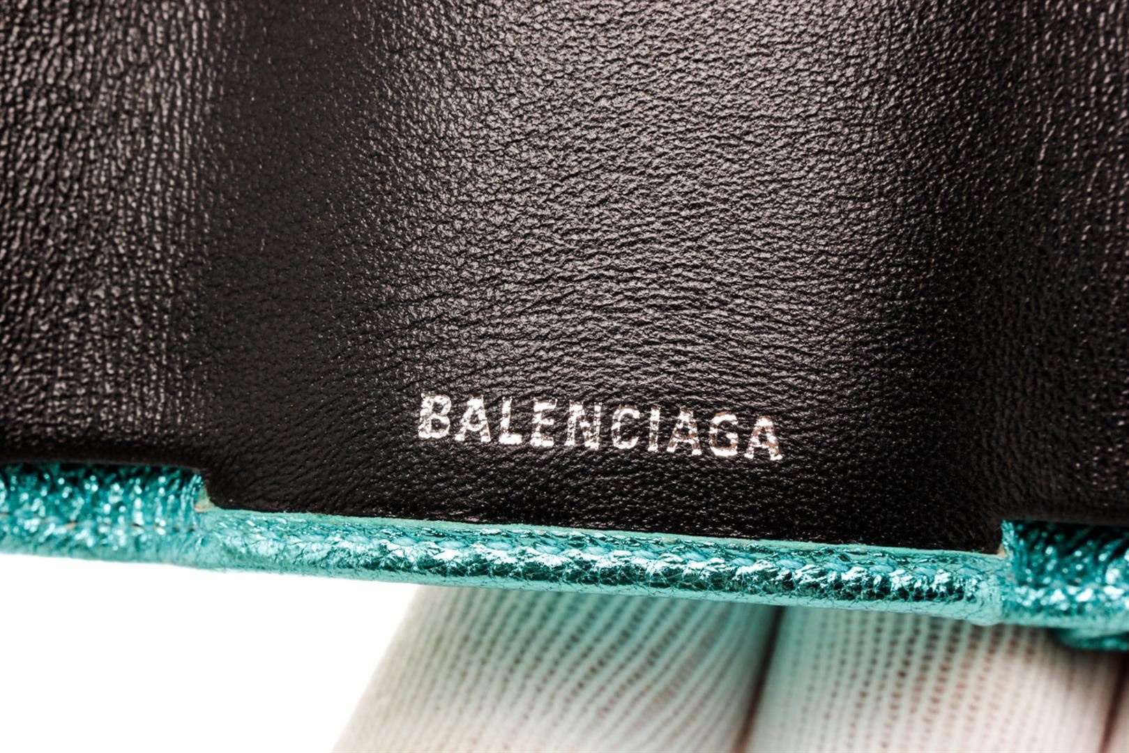 One Balenciaga Blue Leather Logo Trifold Wallet. Item is sold AS-IS. All available information is listed in the description and shown in the photo. Balenciaga Blue Leather Logo Trifold Wallet with leather, gold-tone hardware, interior card holder pocket and snap closure.
