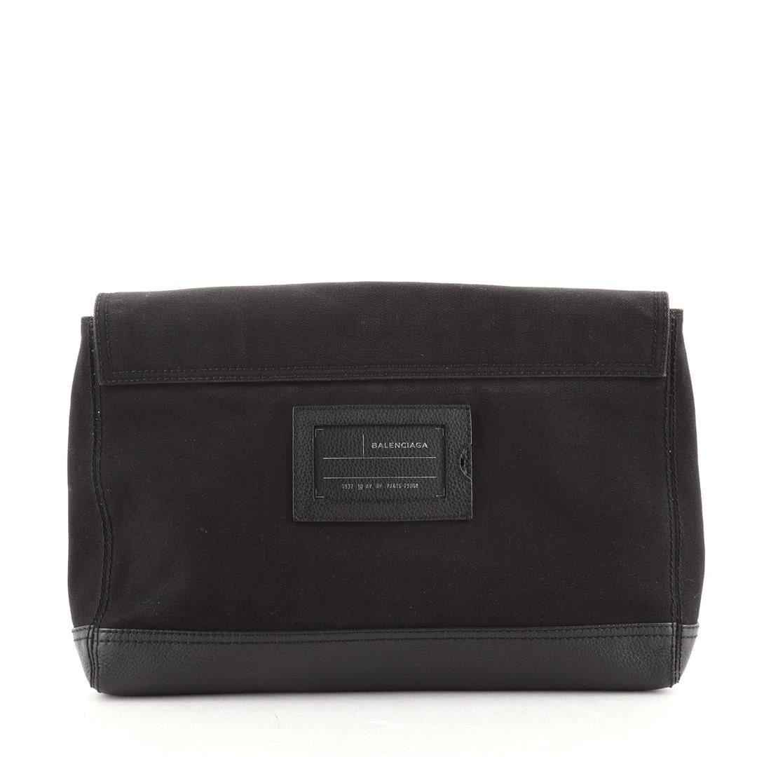 One Balenciaga Flap Clutch Canvas with Leather Black. Item is sold AS-IS. All available information is listed in the description and shown in the photo. Balenciaga Flap Clutch Canvas with Leather Black Canvas Leather Condition Details: Minor discoloration and wear on exterior and in interior, slight creasing underneath flap, scratches on hardware. Height 9", Width 13", Depth 4.4", Strap Drop None