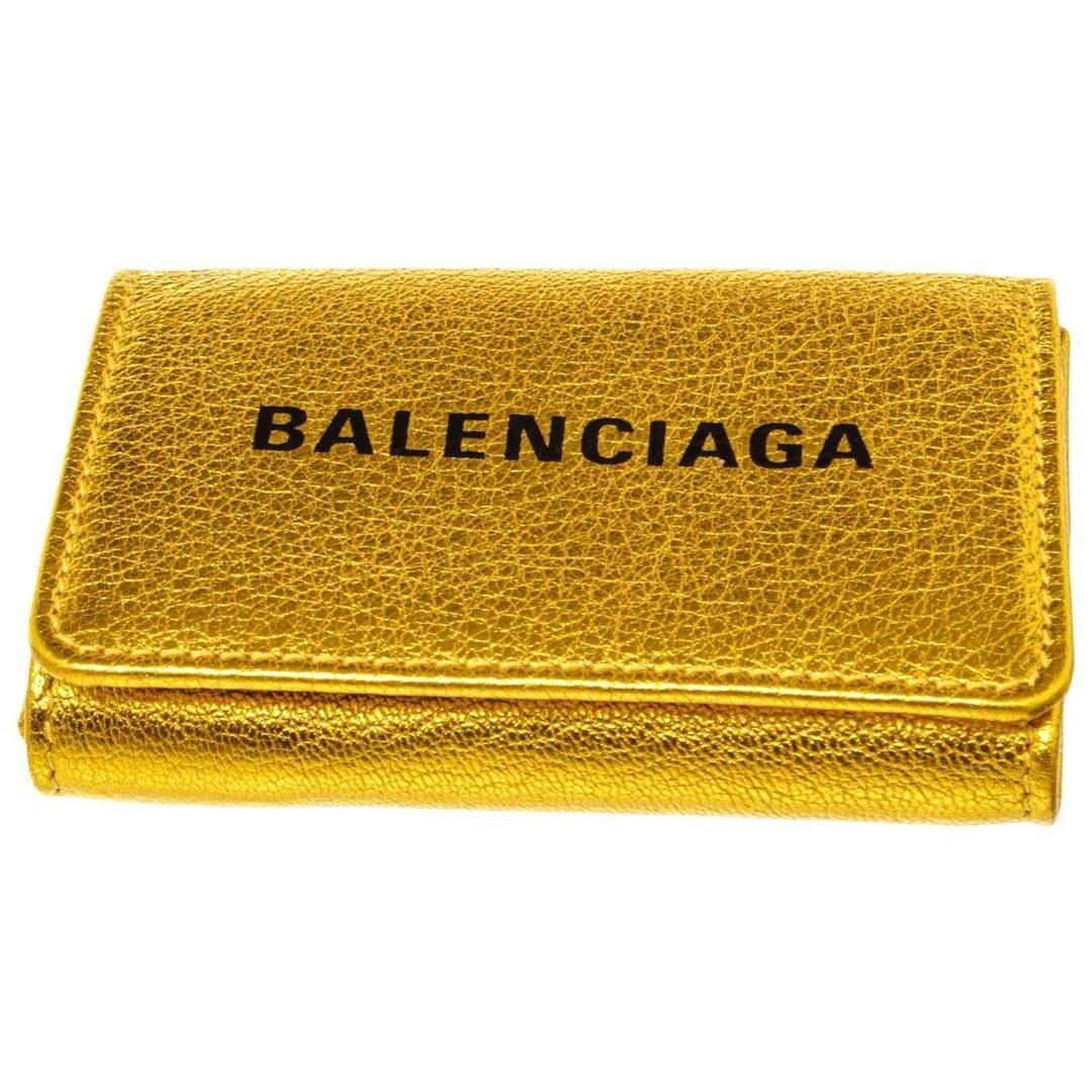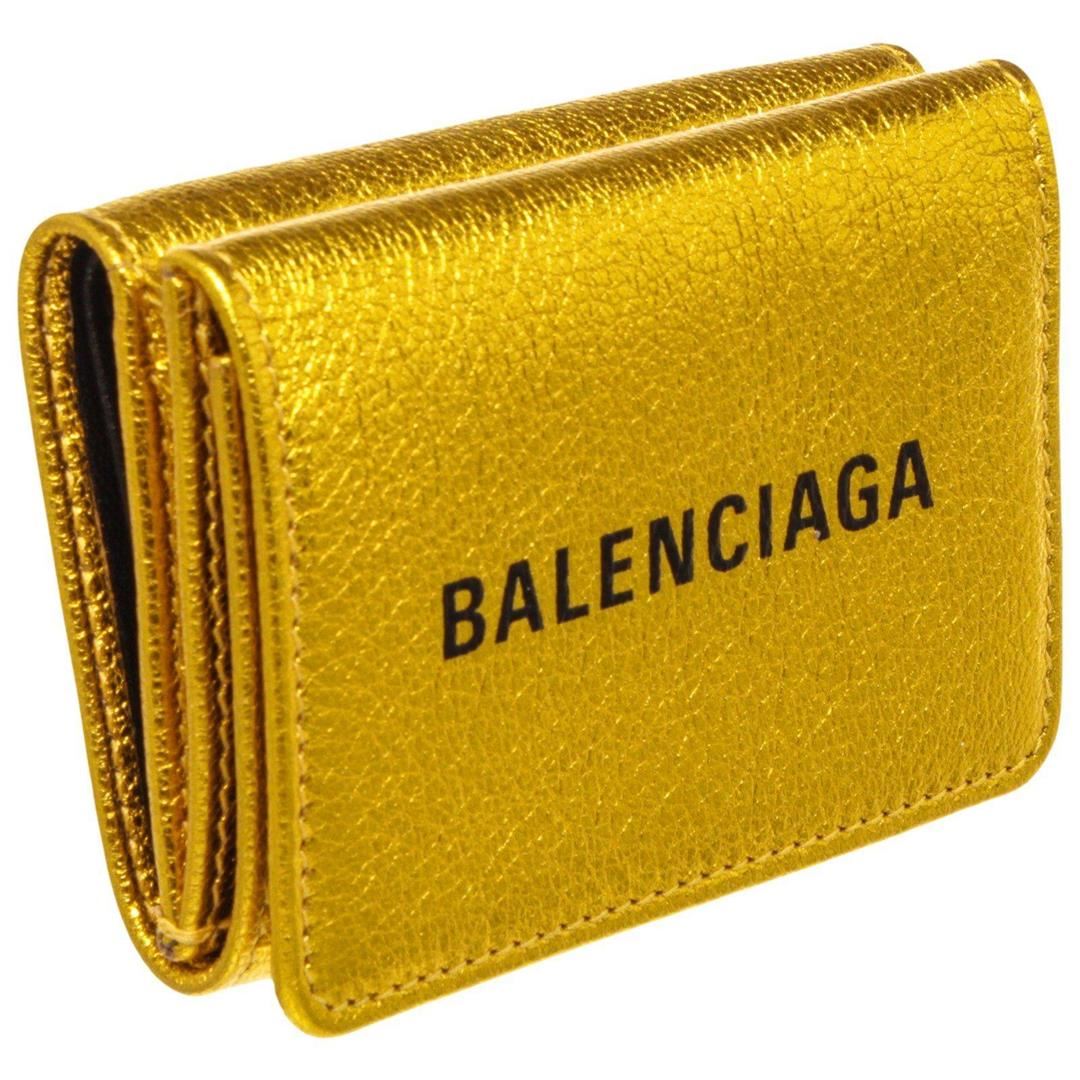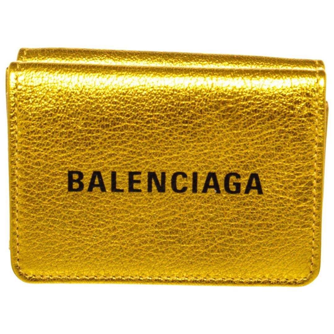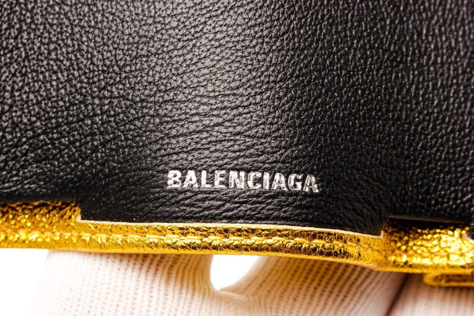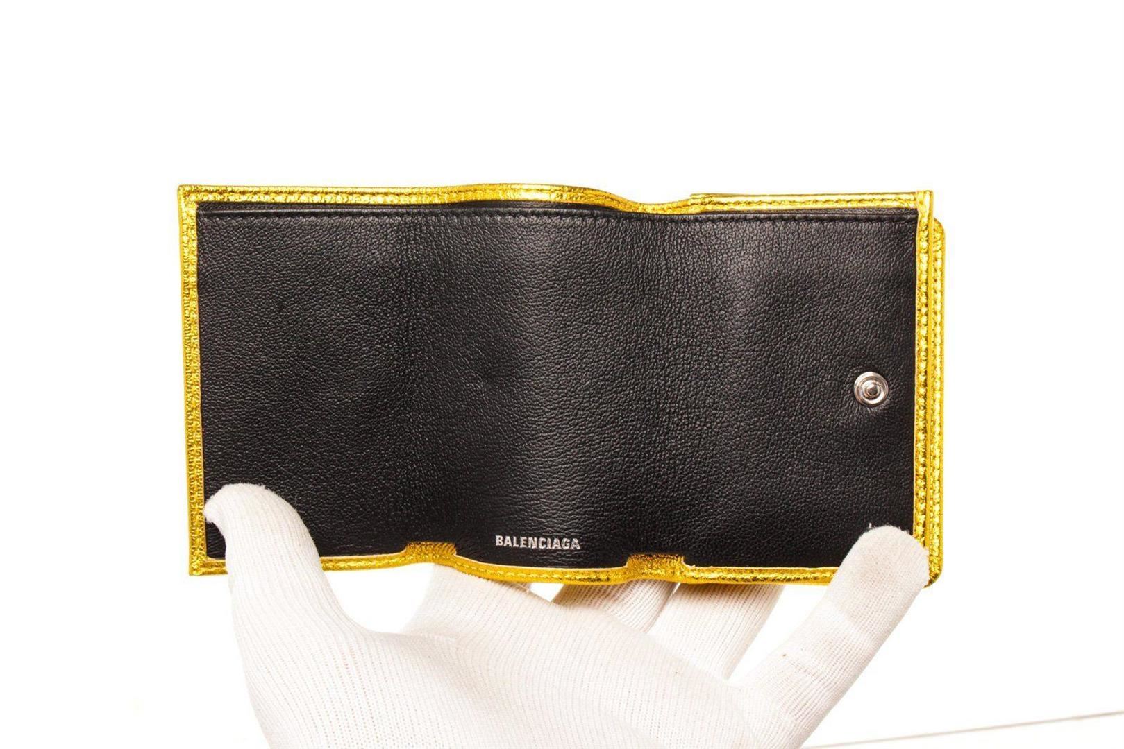 Balenciaga Gold Leather Logo Trifold Wallet with leather, silver-tone hardware, black leather trim, logo accent at front, black canvas lining, single slit pocket at interior wall and zip closure at top.