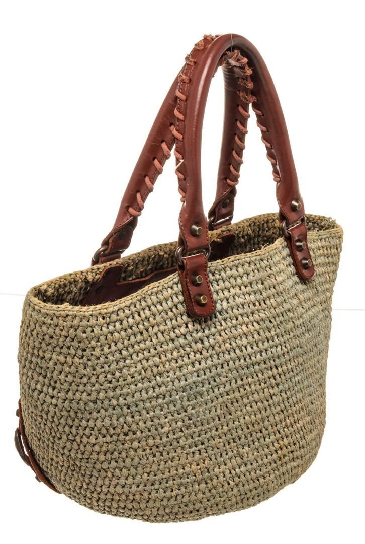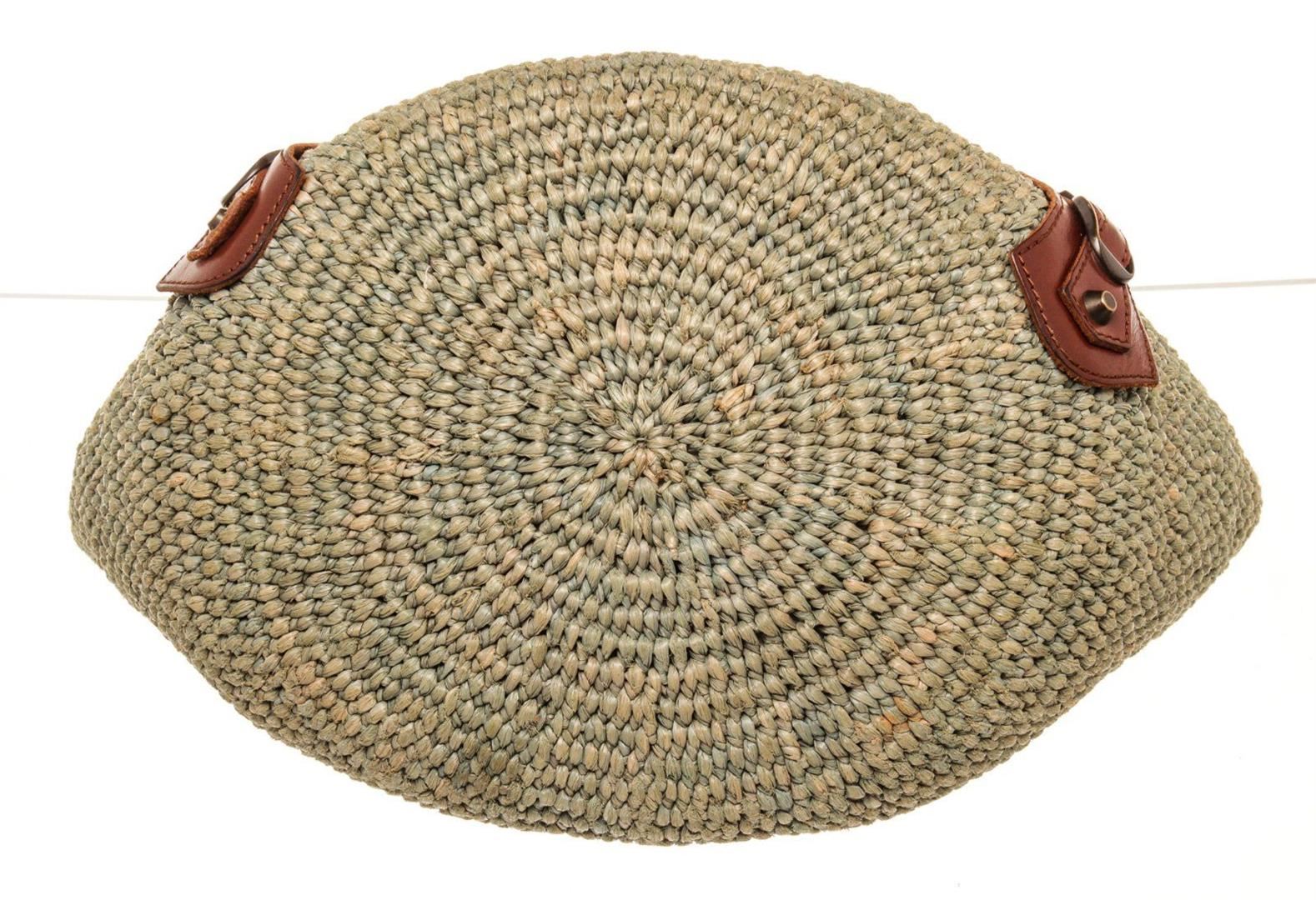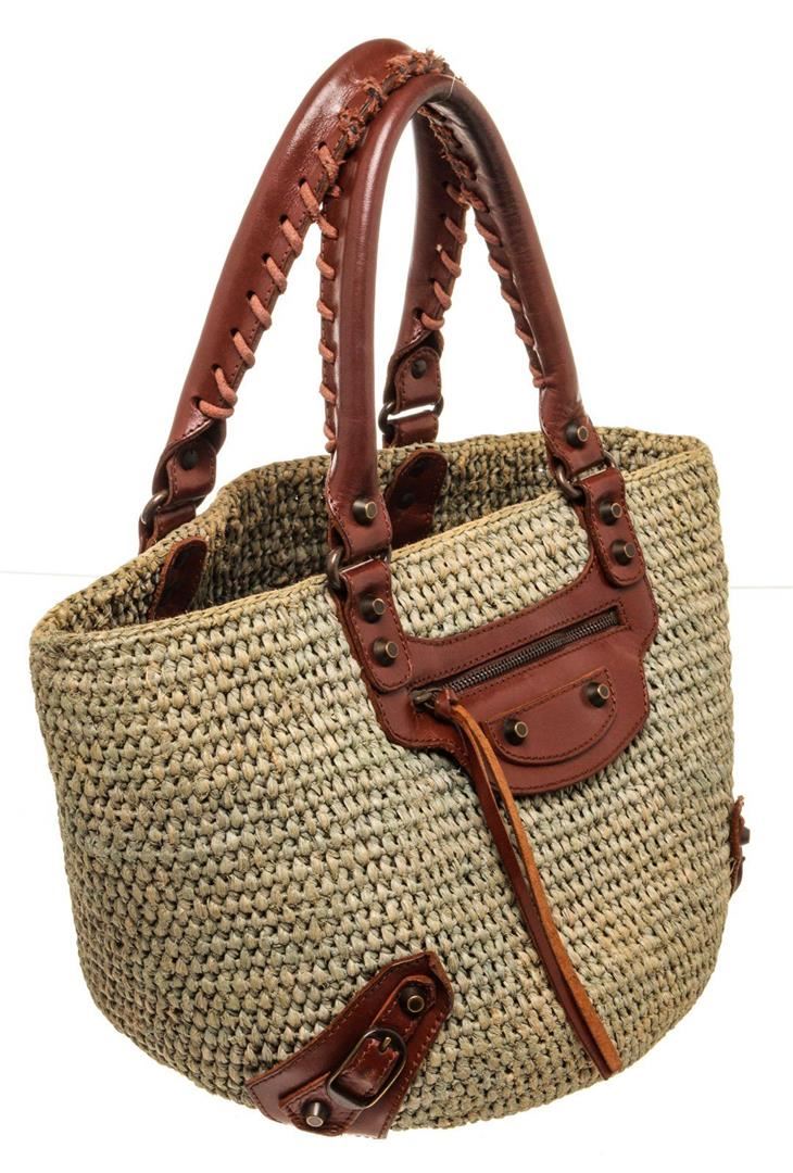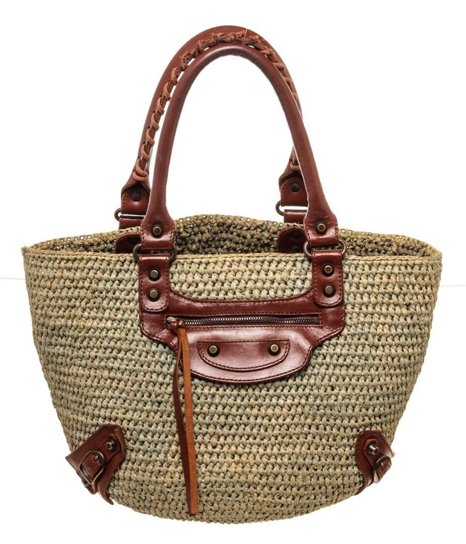 Balenciaga Green Canvas Wicker Tote Bag with canvas, tonal hardware, adjustable waist strap, single exterior pocket, canvas lining, zip closure.
