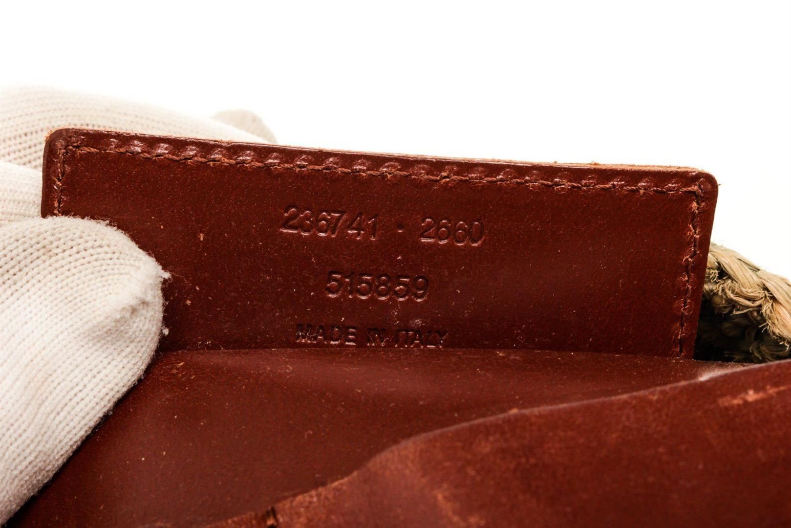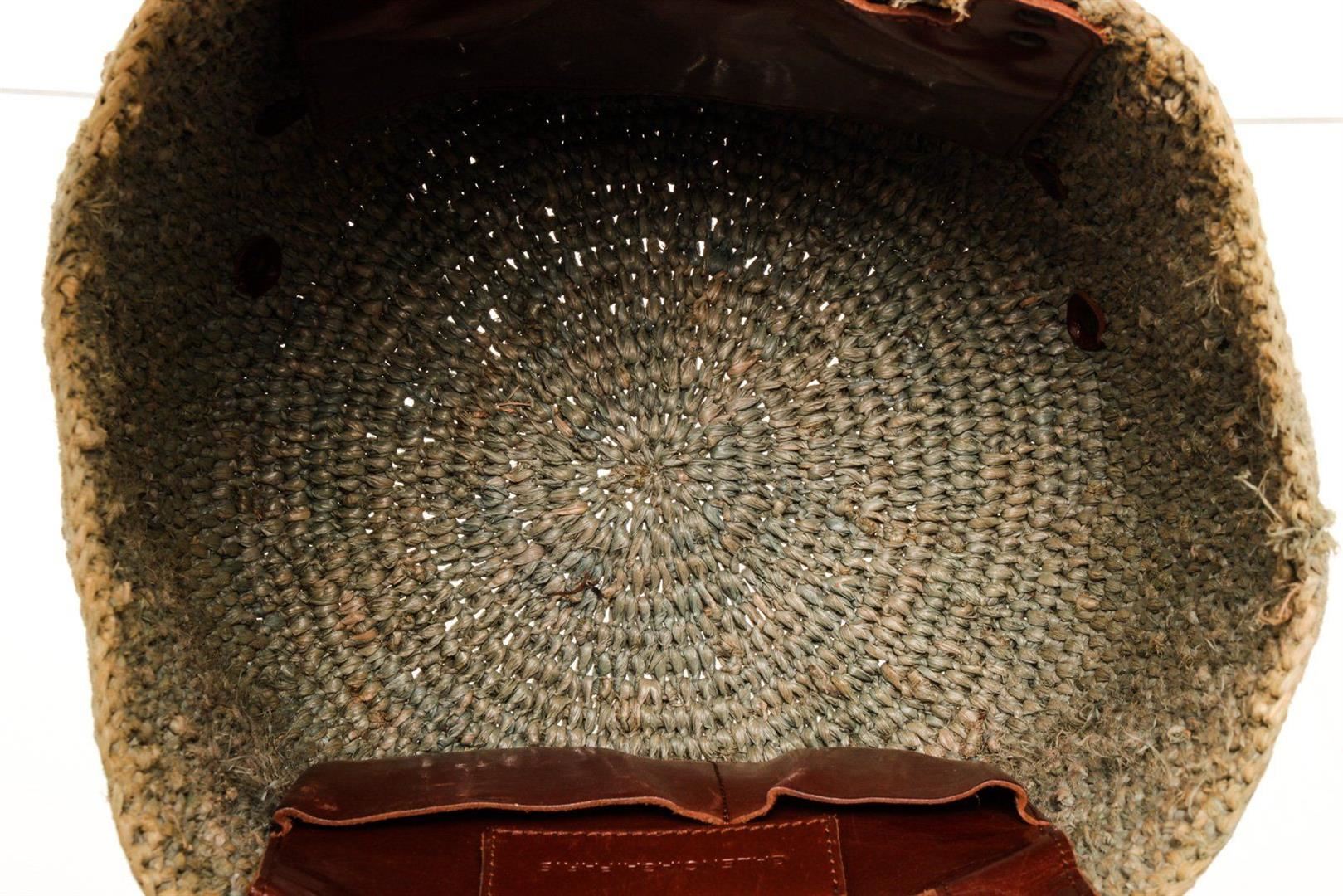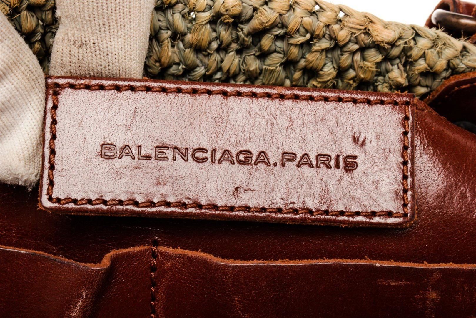 Balenciaga Green Canvas Wicker Tote Bag with canvas, tonal hardware, adjustable waist strap, single exterior pocket, canvas lining, zip closure.