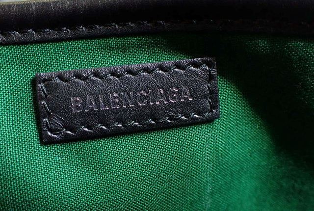 One Balenciaga Green Multicolor Wool Checks Small Navy Cabas Bag. Item is sold AS-IS. All available information is listed in the description and shown in the photo. BalencIaga Navy Cabas small bag features a green multicolor wool checks body with black leather trim, silver-tone hardware, dual flat leather handles, an open top with magnetic snap closure, green canvas lining and an interior slip pocket. Handle Drop 6", Height 9", Width 11.5", Depth 7"