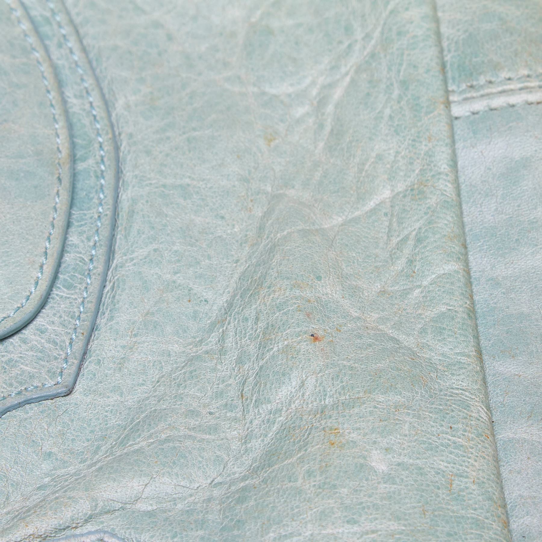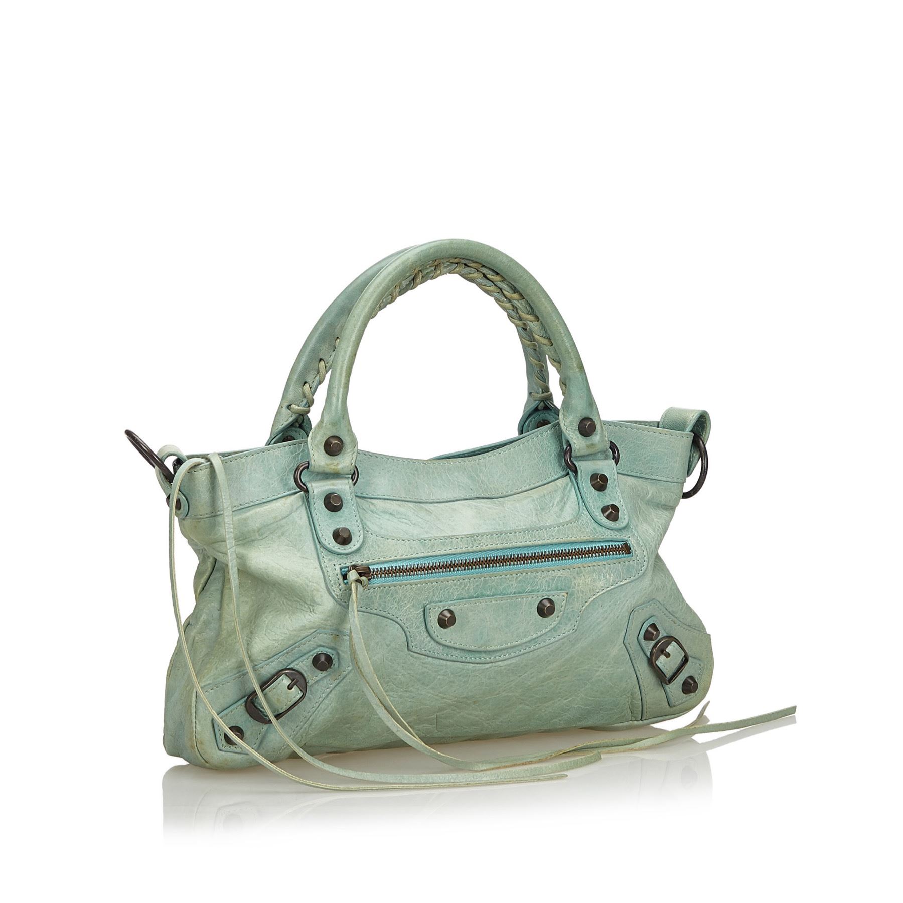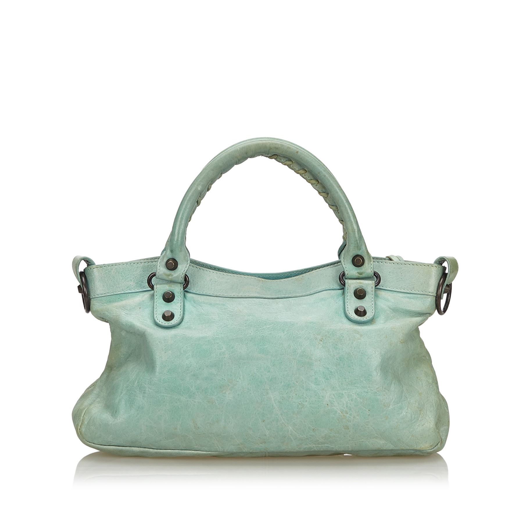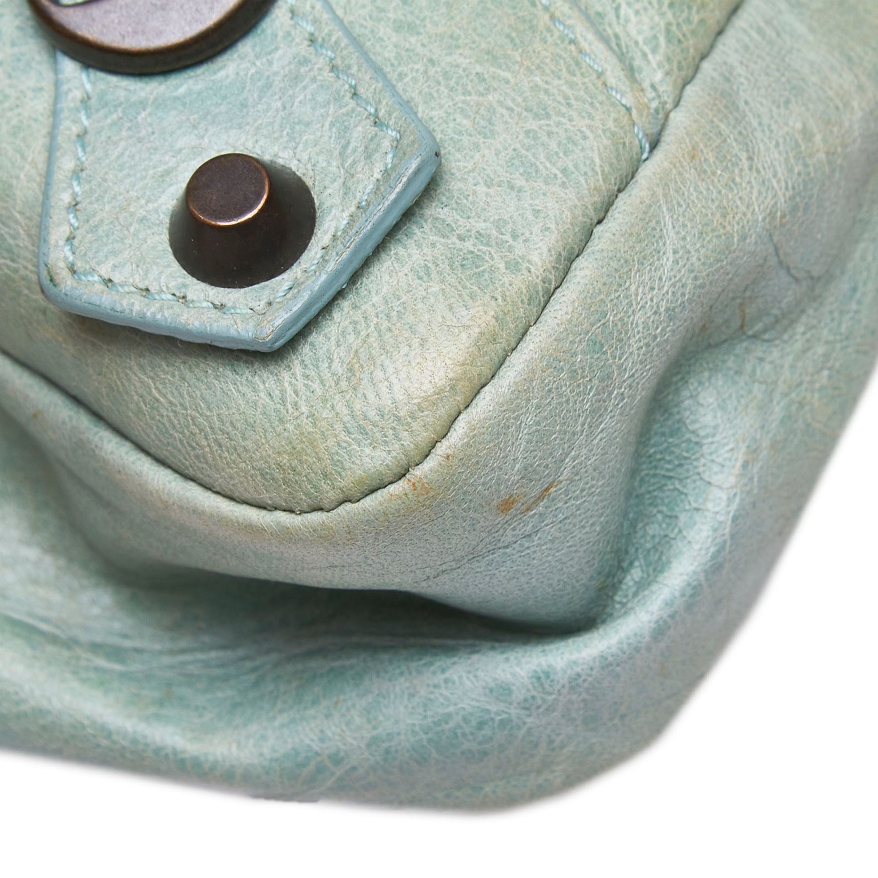 The Motocross Classic First satchel features a leather body with tassel zipper pull details, a front exterior zip pocket, silver-tone studs, rolled leather handles, a detachable shoulder strap, a top zip closure, and an interior zip pocket. Leather x Others Green Exterior front is stained with transfer of color. Exterior back is stained with transfer of color. Exterior bottom is stained with transfer of color. Exterior handle is stained with transfer of color. Size: 18 x 32 x 6 Card: NO Made in: ITALY