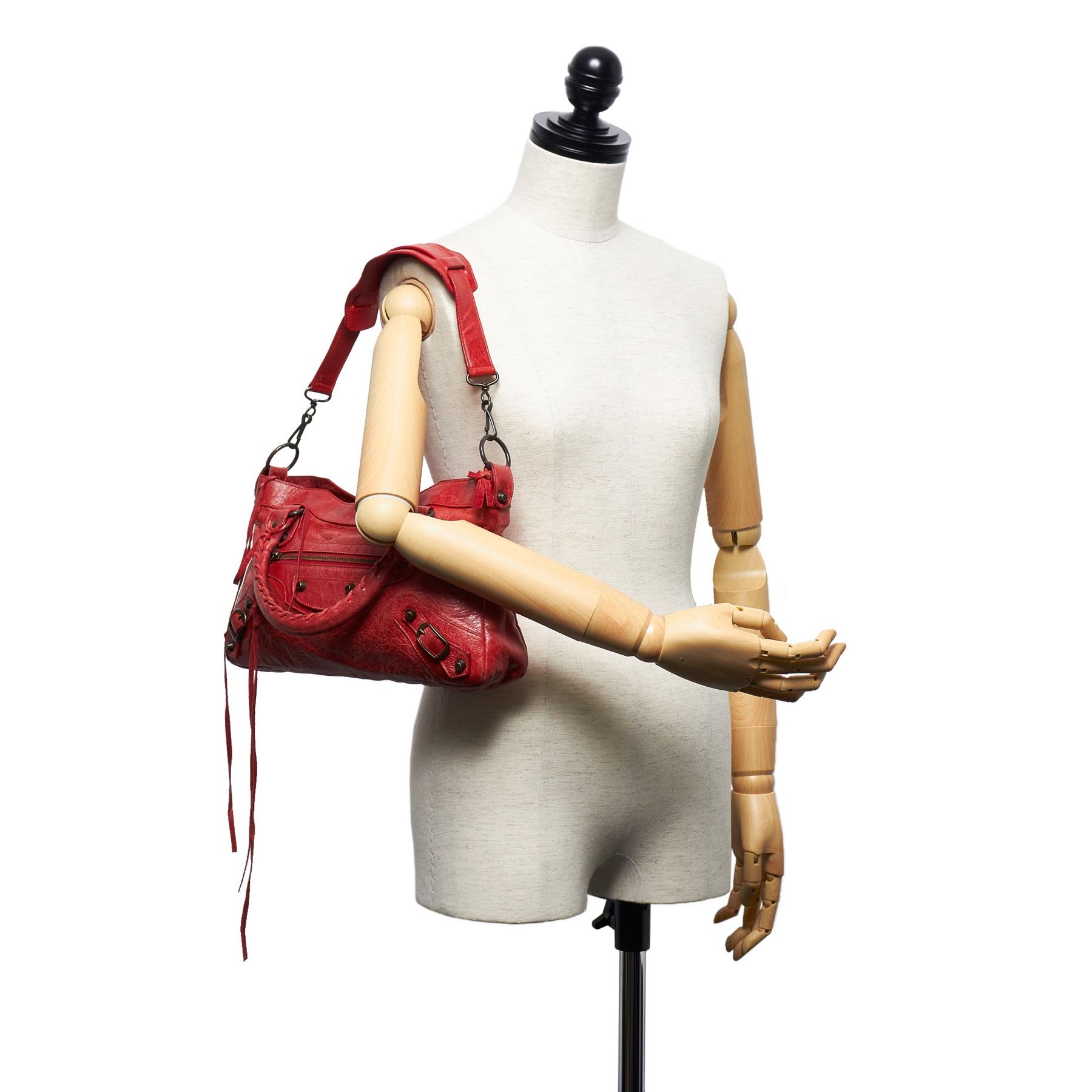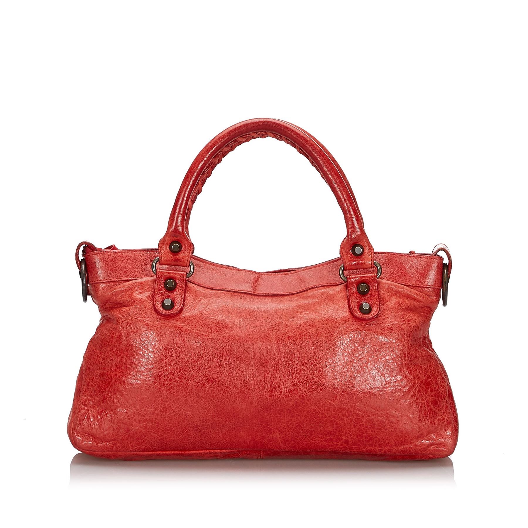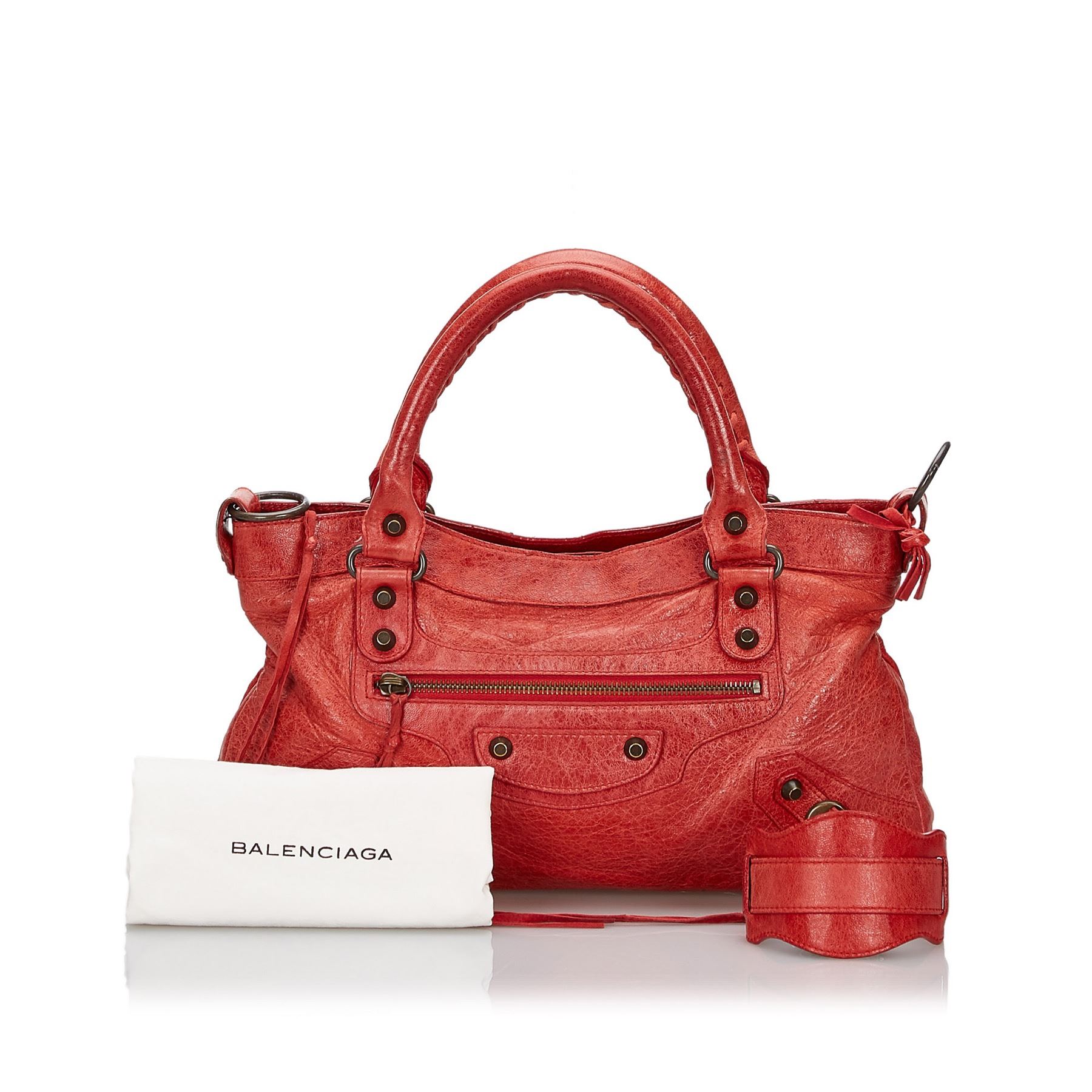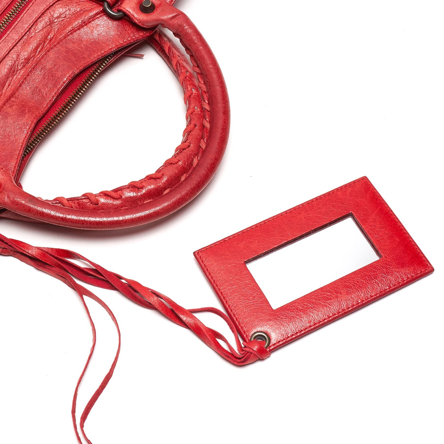 The Classic Motocross First satchel features a leather body with tassel zipper pull details, rolled handles, silver-tone studs, an exterior zip pocket, a top zip closure, and an interior zip pocket. Leather x Others Red Exterior pocket is scratched. Exterior corners is scratched. Exterior side is scratched. Screw is scratched. Size: 18 x 33 x 6 Card: NO Made in: ITALY