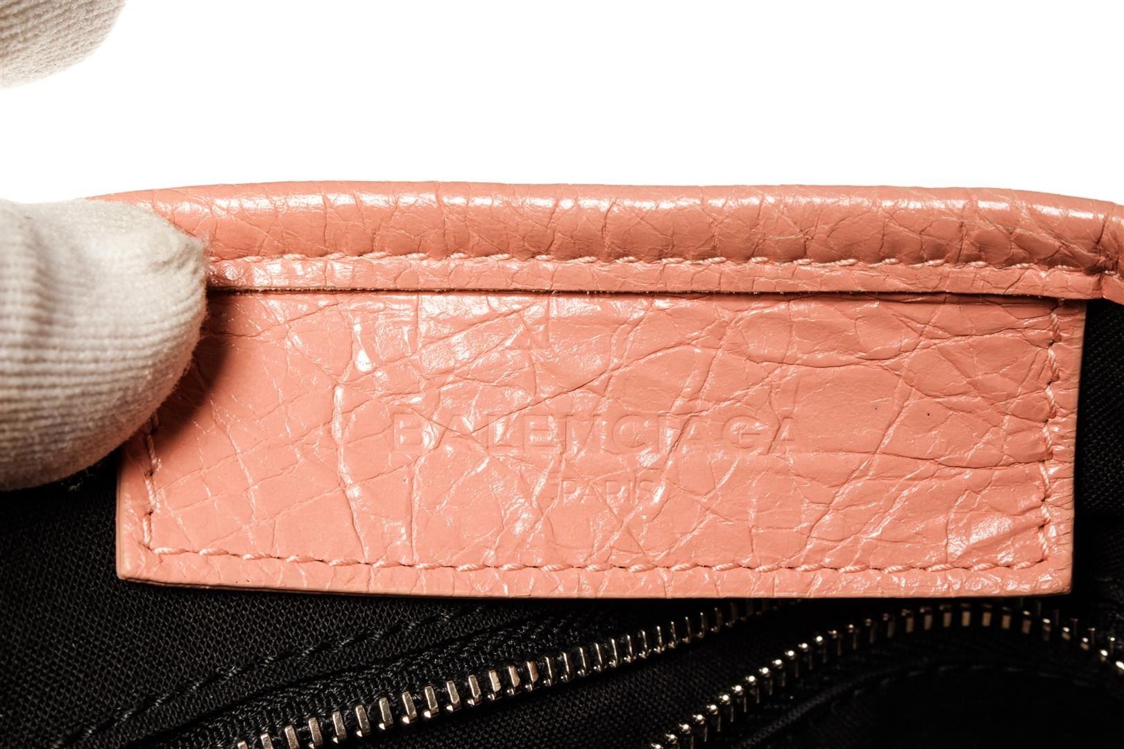 One Balenciaga Navy Cabas XS. Item is sold AS-IS. All available information is listed in the description and shown in the photo. Balenciaga Navy Cabas XS Pink Leather. Features silver hardware, black canvas interior, pink leather straps, and a silver zipper closure.