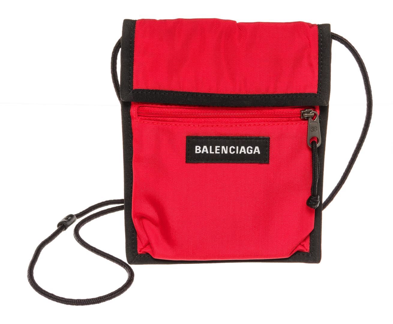 One Balenciaga Red Black Canvas Explorer Small Pouch with Strap. Item is sold AS-IS. All available information is listed in the description and shown in the photo. Red canvas and black logo patch Balenciaga Explorer small pouch with silver-tone hardware, black canvas long strap, exterior pouch with zip closure and foldover top that will open to black canvas lining. L7.4 x H5.9 x W1.5 inch