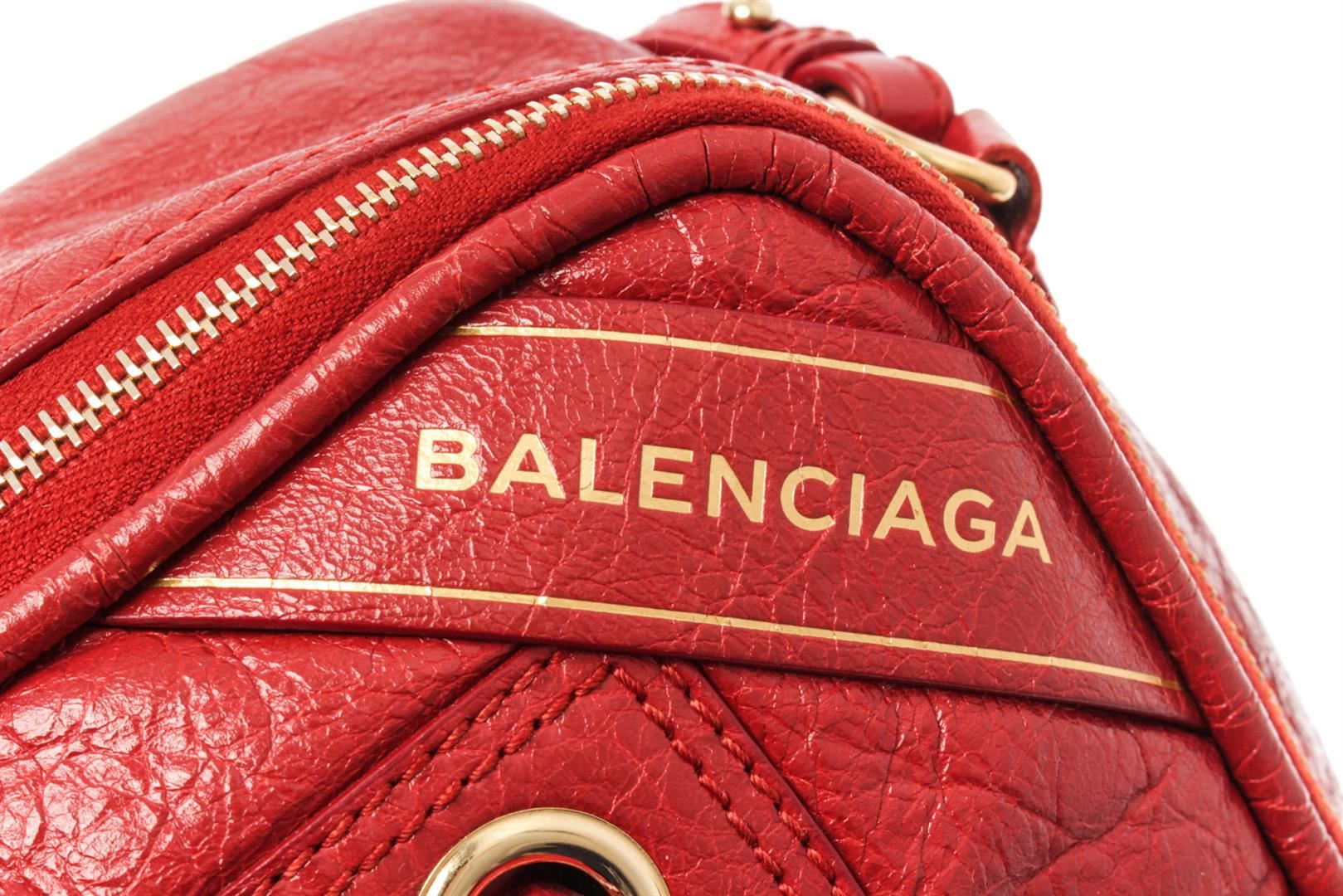 Balenciaga Red Leather Small Blanket Square Bag. All available information is listed in the description and shown in the photos. Balenciaga Red Leather Small Blanket Square Bag with rolled leather handles and an optional adjustable shoulder strap, This opens to a partitioned black fabric interior with patch pockets and a central zipper compartment. Height: 8 in (20.32 cm), Width: 9.5 in (24.13 cm), Depth: 4 in (10.16 cm)