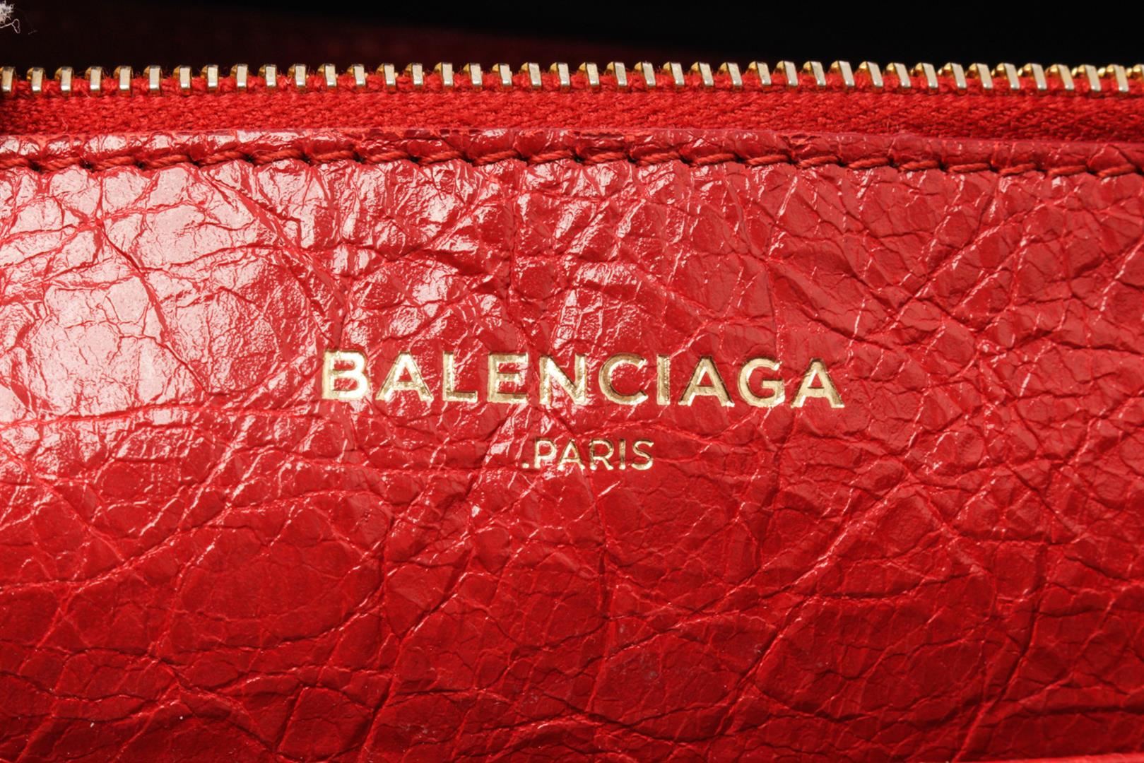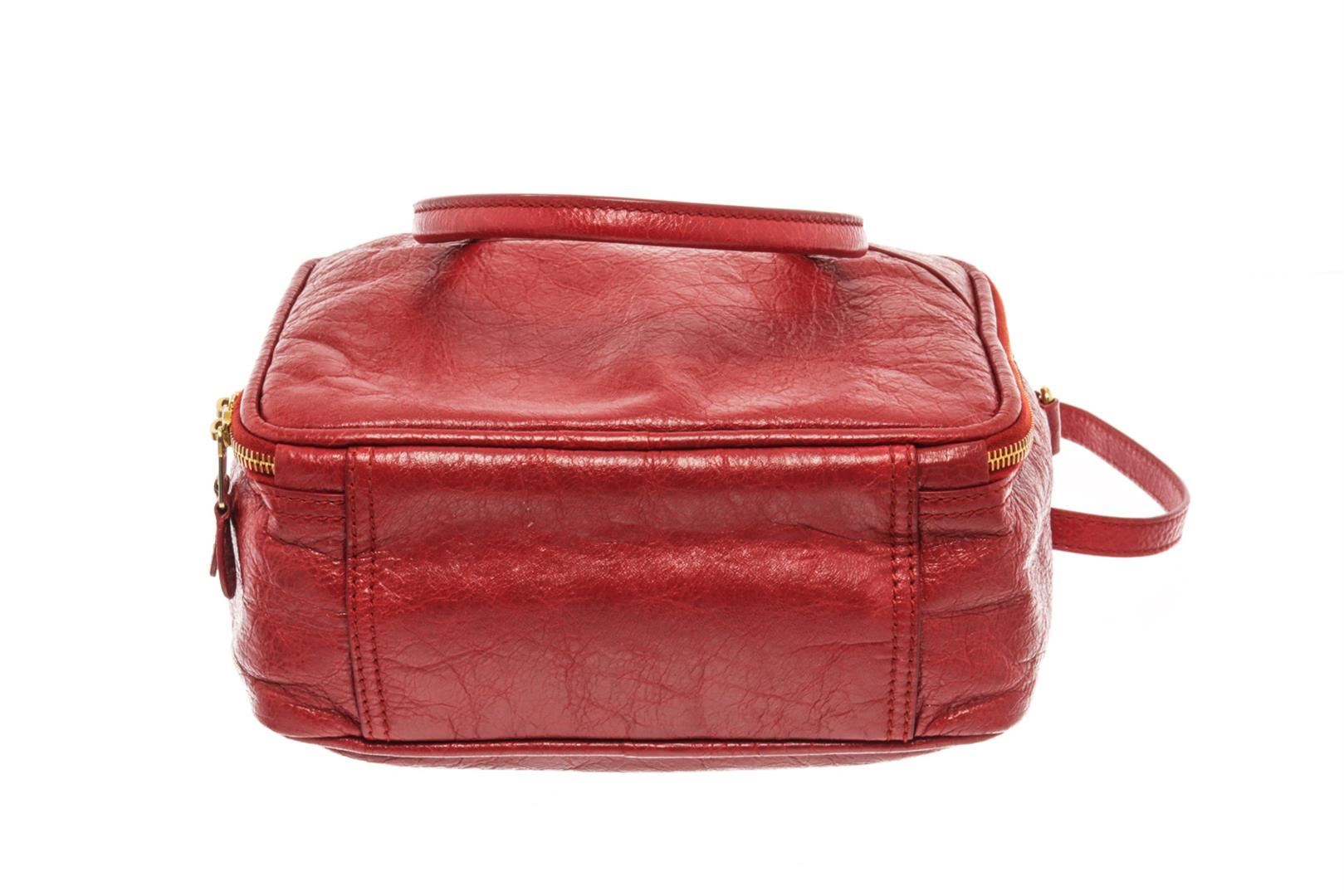 Balenciaga Red Leather Small Blanket Square Bag. All available information is listed in the description and shown in the photos. Balenciaga Red Leather Small Blanket Square Bag with rolled leather handles and an optional adjustable shoulder strap, This opens to a partitioned black fabric interior with patch pockets and a central zipper compartment. Height: 8 in (20.32 cm), Width: 9.5 in (24.13 cm), Depth: 4 in (10.16 cm)