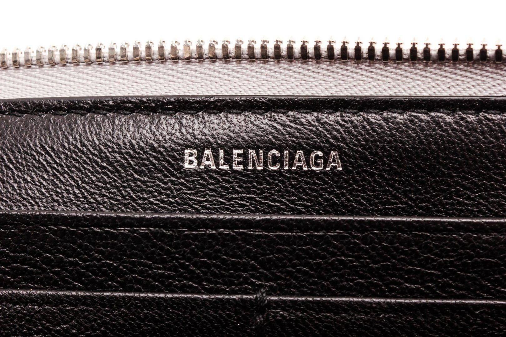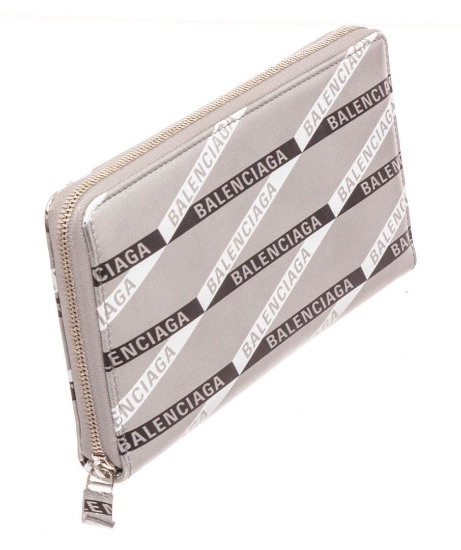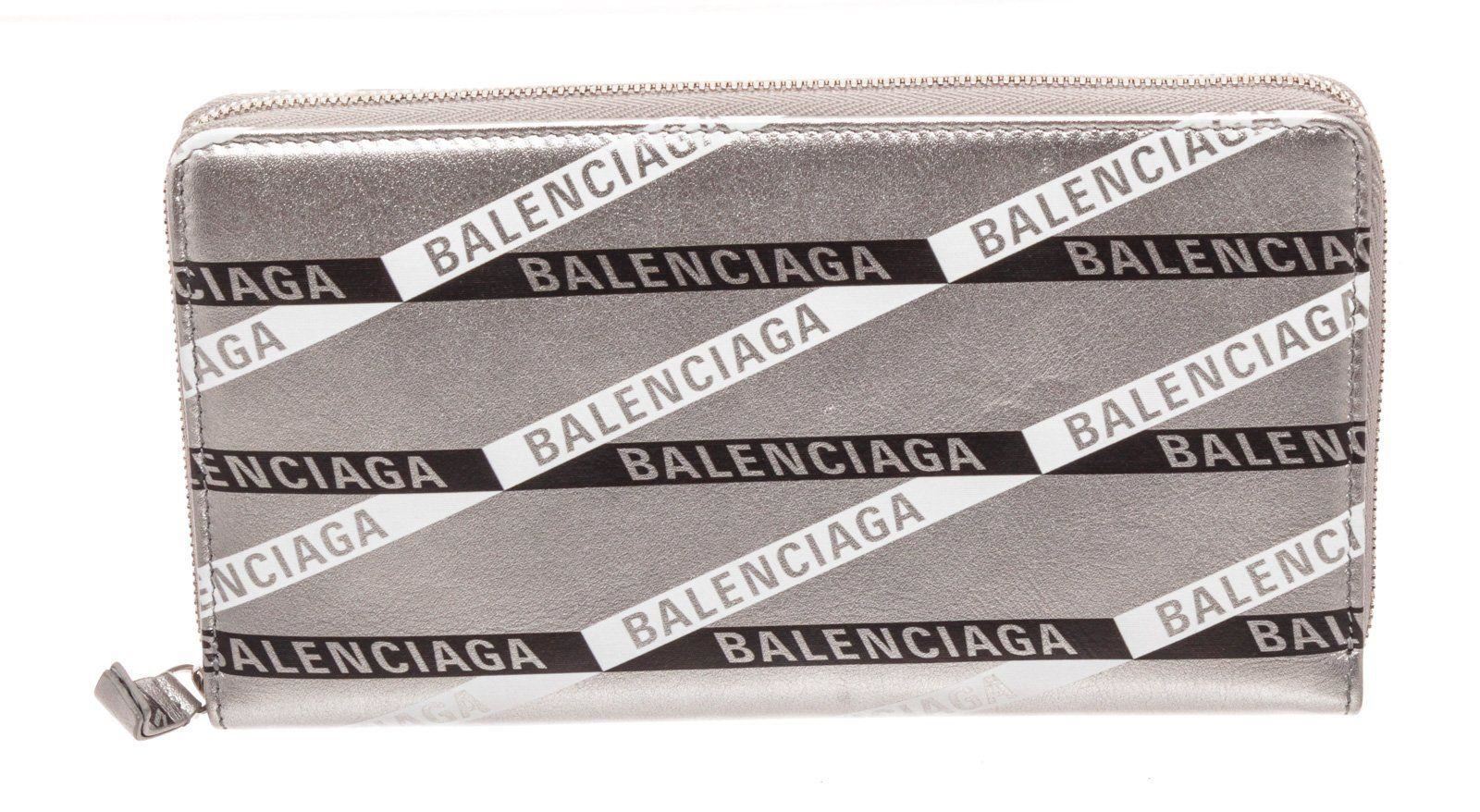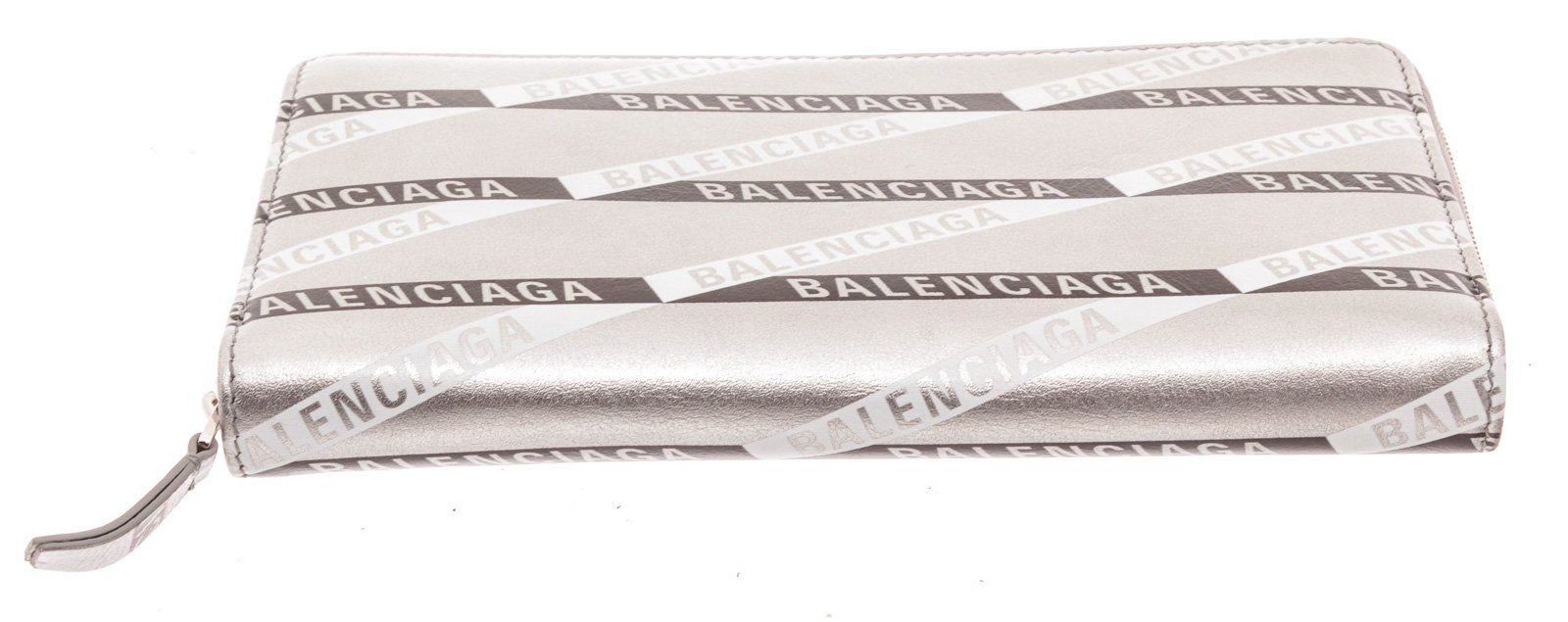 Balenciaga Silver Leather Zippy Wallet with silver-tone hardware, grey Arena leather lining, four interior compartments; one with zip closure, 12 card slots and zip-around closure. Measurements: Length: 7.25 in / 18 cm Width: 1 in / 3 cm 3.75 in / 1