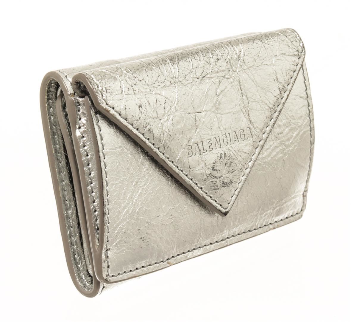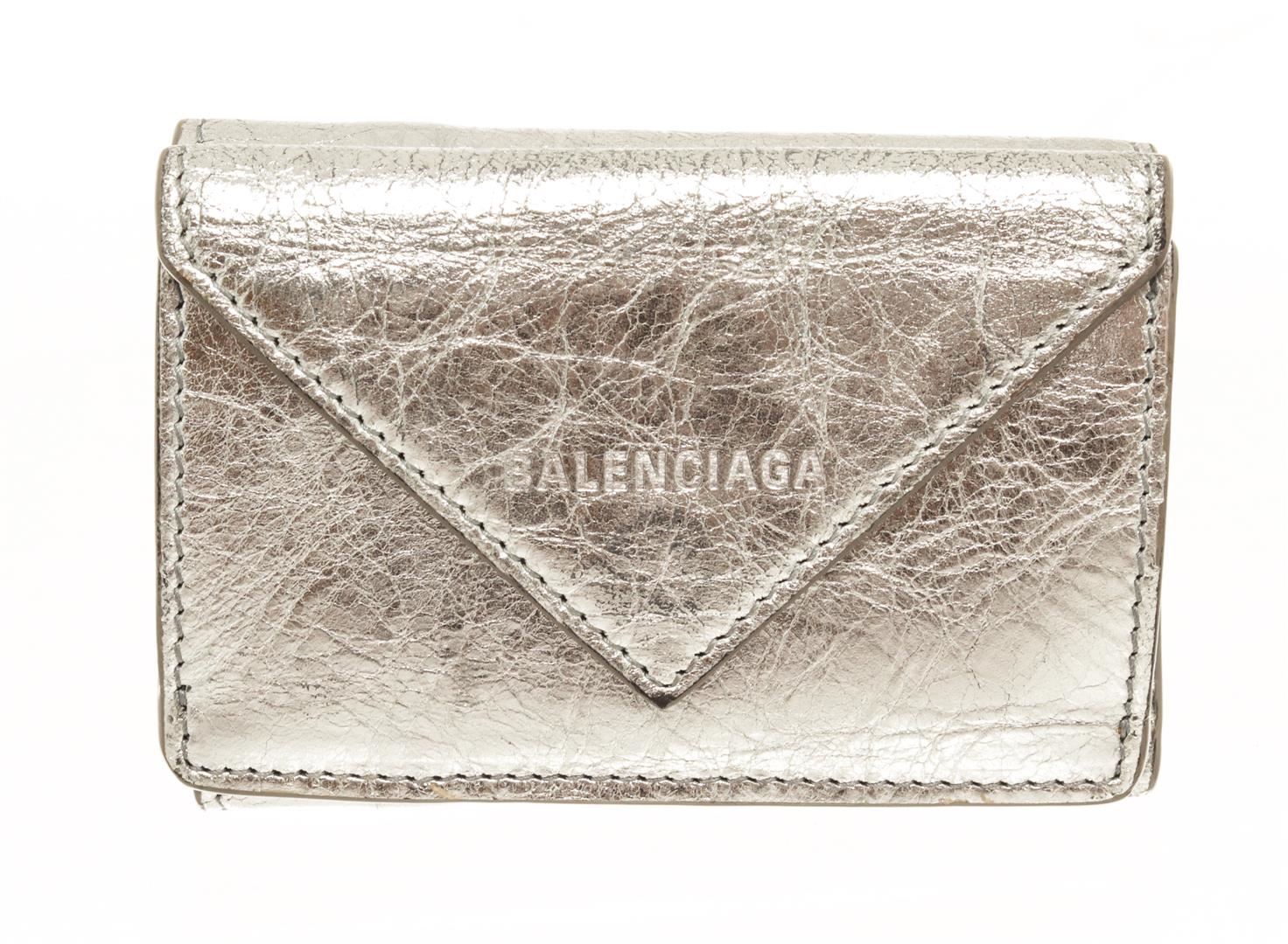One Balenciaga Silver Papier Flap Mini Wallet. Item is sold AS-IS. All available information is listed in the description and shown in the photo. Balenciaga Silver-toned Papier flap mini wallet features an envelope style with a leather exterior with an embossed logo, a fold-over top with snap closure, and two compartments: one for coins or miscellaneous and one for cash.