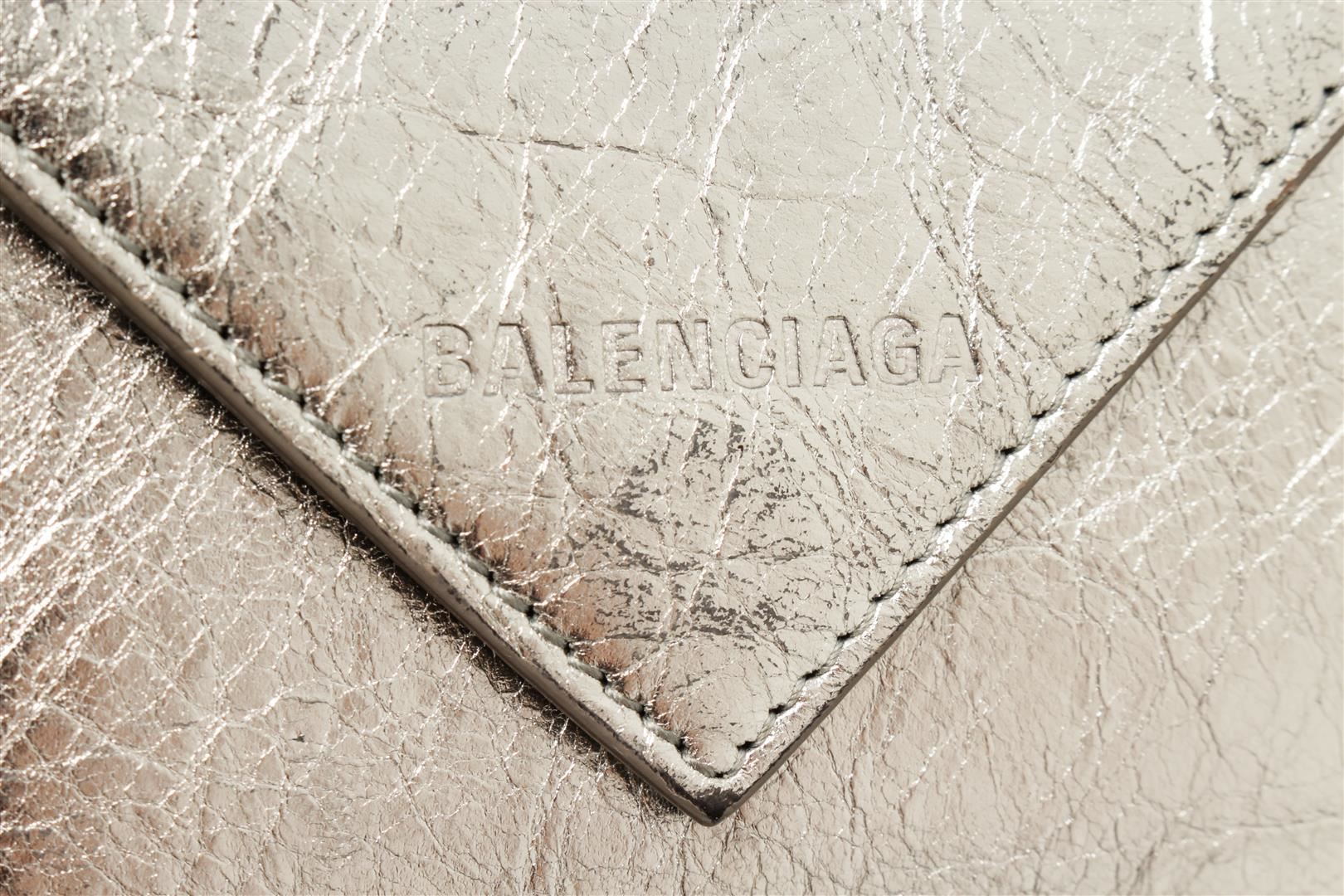 One Balenciaga Silver Papier Flap Mini Wallet. Item is sold AS-IS. All available information is listed in the description and shown in the photo. Balenciaga Silver-toned Papier flap mini wallet features an envelope style with a leather exterior with an embossed logo, a fold-over top with snap closure, and two compartments: one for coins or miscellaneous and one for cash.