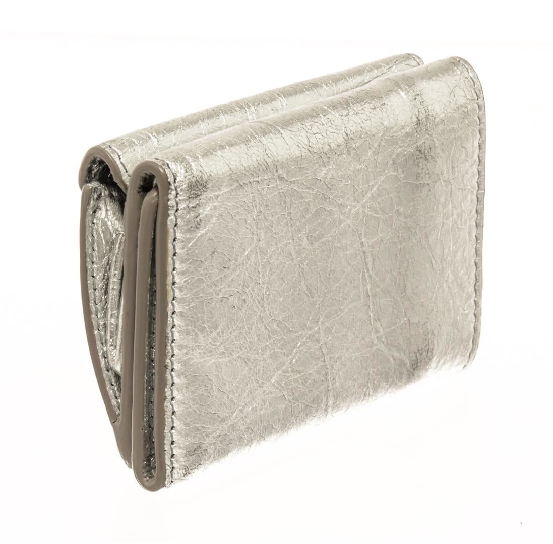 One Balenciaga Silver Papier Flap Mini Wallet. Item is sold AS-IS. All available information is listed in the description and shown in the photo. Balenciaga Silver-toned Papier flap mini wallet features an envelope style with a leather exterior with an embossed logo, a fold-over top with snap closure, and two compartments: one for coins or miscellaneous and one for cash.