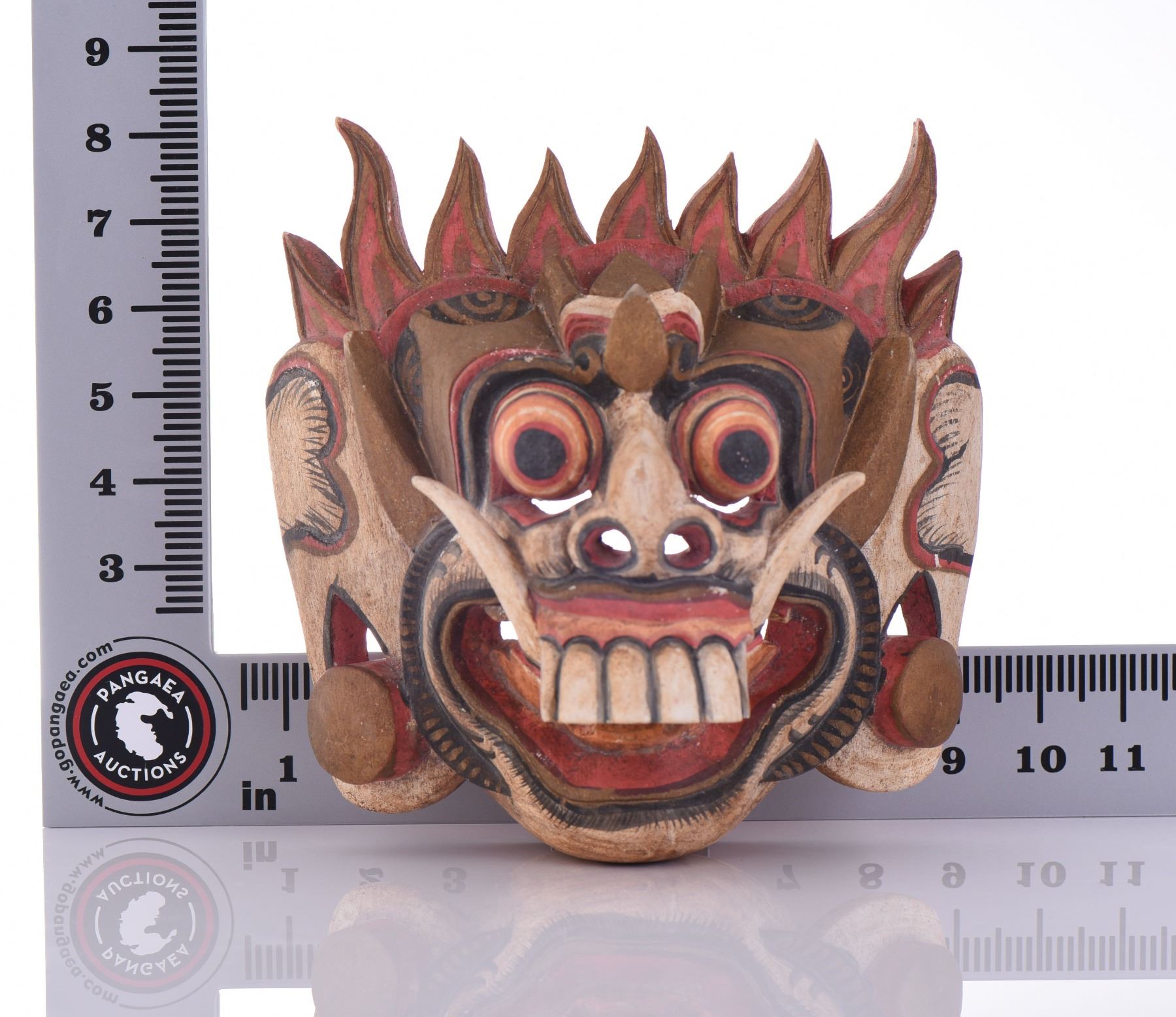 Balinese Barong Mask, Hand Painted Wood Carving. Estimated more than 50 yrs. old. Indonesian art consists of various artistic expressions and artworks of the archipelagic nation of Indonesia. It includes both age old art forms and recently developed contemporary art. Indonesian arts have experienced foreign exposures and influences most notably from India, Arabia, China and Europe. The nation consists of 13,466 islands where 922 are permanently inhabited by over 300 ethnic groups speaking more than 700 living languages. Wood and stone sculpting tribal art has flourished within the culture of Nias, Batak, Asmat, Dayak and Toraja. Between 8th to 15th century, Javanese civilization has developed a refined stone sculpting art and architecture which was influenced by Hindu-Buddhist Dharmic civilization. The art of wood carving is quite well-developed in Indonesia and certain areas are well known for its refined wood carving culture in Jepara and Bali. Balinese painting tradition are notable for its highly vigorous yet refined intricate art which resembles baroque folk art with tropical themes. Modern Indonesian paintings were pioneered by Raden Saleh, an 19th century an Arab-Javanese painter renowned for his romantic-naturalistic work during Dutch East Indies period in Indonesia. Prominent Indonesian painters in 20th century includes Basuki Abdullah, Lee Man Fong, Ida Bagus Made, Dullah and Affandi. (Wikipedia) Size and/or Weight: See Measurement Photo. (Photos Represent The Lot Condition, Pangaea Auctions)