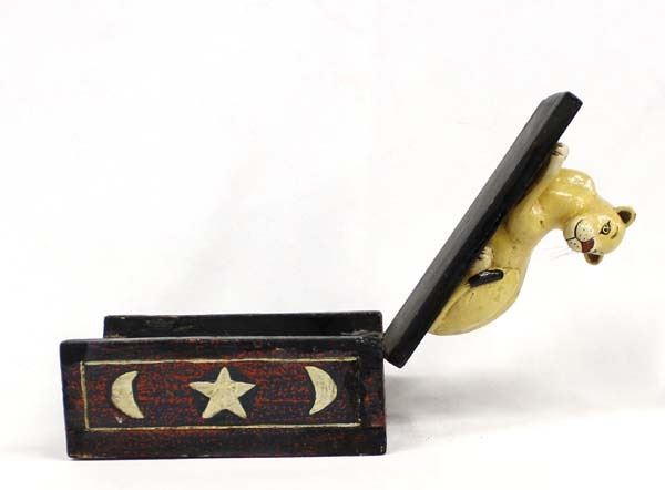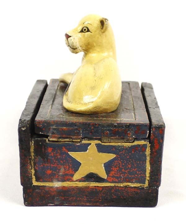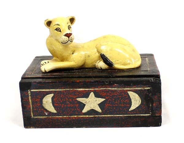 Balinese Hand Carved Wooden Lidded Box, has Mountain Lion sitting on top of lid, measures 5'' x 8'' x 6'', hinged lid