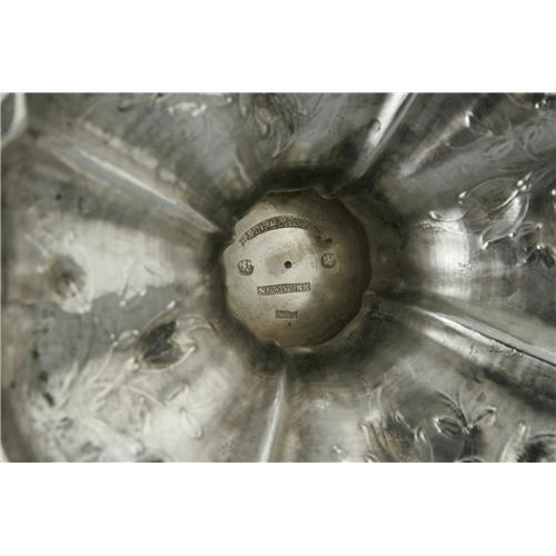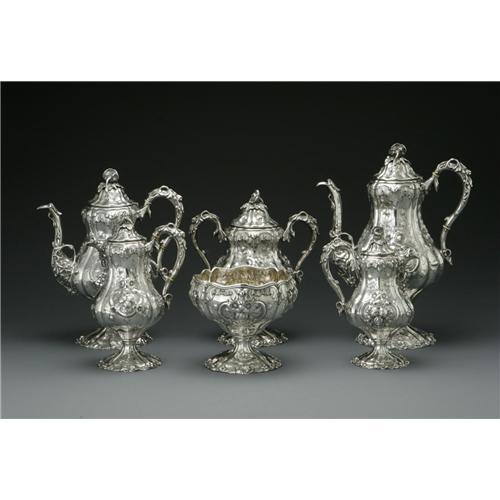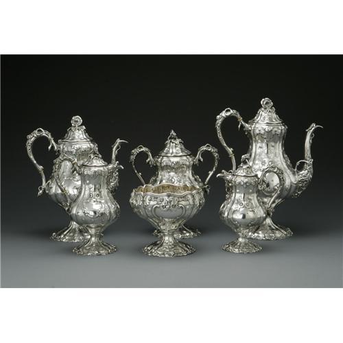 <B>An American Silver Tea and Coffee Service</B></I><BR>Ball, Black & Co., New York, NY, Mid to Late Nineteenth Century<BR><BR>The floral repousse set includes a coffee pot, teapot, two creamers, lidded sugar, a waste bowl and a silver-plate tray, all marked underside except the tray, total weight without the tray 150.4 Troy ounces<BR>The coffee pot: 12.5in. high; The tray (not imaged): 30.2in. long x 19.7in. wide