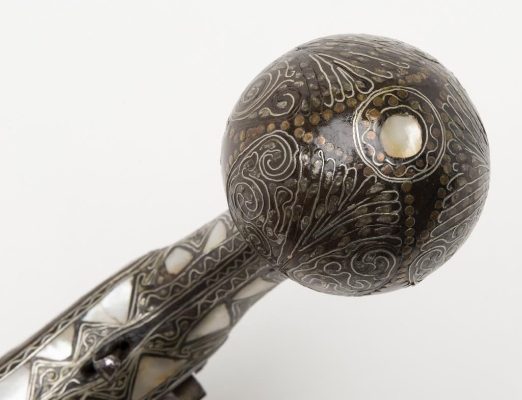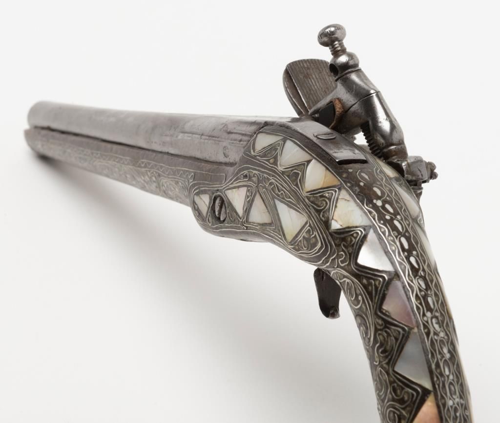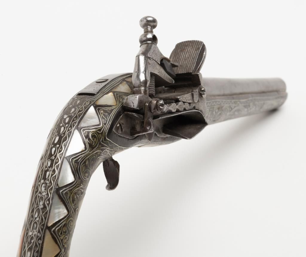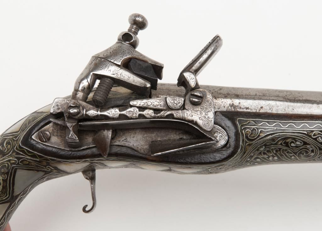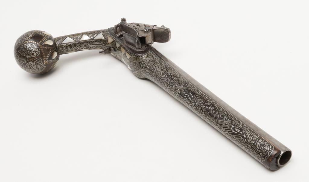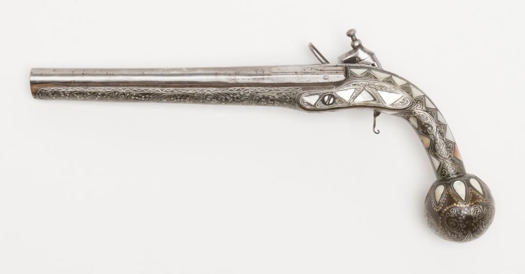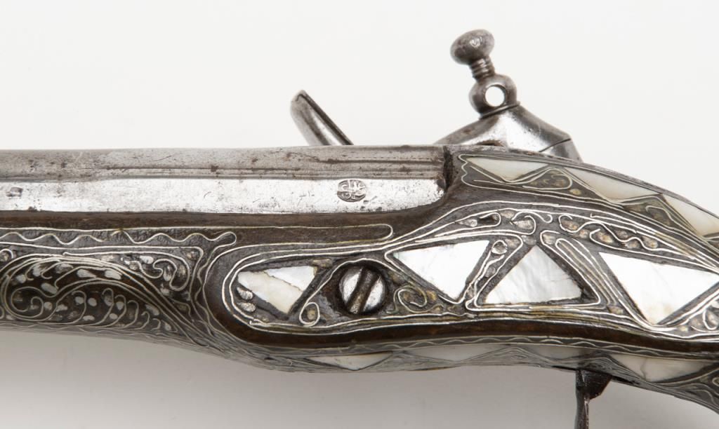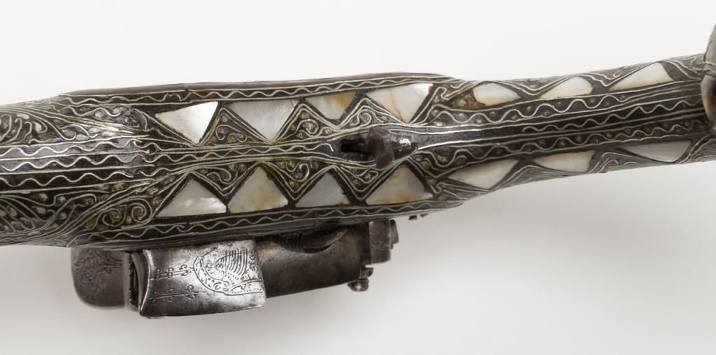 Ball Butt Miquelet Pistol, approximately .60 caliber. The pistol is in overall good to very good condition with a 10 ½” barrel and 13” overall length. The full length wood stocks are dramatically decorated in Mother of Pearl inlayand fine silver wire, ending in a large, circular butt. The Miquelet action is lightly engraved in a floral scroll and the barrel retains a proof mark on the left side. The barrel appears to have been cleaned at some point, with light surfacerust and erosion present. A most ornate and decorative Baltic Miquelet. (Antique). Est.: $1,000-$2,000.