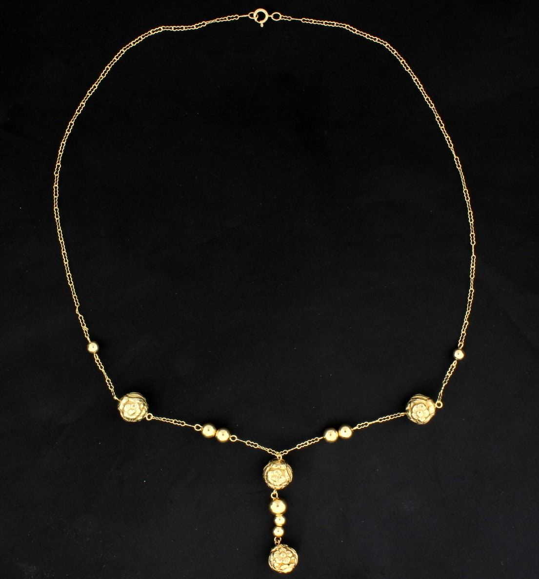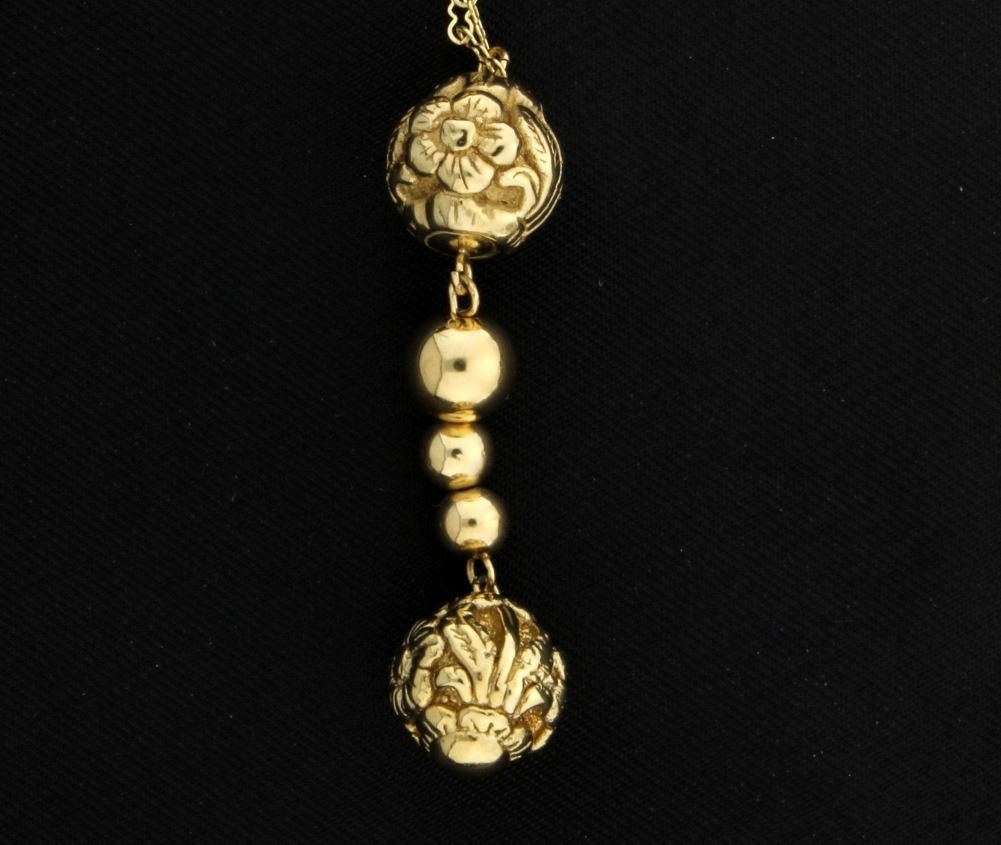 14K yellow gold the chain is 17.5 inches long with a 1.5 inch pendant on bottom. The balls have beautifully detailed flower design. 3.6g