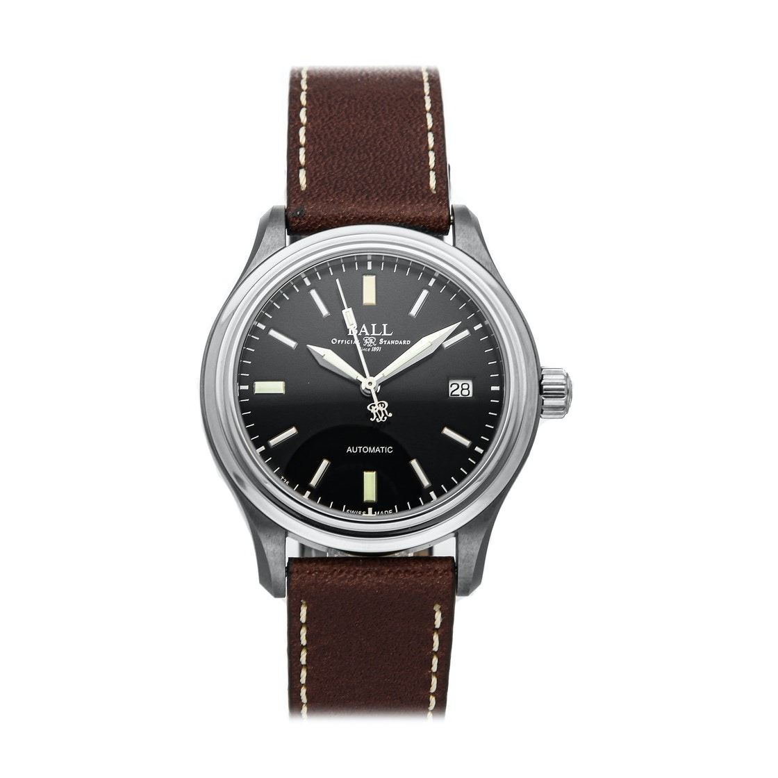 Pre-Owned Ball Watch Company Trainmaster NM1038DL5JBK) self-winding automatic watch, features a 38mm titanium case with a stainless steel bezel surrounding a black dial on a brown leather strap with a stainless steel tang buckle.