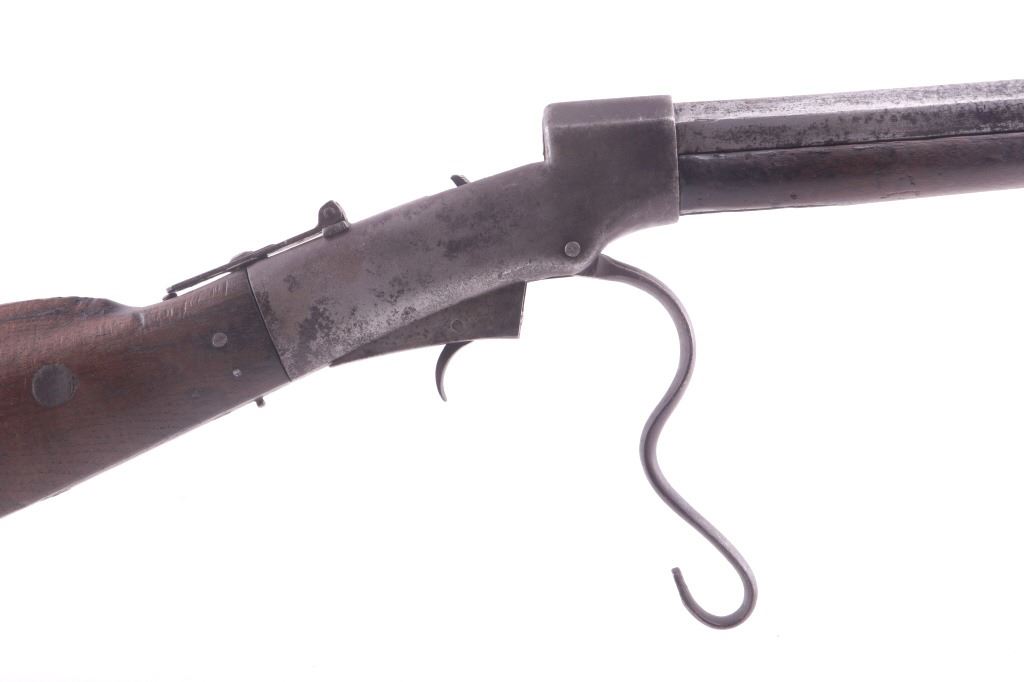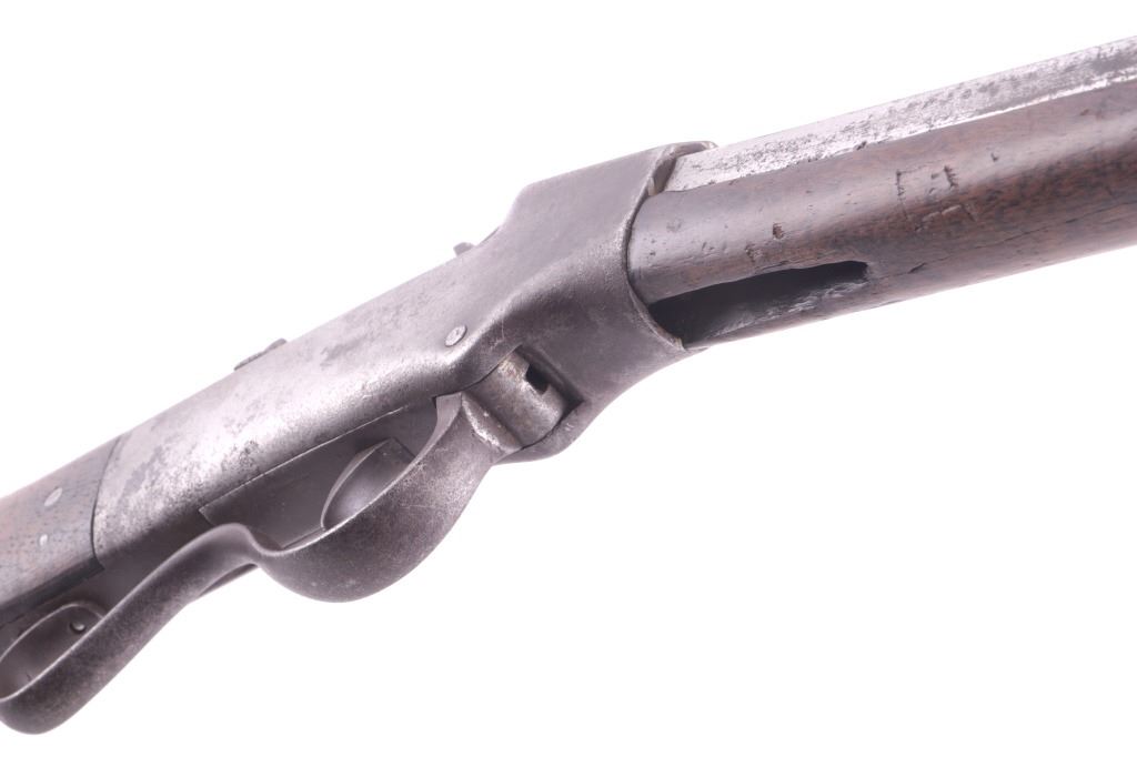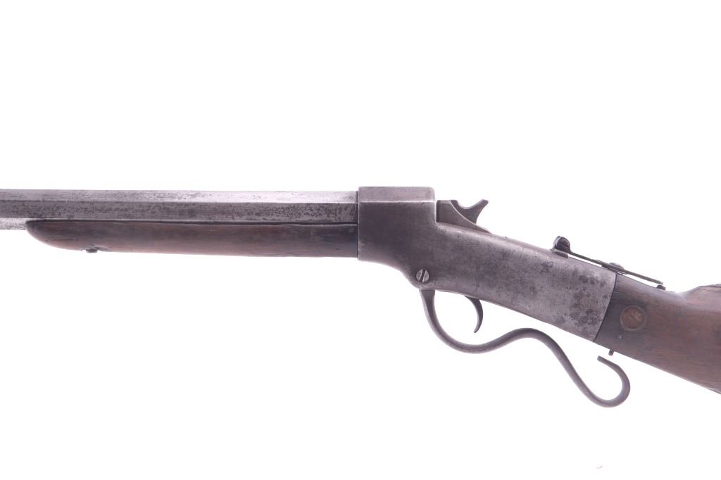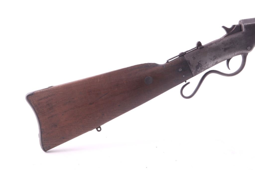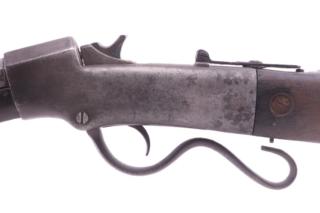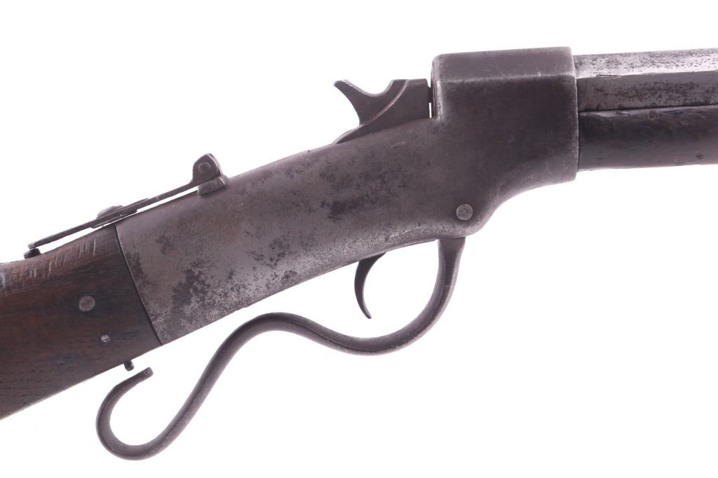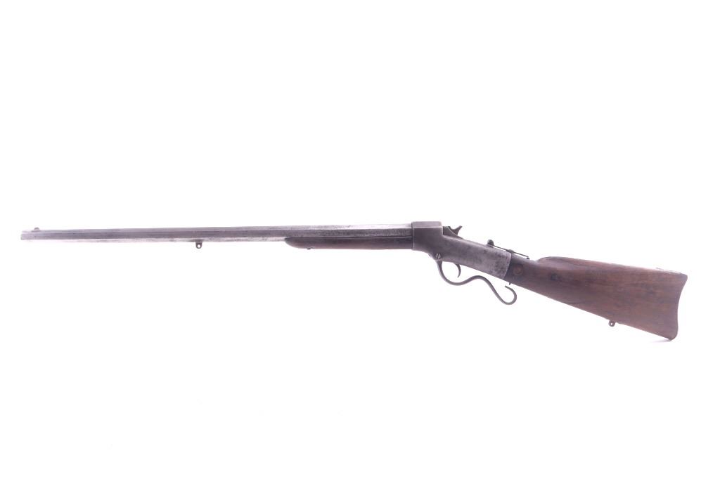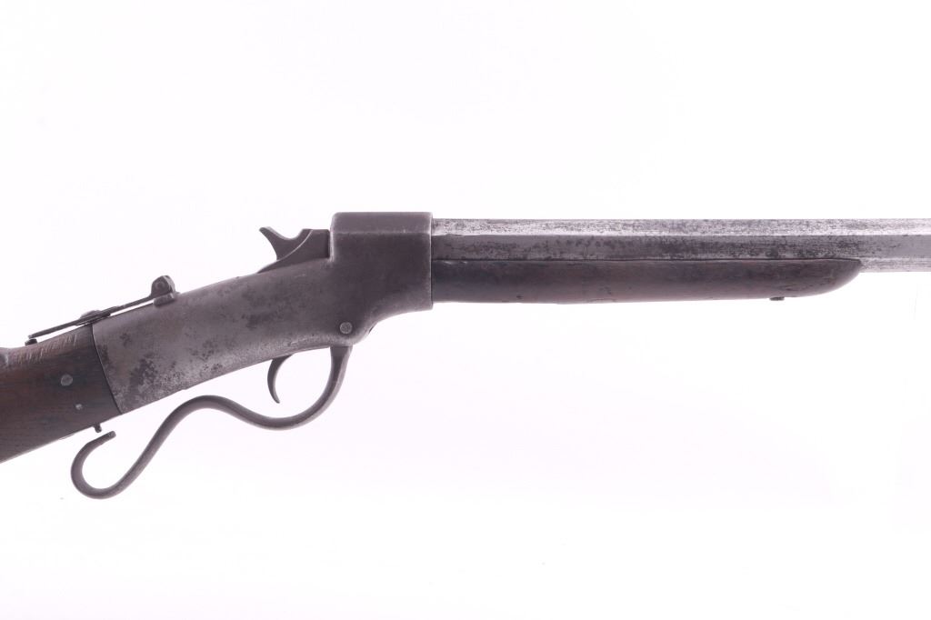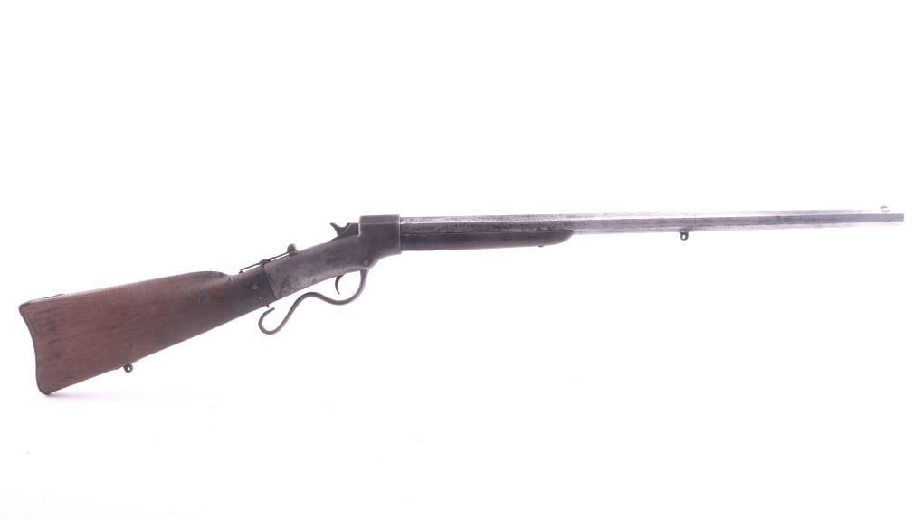 Featured in this lot is a Ball and Williams falling block single shot rifle chambered in .44 caliber. The Ballard design was one of the favorite long arms during the Civil War period, though production numbers do not necessarily reflect it. The original designer was Charles H. Ballard; his agents Merwin & Bray oversaw production between several different companies. It was a simple, single shot falling block action and was one of the early guns that would fire a metallic cartridge. This rifle has a 22 3/8" long octagon barrel with a brass blade front sight and grooved back sight. The top of the barrel is marked in faded lettering, reading "BALL & WILLIAMS WORCHESTER". The barrel shows a nickel finish with lines of pitting going down the barrel. The action functions as intended with tight lock up and the back half of the hammer filed down. Serial Number: 753. This firearm qualifies as an Antique and does not require FFL Transfer or NICS Background Check.