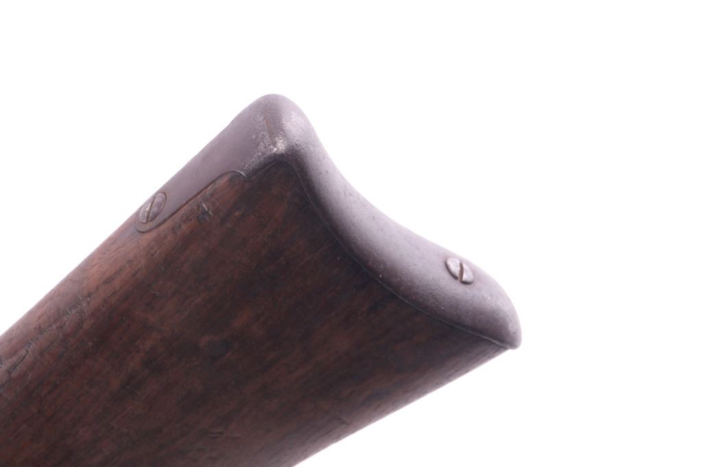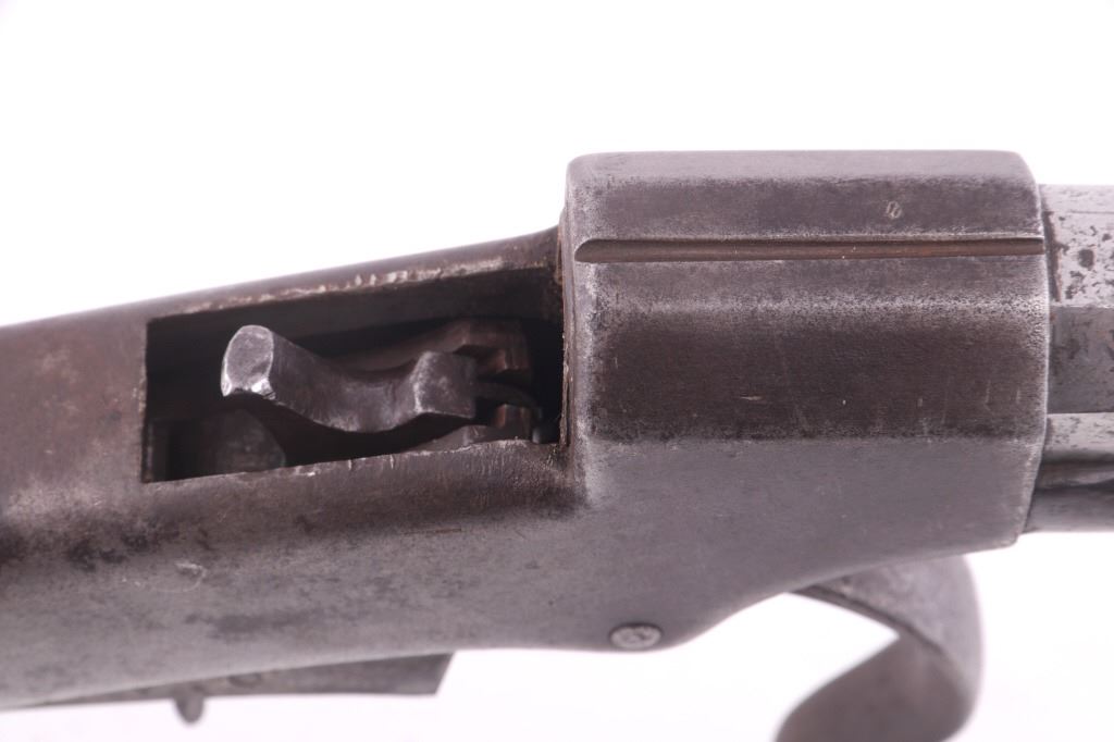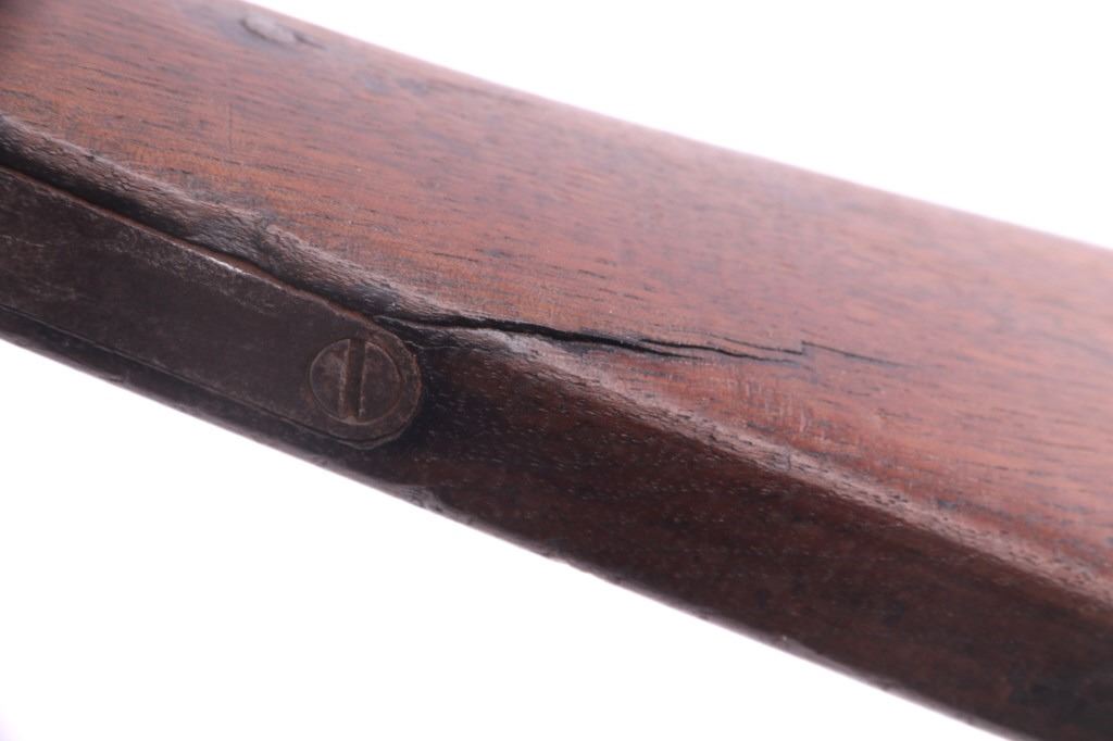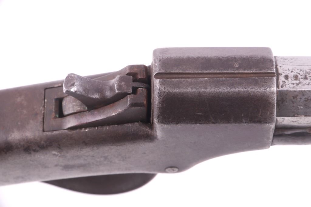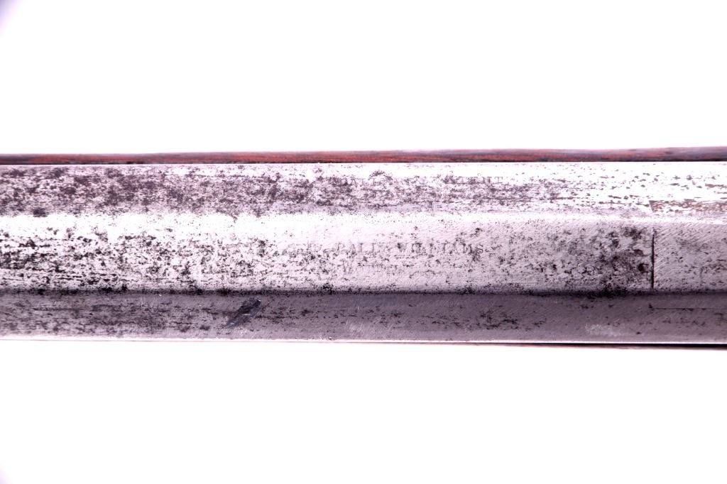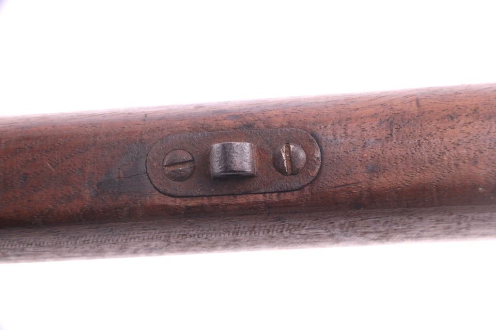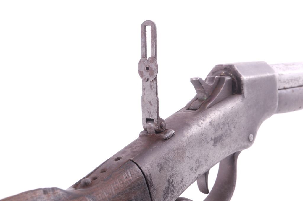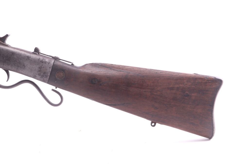 Featured in this lot is a Ball and Williams falling block single shot rifle chambered in .44 caliber. The Ballard design was one of the favorite long arms during the Civil War period, though production numbers do not necessarily reflect it. The original designer was Charles H. Ballard; his agents Merwin & Bray oversaw production between several different companies. It was a simple, single shot falling block action and was one of the early guns that would fire a metallic cartridge. This rifle has a 22 3/8" long octagon barrel with a brass blade front sight and grooved back sight. The top of the barrel is marked in faded lettering, reading "BALL & WILLIAMS WORCHESTER". The barrel shows a nickel finish with lines of pitting going down the barrel. The action functions as intended with tight lock up and the back half of the hammer filed down. Serial Number: 753. This firearm qualifies as an Antique and does not require FFL Transfer or NICS Background Check.