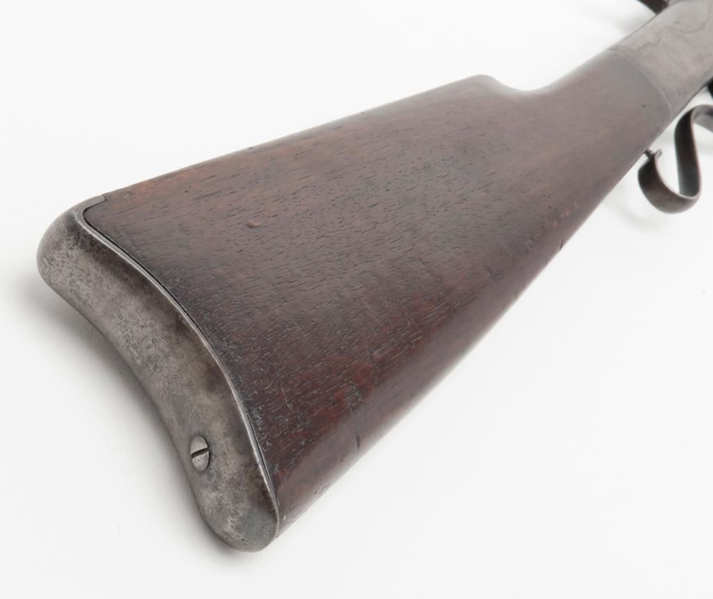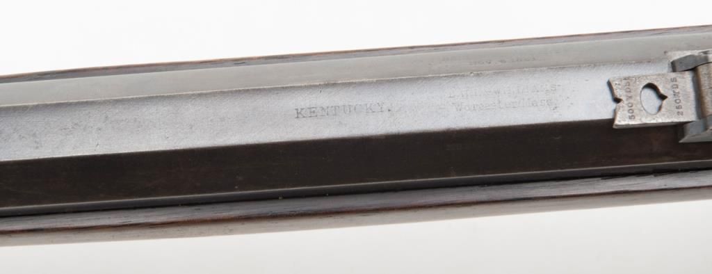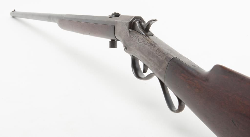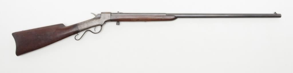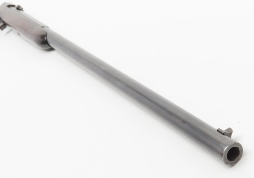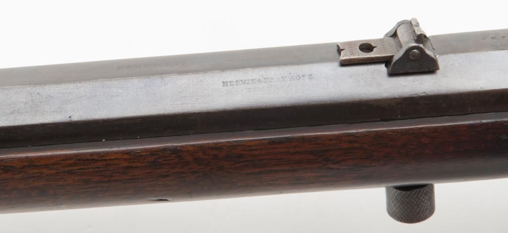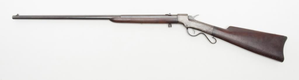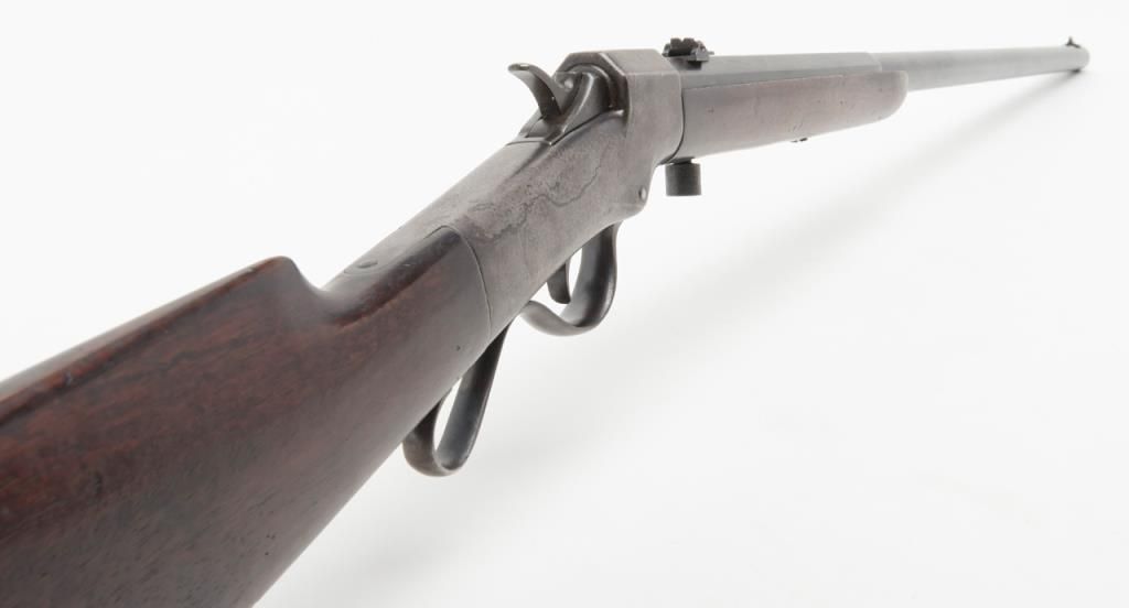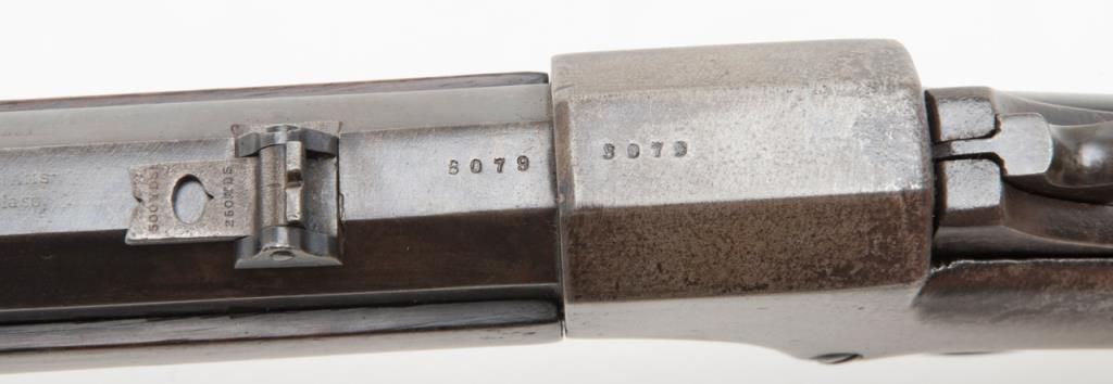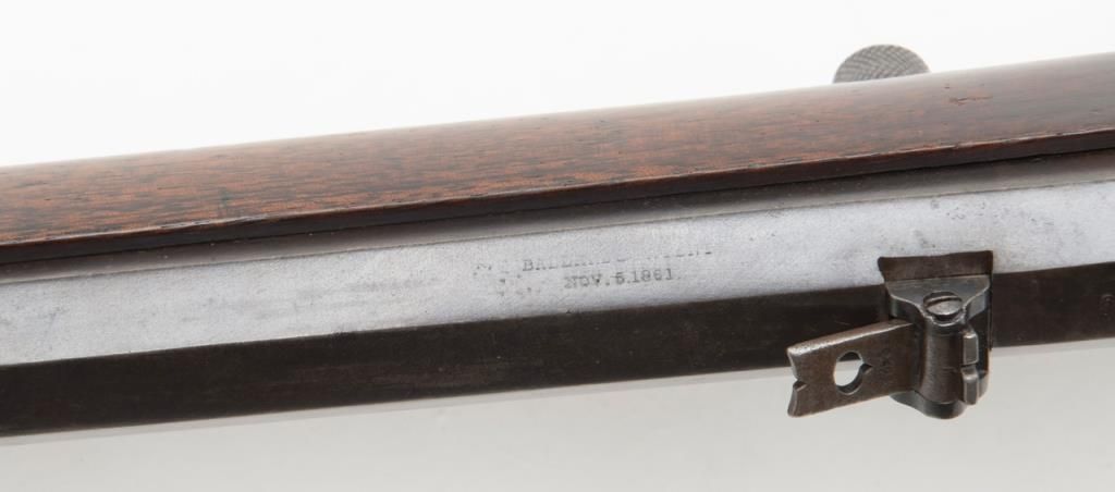 Ball & Williams Takedown single shot rifle, .45 caliber, Serial #8079. The rifle is in overall good condition with a 28 ½” octagon to round barrel. The barrel retains a significant amount of its thinning blued finish with sharp edges onthe octagon portion. The action has gone to a mottled grey patina with some blue in the protected areas. The smooth wood stocks are in very good condition with a half stock fore end, showing small mars and dents from use and acrescent metal butt plate. The rifle is built on an early pre-Marlin Ballard action and purported to be of limited production with the half stock fore end. The bore is good, action crisp and markings legible on this rifle. (Antique). Est.: $200-$300.