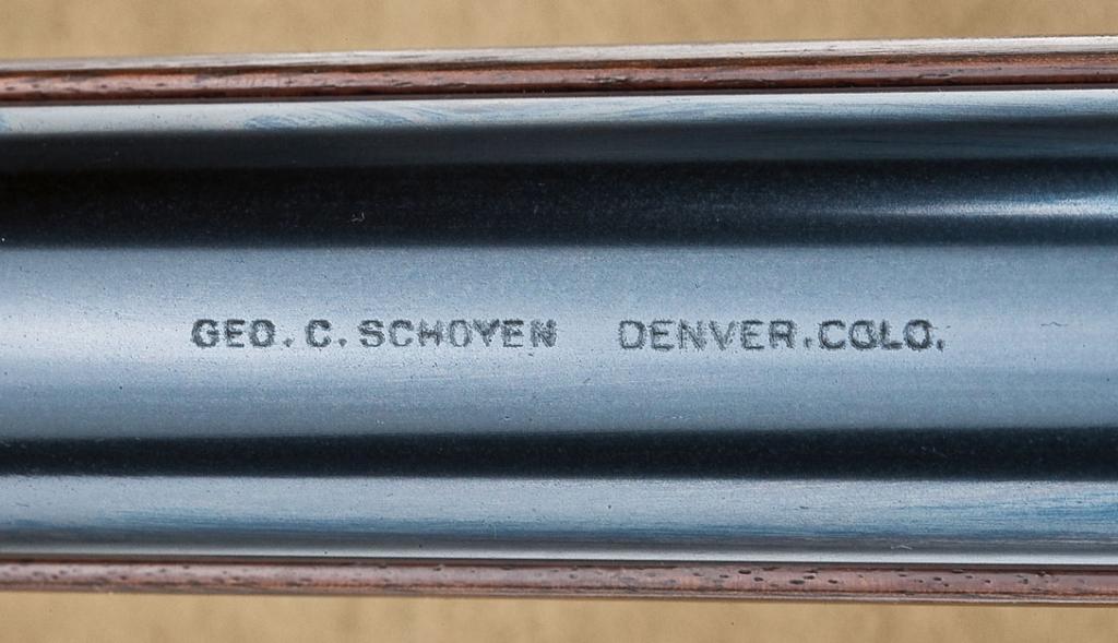 Ballard action custom target rifle, signed “Geo. C. Schoyen Denver, Colo”, approx. 28-1/4” heavy round barrel, .38-55 caliber, blue and case hardened finish, double set triggers, custom lever with wood insert, Schuetzen style stock and buttplate, palm rest of Schoyen type serial numbered to match. Weight is approx. 14lbs. The rifle shows 90-95% blue and case hardening applied at time of customization, with some drifting to the case hardening. The stocks are very good, showing a light old refinish and are still sharp. The butt plate and palm rest show 95% of a darkened old silver plate. The barrel is mounted with modern type blocks for a scope. There are a set of tap holes with tap screws and evidence of an earlier scope. The action is tight, the bore is near excellent. There is a bolt at the center of the frame, probably for setting the barrel, and probably of Schoyen design as it is also silver to match. Est.: $3,000-$6,000.