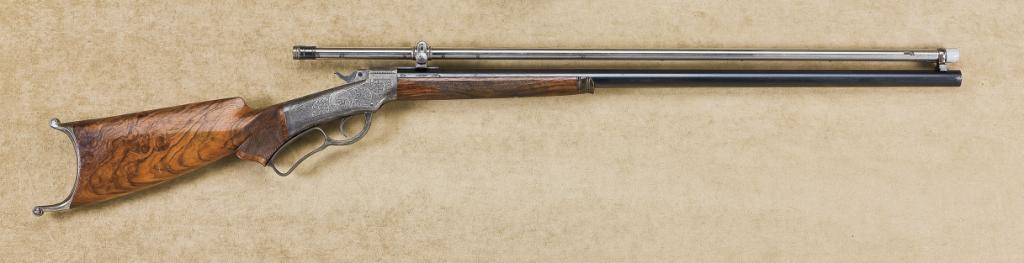 Ballard model 6-1/2 .38-55 caliber single-shot “Off-hand” rifle with Rigby barrel, period or factory mounted full-length Malcolm scope, finely Ulrich-style engraved, checkered select walnut stock with larger finger loop, nickeled Swiss butt, serial number “28159” with matching numbers on the barrel. The rifle remains in fine to near excellent original condition showing 90-95% original blue finish on barrel, some slight thinning and normal age just starting. The frame shows 50-70% case hardening drifting to silvery grey with some light case colors mixed in. The varnished wood stocks are very good plus with sharp checkering, some minor storage marks, scratches, light wear at the edges, and even loss to the varnish which now is about 50-60%. The buttplate shows 30-40% nickel, with the balance drifted an even patina. The nickel plated Malcolm scope is in near fine condition, showing 90-95% plus original nickel, bright blue on the iron mounts, with period mounts at front and rear. The scope is nicely engraved “W.M. Malcolm Syracuse NY” on the ring, shortly in front of the mount. The optics are clear and good. The action is tight, the bore near excellent. The engraving is of a high quality and shows a portrait of a doe on the left and a bear on the right. This Ballard is similar to the exampled pictured on the cover of the book Ballard, The Great American Single Shot Rifle by John T. Dutcher. Est.: $7,500-$15,000