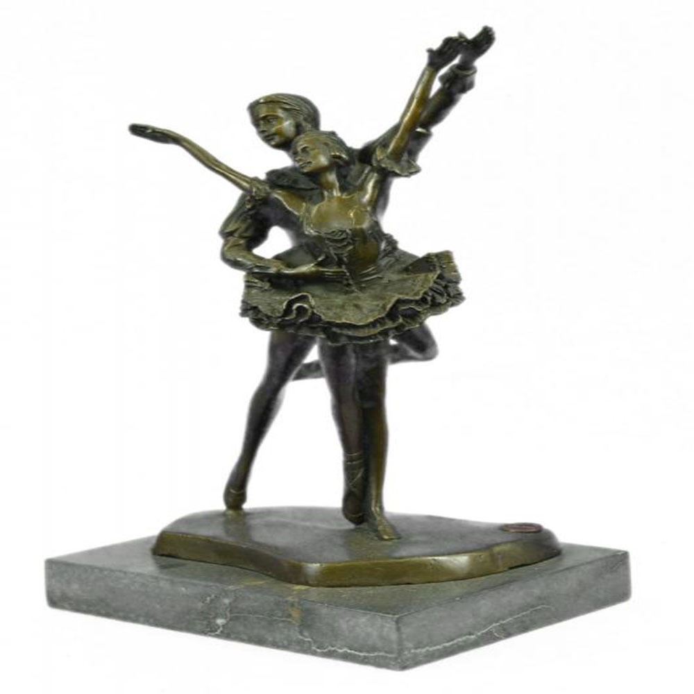 This graceful couple takes the stance in unison to impress the audience. They dance so beautifully and elegant as his right arm holds around her stomach. Both her arms are lifted up while his left arm pairs up next to her left arm. Her left leg wraps behind his legs, their ballet outfits are astonishing in details. Everything screams ballet with these two gorgeous duets, from their shoes to their tights to their gestures. They stay focused and balanced at all moments. This delicate figure was molded using the lost wax method of casting and finished with a brown patina tarnish and flits upon a marble base. Bronze Dimensions with Marble Base: Height 12 X Width 7 inches. Weight: 10 LBS.