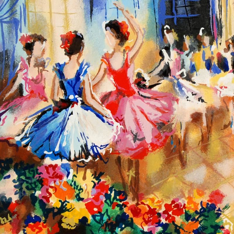 Michael Rozenvain's remarkable art piece is full of rich color and entertaining artistry! "Ballet Studio" is a limited edition serigraph on paper, hand signed by Rozenvain! Includes Certificate of Authenticity! Measures approx. 20" x 16" (with border), 17" x 13.5" (image).