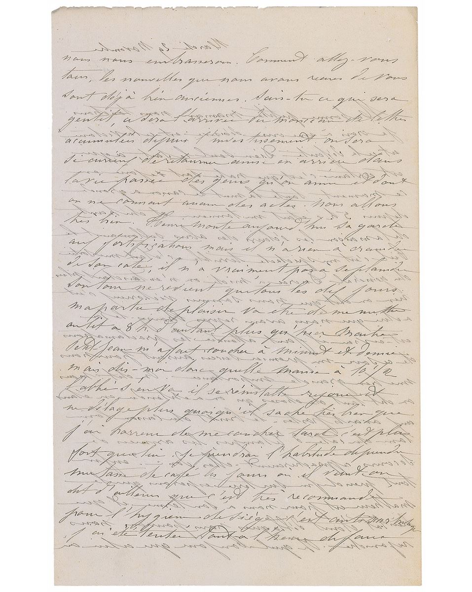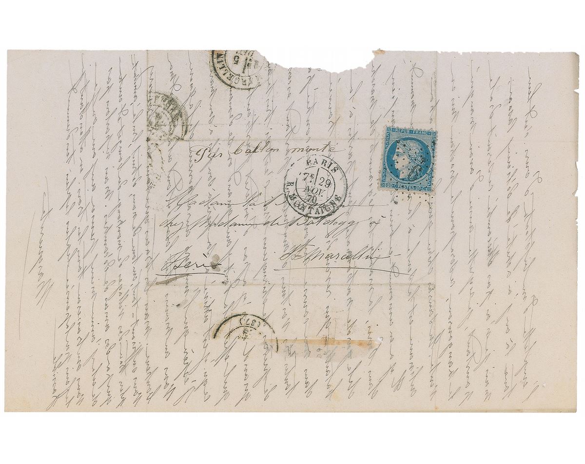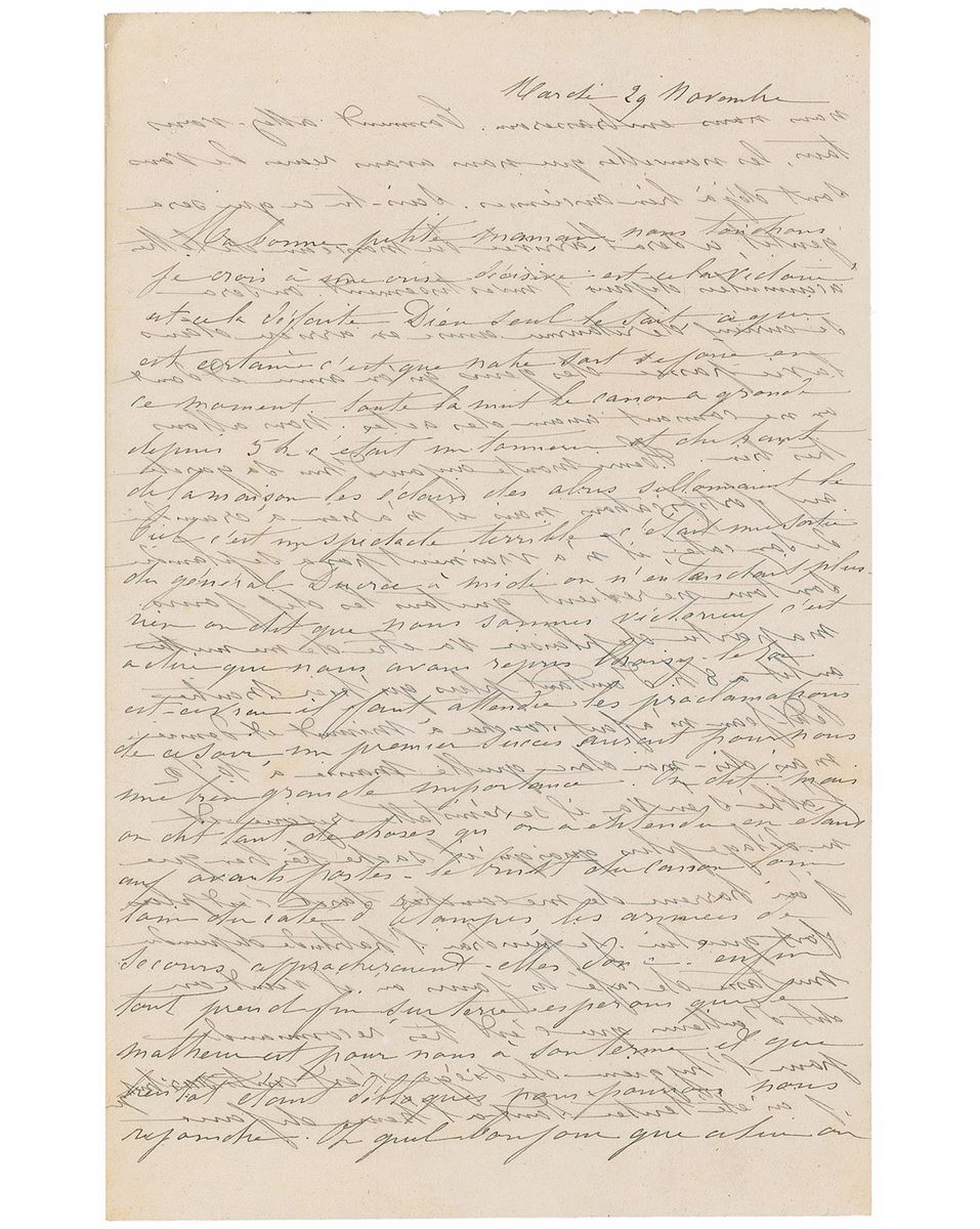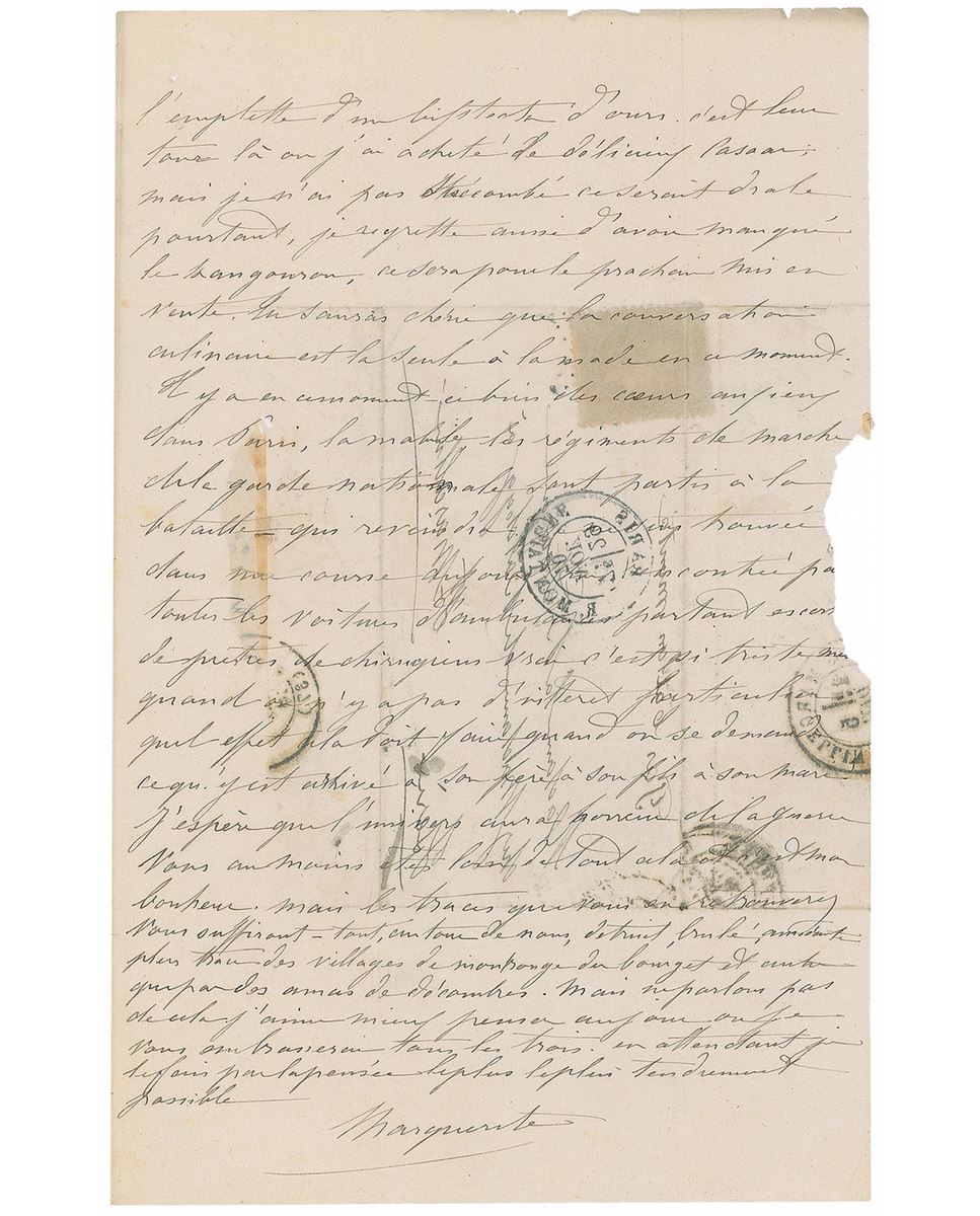 ALS in French, signed “Marguerite,” three pages on two adjoining sheets, 5 x 8, November 29, 1870. Untranslated letter providing a vivid account of the situation in the starving city of Paris after ten weeks of siege by Prussian forces, which ultimately led to French surrender in the Franco-Prussian War. The address panel on the reverse of the last page has a note, “par ballon monté,” and is postmarked with the date of departure from Paris, November 29, and date of arrival in Saint Marcellin, December 5. Show-through from writing to opposing sides and paper loss to the edge of the last page from seal removal affecting a few words, otherwise fine condition. Used as an early airmail service, balloons were the only means of communication from within the besieged city of Paris to the rest of France. About sixty-five of these trips were made, nearly all arriving at their intended destination. The phrase “ballon monté” penned on the address panel indicates that it was to be carried by a manned balloon, versus an unmanned one.