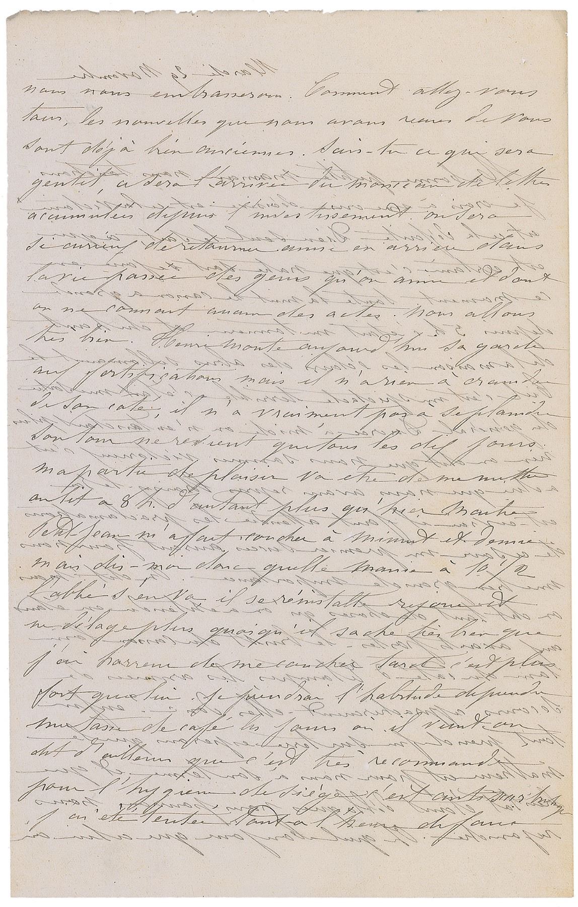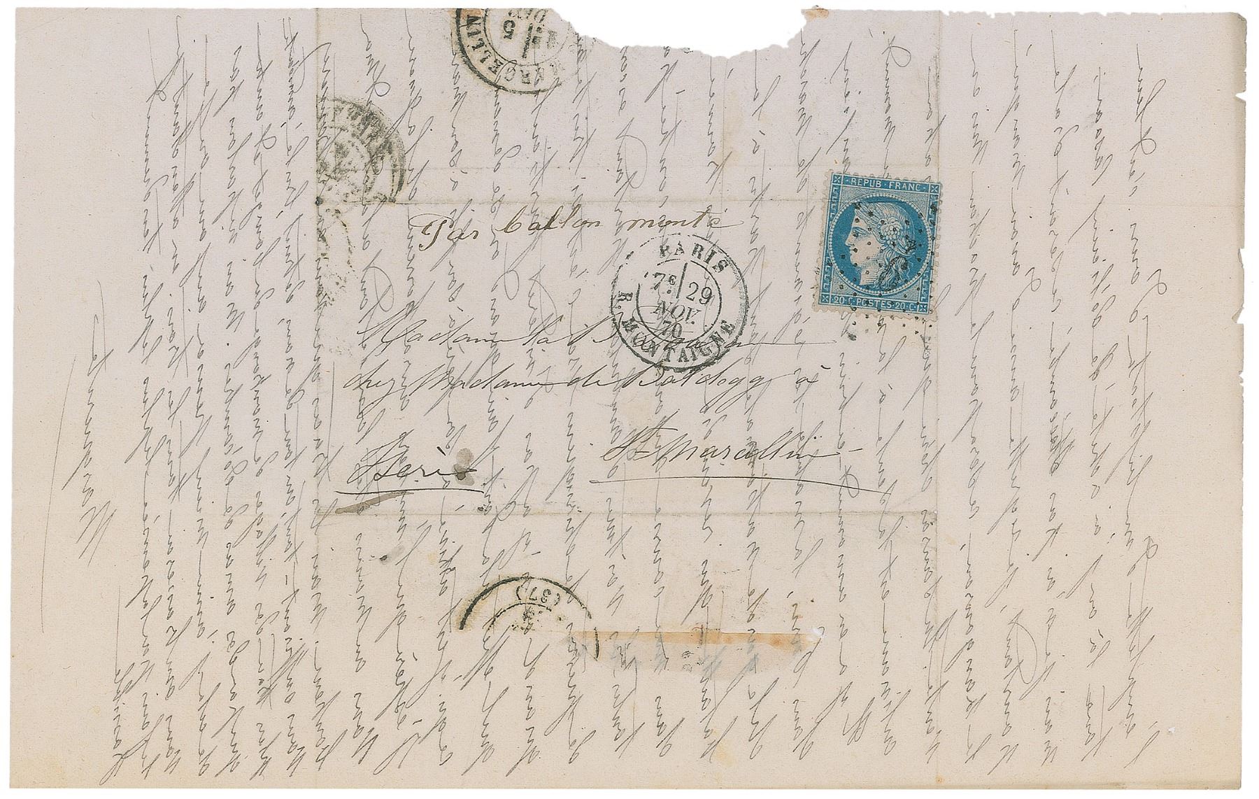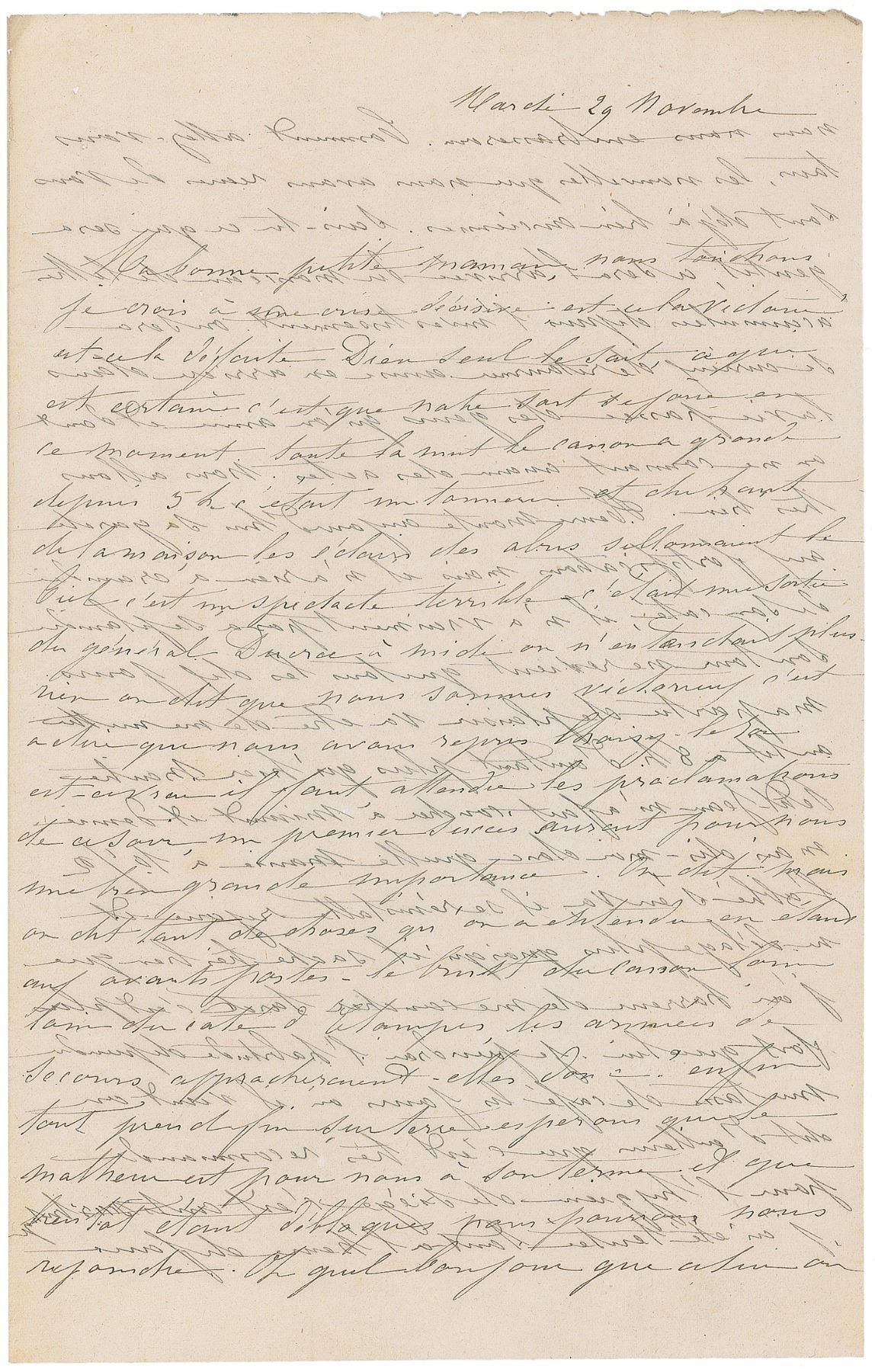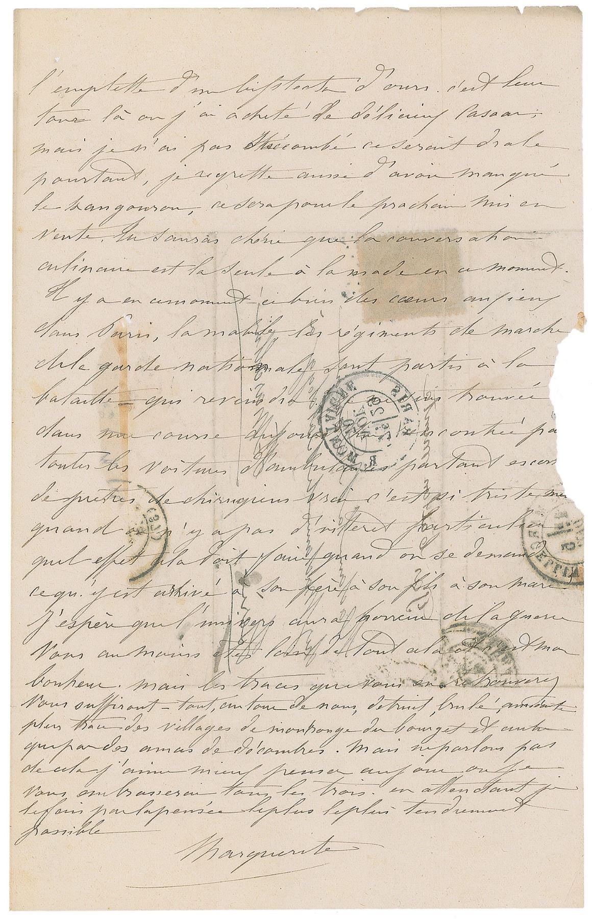 ALS in French, signed "Marguerite," three pages on two adjoining onionskin sheets, 5 x 8, November 29, 1870. Untranslated letter providing a vivid account of the situation in the starving city of Paris after ten weeks of siege by Prussian forces, which ultimately led to French surrender in the Franco-Prussian War. The address panel on the reverse of the last page has a note, "par ballon monté," and is postmarked with the date of departure from Paris, November 29, and date of arrival in Saint Marcellin, December 5. Show-through from writing to opposing sides and paper loss to the edge of the last page from seal removal affecting a few words, otherwise fine condition. Used as an early airmail service, balloons were the only means of communication from within the besieged city of Paris to the rest of France. About sixty-five of these trips were made, nearly all arriving at their intended destination. The phrase "ballon monté" penned on the address panel indicates that it was to be carried by a manned balloon, versus an unmanned one.