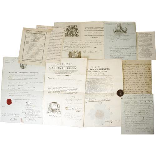 <B>Ballooning Archive.</B></I> An amazing archive of early flight related to Paulo Andreani, who is documented as making the first self feed balloon ascent. Included in the archive is a detailed letter that may indeed change history. Andreani discusses a flight in 1774, pre-dating Montgolfiers supposed first flight by nine years. The flight may have been botched, but it was a flight nonetheless. The letter is written on plain paper, in Italian, and the translation reads: "D. B. Dear Brother I come to Milan very quickly for two hours only, and at this moment I am coming back to your country of Moncucco. Today we have decided to make another temptative of flight, before beginning to make some modification to the machine since it is absolutely certain that what happened yesterday evening was due to the irregular combustion and not to the necessary maneuvers. Please keep this news for you since there is not a secure probability of a good result. I wanted only to inform you just to don't give you a surprise in case of success. My compliments to my sister in law and many thanks to her and to M. Castelli for their fruitless deplacement. I embrace you. From the house of Cavalchina the morning of Tuesday at 18 hours. Paolo". On the verso reads: "Moncucco Tuesday 24th Feb. 1774". There is an announcement of a poem in honor of the "Courageous Don Paolo Andreani on the occasion of the celebrated cantate dedicated in his honor on the evening of Sunday March 1784 by the members of the Pius Association of Music", along with two booklets, which were extremely rare in those days. There are a diploma dated 1808 from the Arcadia Academy, and some passports from Italy, France, and Britain, issued to Andreani. Also included are two letters from friends of Andreani regarding life in Milan under Napoleon's rule. An incredible collection!<BR><BR><b>Shipping:</b> Books & Catalogs (<a target="_blank" href="http://www.heritageauctions.com/common/shipping.php">view shipping information</a>)