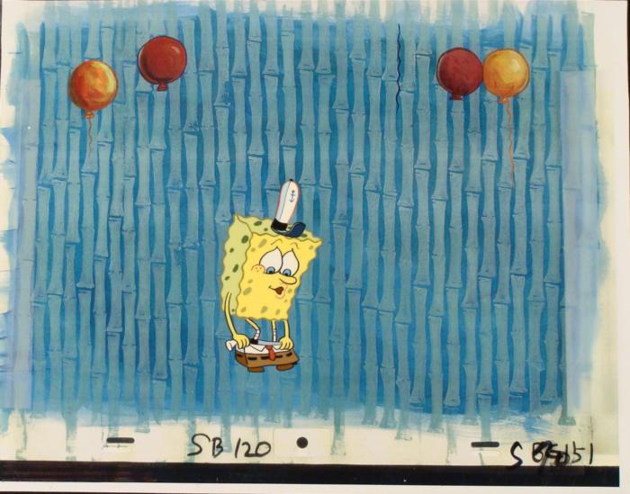 This animation cel and reproduction background are from the Nickelodeon TV show SpongeBob Squarepants. The story takes place under the deep blue sea in Bikini Bottom, where SpongeBob resides. SpongeBob, who is a yellow, porous sponge, is your typical happy-go-lucky character, as he is always cheerful and enjoys making people laugh. Patrick Star, SpongeBob's neighbor who is a starfish, is your average children's show idiot, as he boasts knowing nothing and is often getting himself into ridiculous situations. Between the homes of these two lies the home of the miserable Squidward, a squid, who is known for being grouchy and playing tricks on SpongeBob and Patrick. Both SpongeBob and Squidward work at the Krusty Krab, a fast food business run by the greedy money-loving Mr. Krabs, a crab, the arch rival of the evil, possibly misunderstood, Plankton. Another neighbor, Sandy Cheeks, an athletic squirrel who normally wears an astronaut's space suit, was introduced in "Tea at the Treedome." She spends most of her time inventing and experimenting. Why are there balloons in the background?Original Printed Background and Animated Cel Overall Size of Background: 10 1/2" x 17" Overall Size of the Cel: 10 1/2" x 12 1/2" Very good condition This is an original hand-painted cel set-up used in the production of an episode of "SpongeBob SquarePants." Each one-of-a-kind set-up represents a slight change in position of the characters. When individually photographed and projected in rapid succession, the images appear to move.