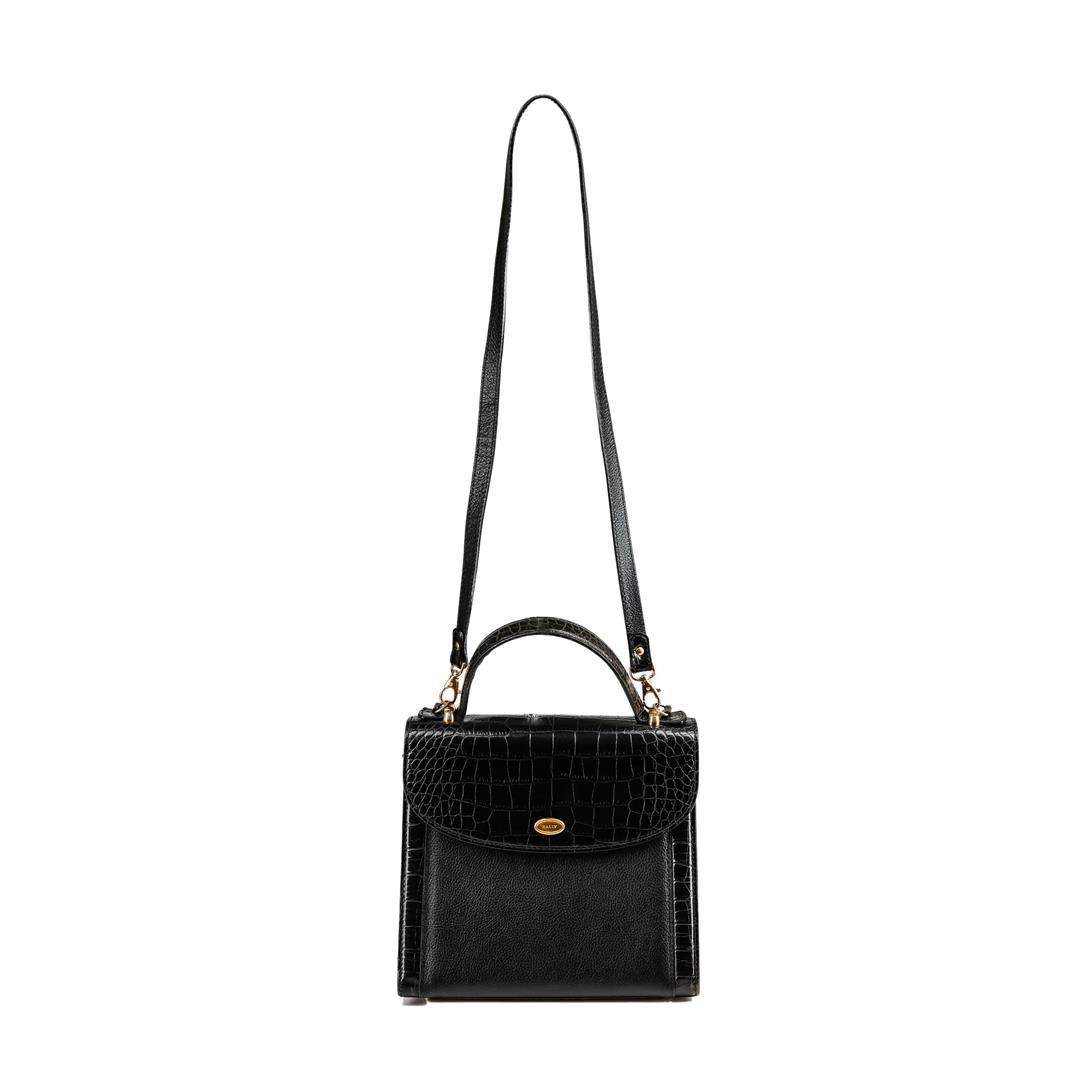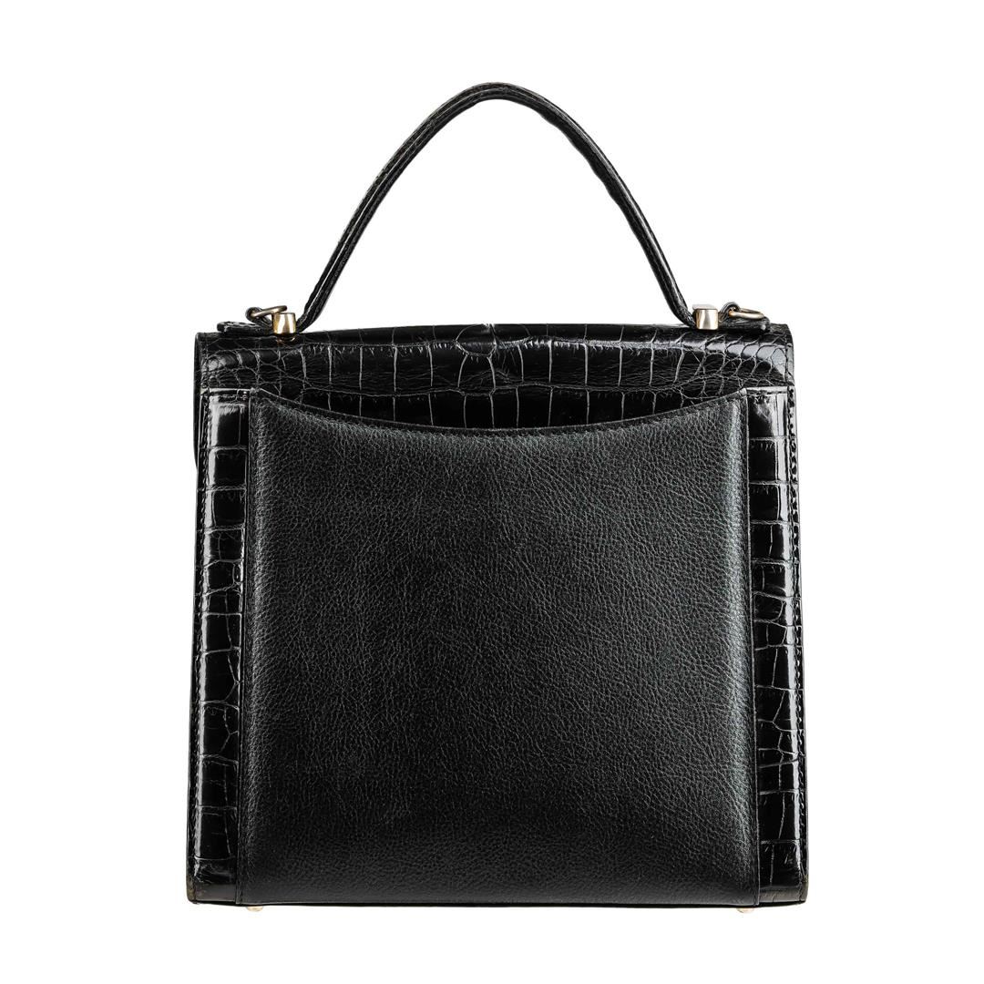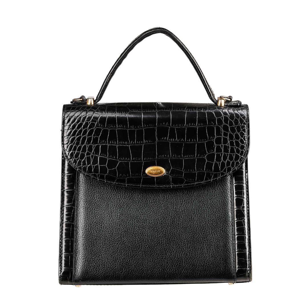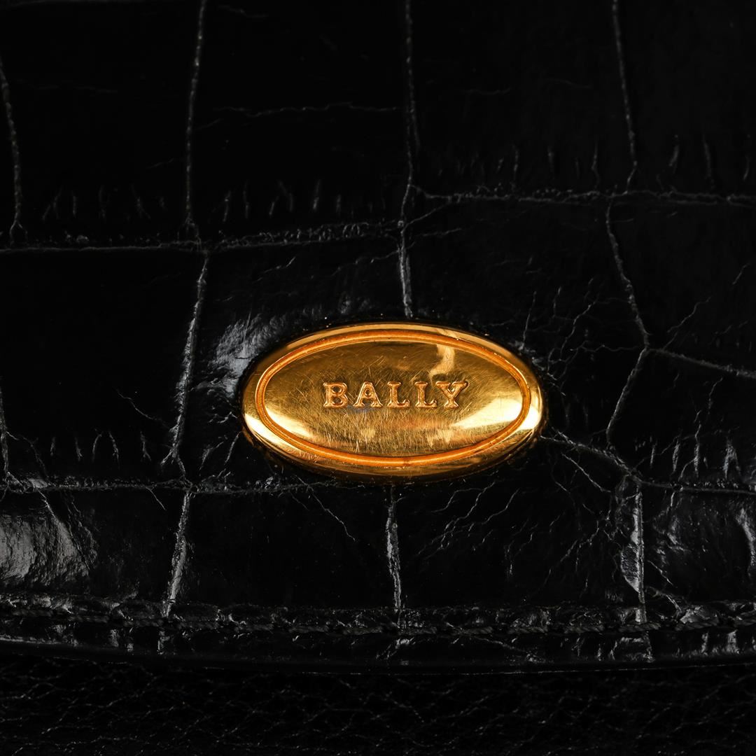 Authentic Black Bally handbag in black calf and crocodile leather with gold-tone hardware. This vintage handbag stands out with its tonal crocodile and calf leather trim, removable shoulder strap, top handle, exterior pocket at back, leather lined interior and single interior zip pocket. Made in Italy. This bag is pre-loved and shows some sign of wear including some scratches on the leather and the interior lining lifting. Please see photos.