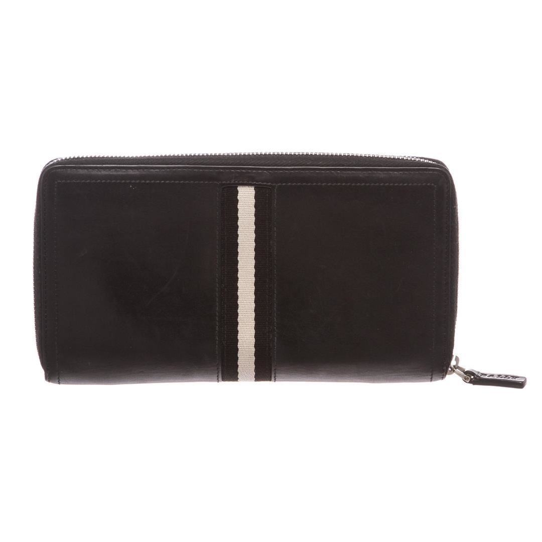 Black leather with strip accent feature. Overall zip-around closure. Interior is leather lined and contains multiple credit card slip pockets, two compartments with zipper pocket partition, two billfold slip pockets and a pen holder.