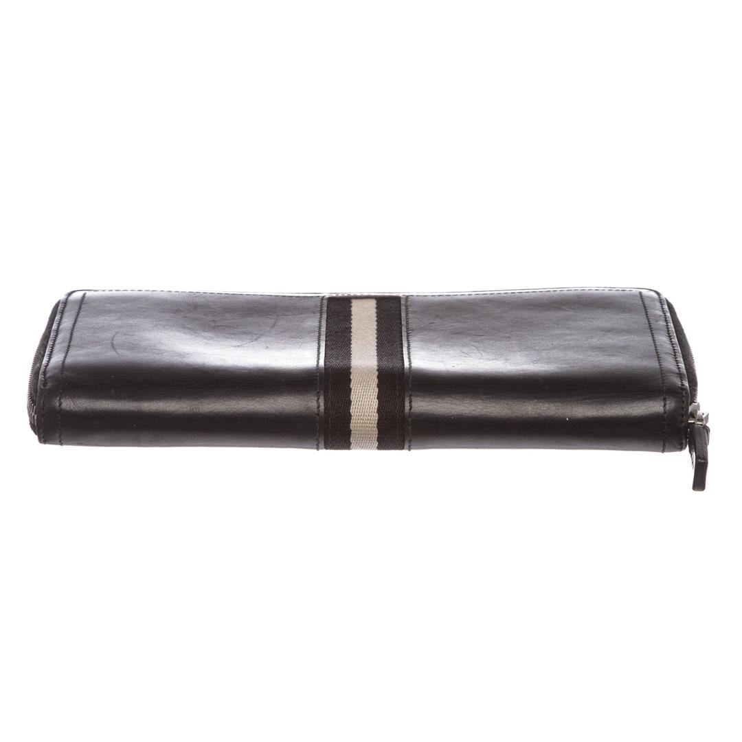 Black leather with strip accent feature. Overall zip-around closure. Interior is leather lined and contains multiple credit card slip pockets, two compartments with zipper pocket partition, two billfold slip pockets and a pen holder.