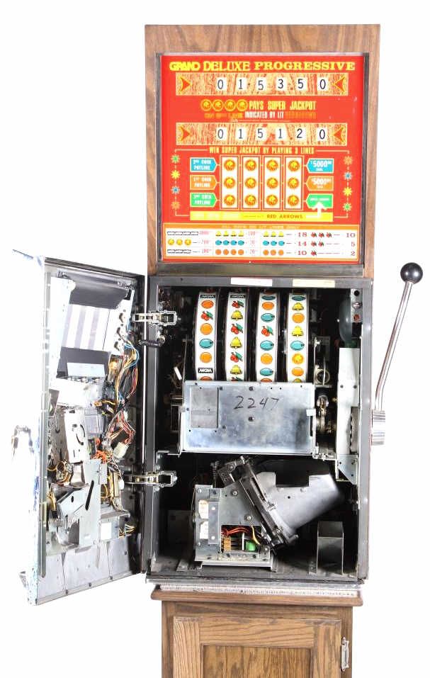 This is a 1982 Bally Grand Deluxe Progressive MGM four line slot machine. The machine takes $1.00 silver dollar and Ike dollar coins. The piece lights up and is believed to work. This shows overall good condition and comes with the wood base having chrome claw feet. This is manufactured more than 25 years ago and is legal to sell and own. Has Keys. Machine measures 23"x19.25"x45.5". Base measures with feet 19"w x 19"d x 33.5"t.