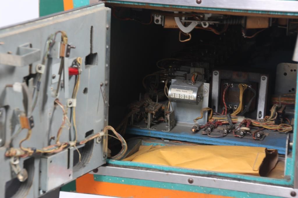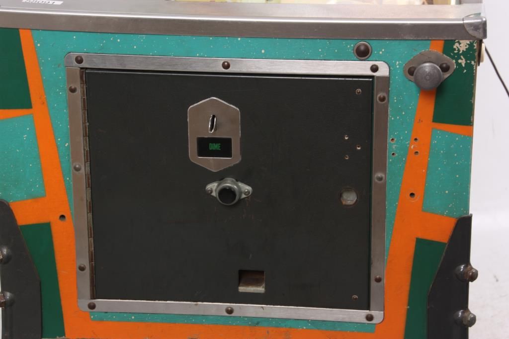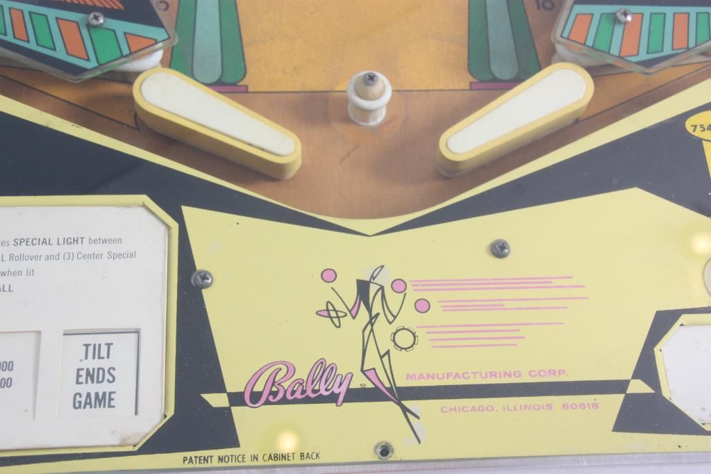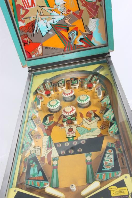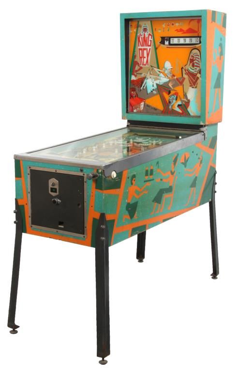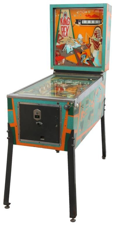 Bally King Rex Pinball Machine – 1970. A standard upright style case with an Egyptian theme; green, teal and orange painted wood case having hieroglyphics on the sides and a reverse painted light up display top section with reel style scoreboard, ancient Egyptian walking, an explorer and a modern Egyptian man; has individual lights for balls to play 1-5, Game Over & Tilt. The game board has an Egyptian theme with a fun series of light displays, targets and bumpers. The bumpers are in good shape with most of the rubber bands replaced; game is in running condition and set up for free play with the coin mechanism removed. Accompanied by the electrical blueprints and an selection of extra rubber bands. 69 in. high x 22 in. wide x 54 in. long.
