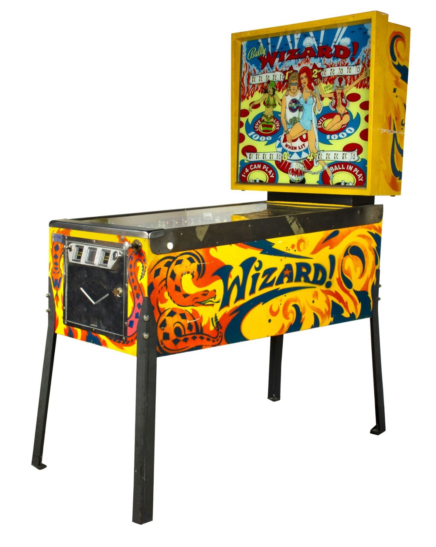 (Bally, 1975) An original "Tommy" Wizard pinball machine. This pinball machine comes from the collection of Bill Wallen, who helped create promotional and advertising campaigns for the film. According to Wallen, this machine was taken on a promotional tour to promote the theatrical release of the film and was later given to him as a gift for his contributions. The machine functions and plays nicely. Measuring approximately 52"x30" and 68" tall, the machine is in good working condition with some fading to the paint on the body, and general wear throughout as expected from use and age. The left side of the score cabinet has the high scores listed for Wallen's family on label-maker tape.